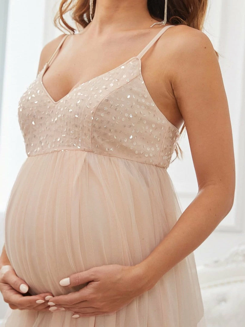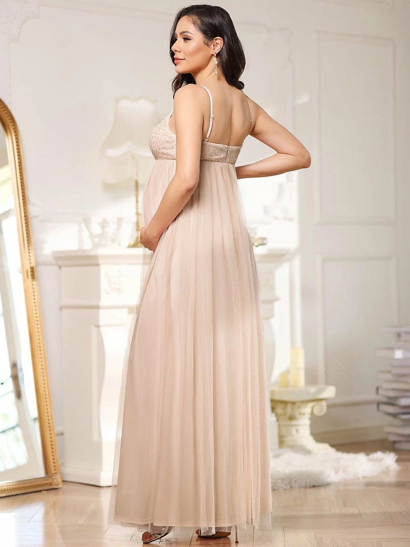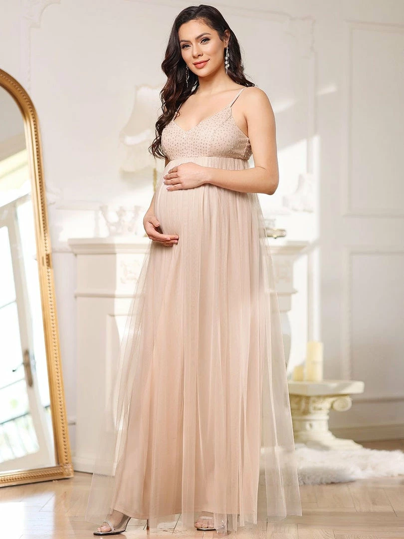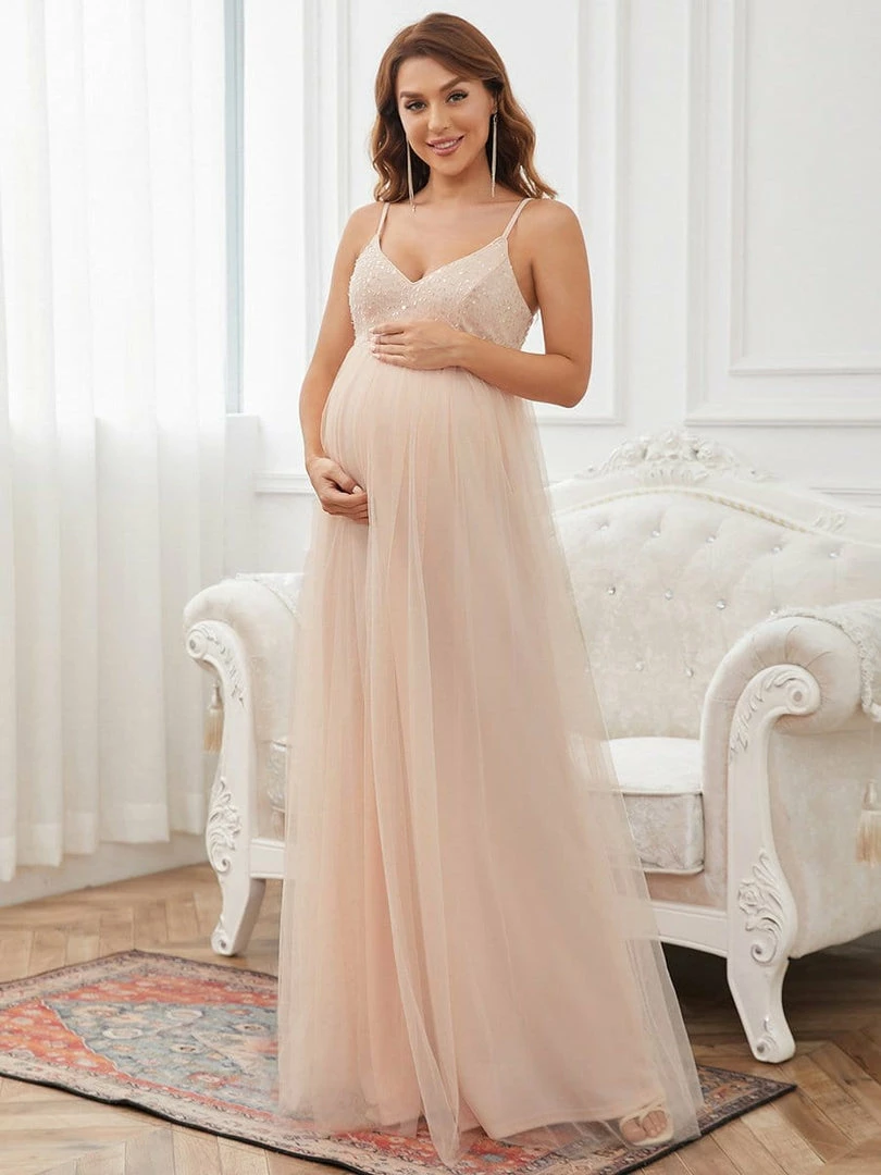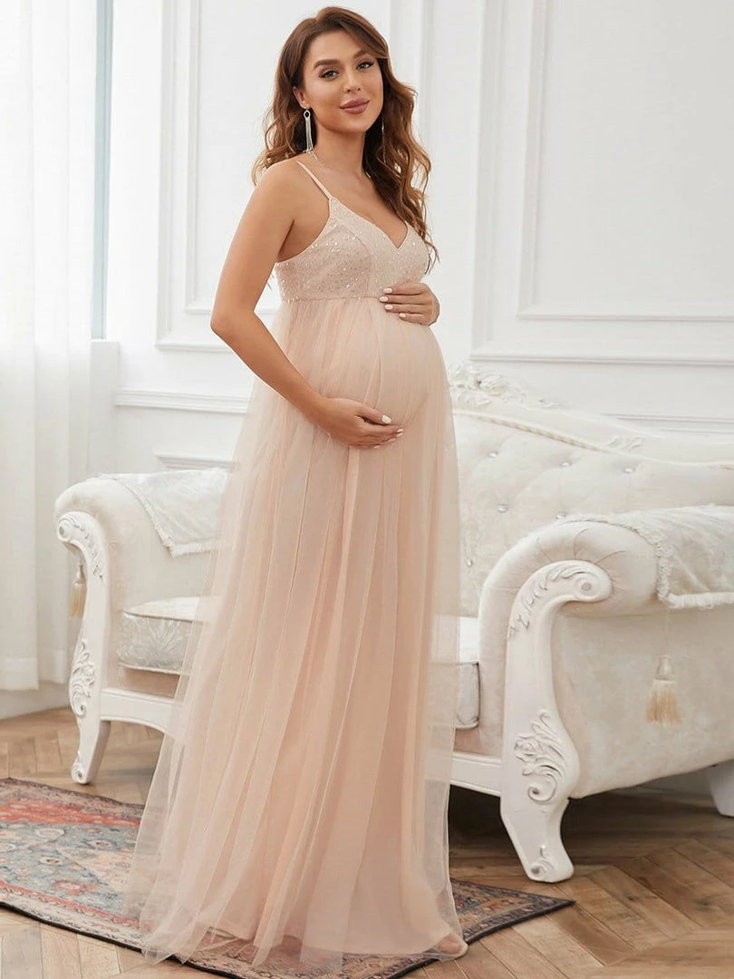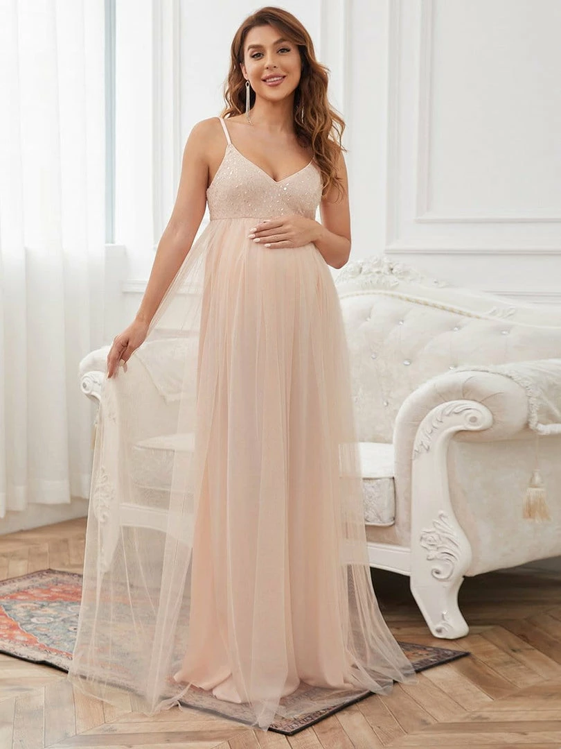 This gorgeous floor-length maternity dress leaves a long-lasting impression of elegance, featuring shiny sequins on top and a flattering v-neck collar. Slender spaghetti straps, a comfortable cinched waist, and a floor-length silhouette give this A-line maternity dress a perfect look for a wedding, lunch, or dinner.