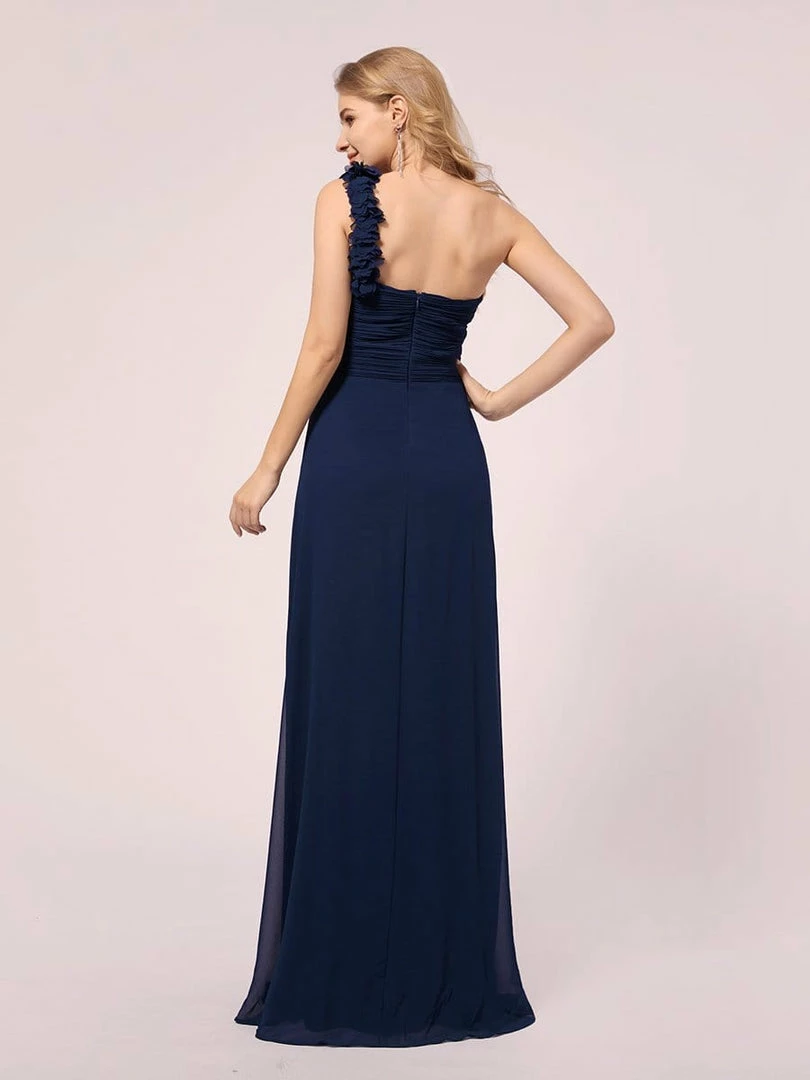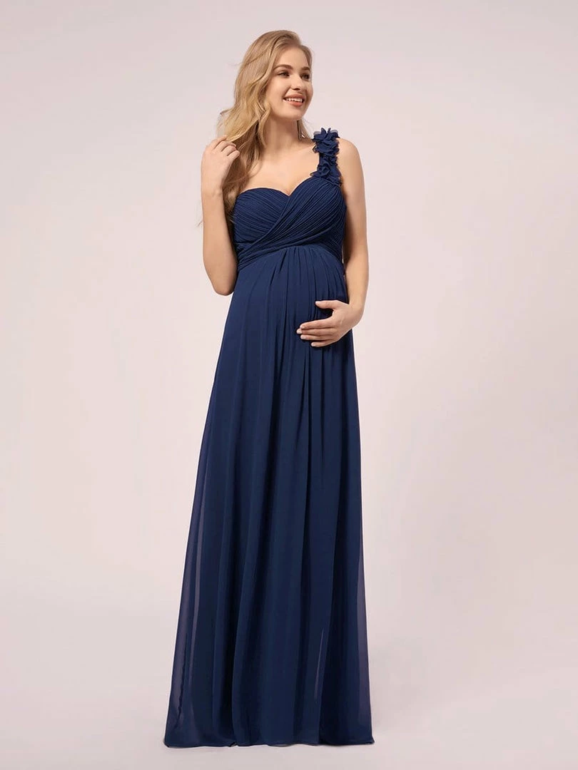 Are you looking forward to wearing a dress with classic and modern blended look during pregnancy? Then this maxi maternity dress is the right stop. Ruched sweet-heart bodice, asymmetrical one-shoulder adorned with flower decoration and full-length skirt all work wonder to enhance its elegance.