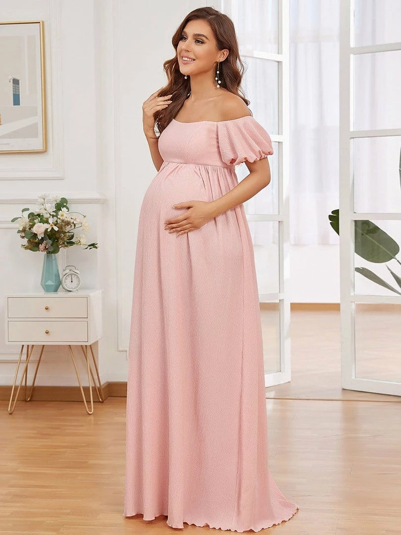 Get noticed and show off your pregnancy in style with this A-line maternity dress featuring puff off-shoulder sleeves, comfortable elastic waist, and floor-length fit.