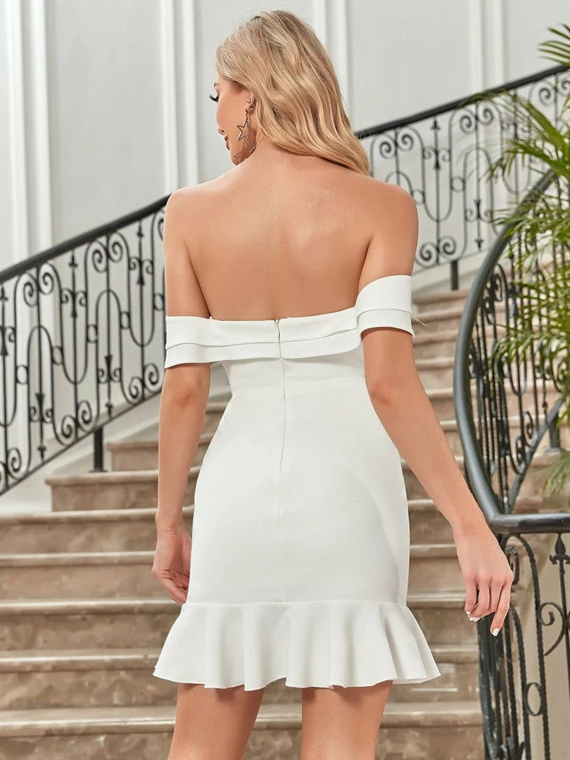 This romantic strapless mini cocktail dress will make heads turn with its plunging v-neck off-shoulder top covered in gorgeous ruffles. The above-the-knee bodycon fit features ruffles on the hem, giving it a vintage style just right for a prom, wedding, banquet, or other celebration. Pair it with metallic, black, white, or lucite heels or pumps.