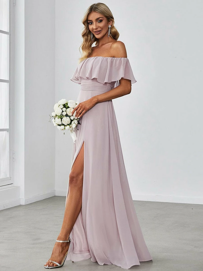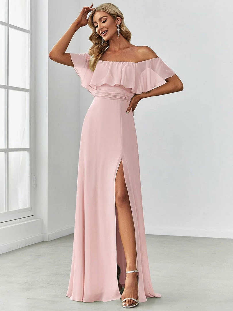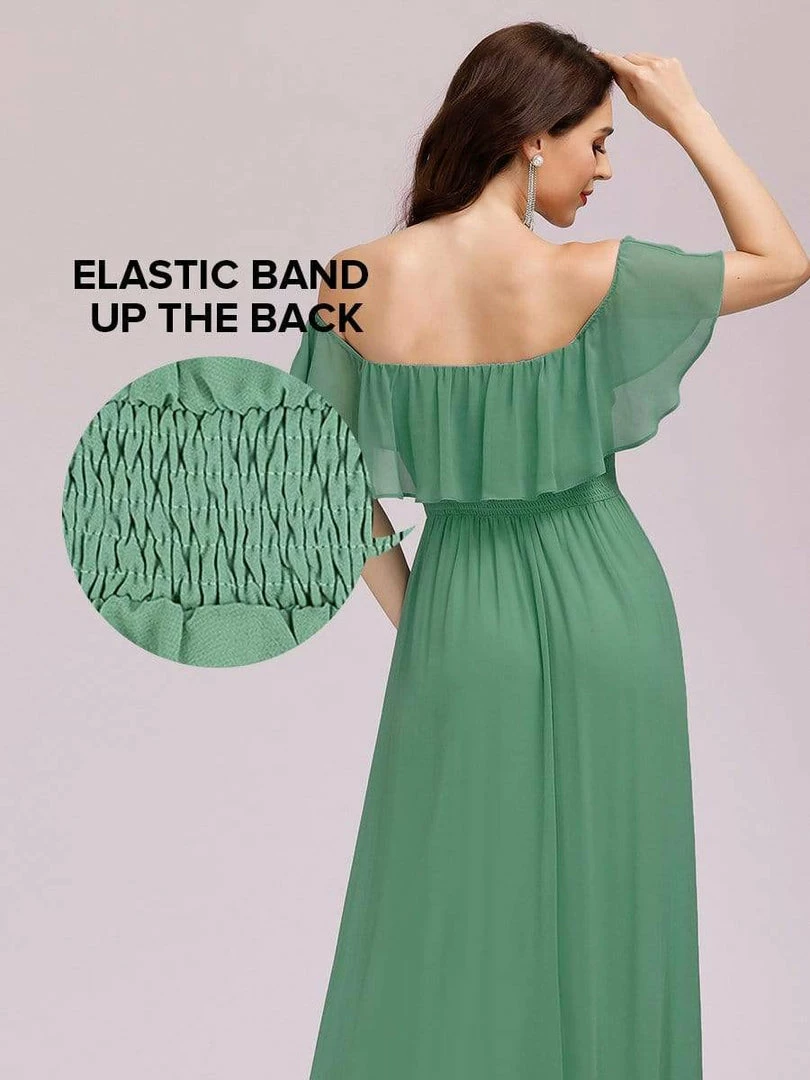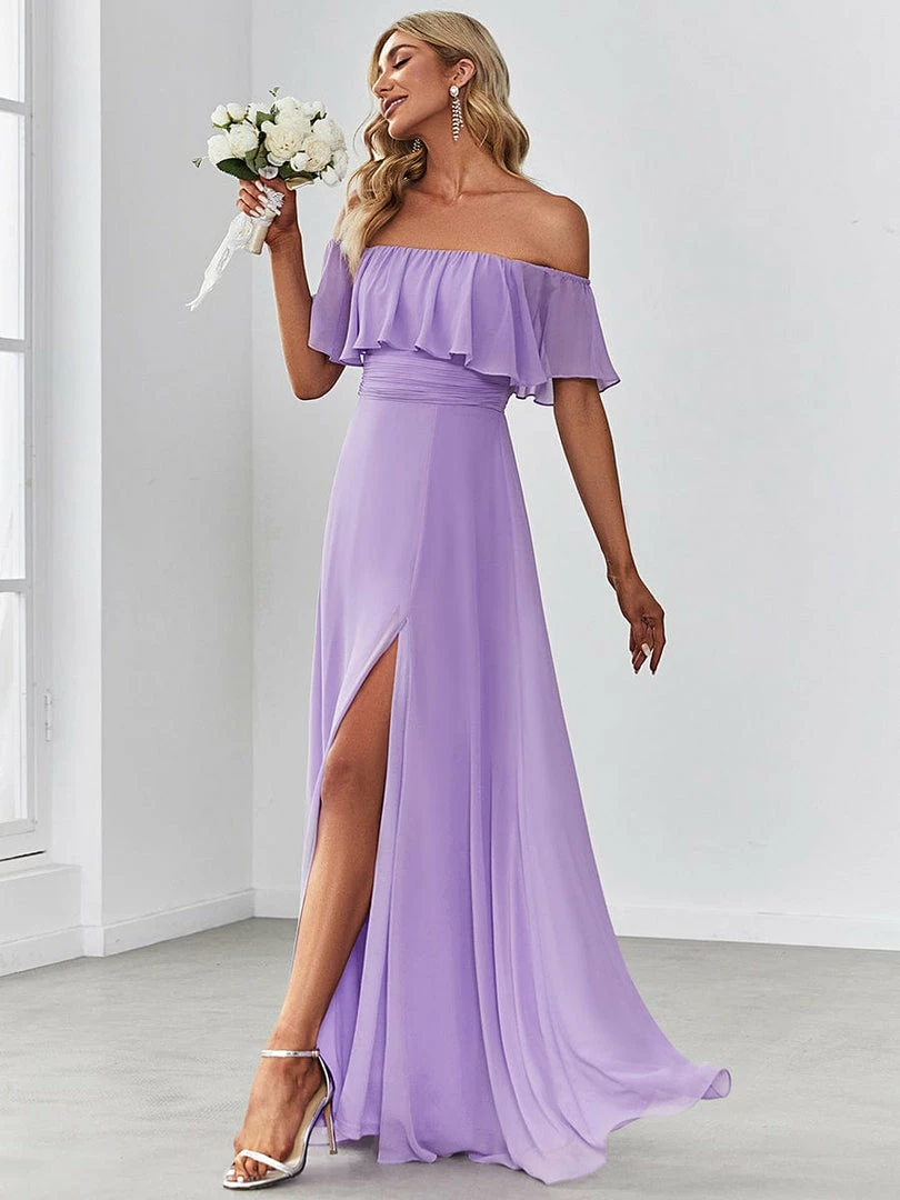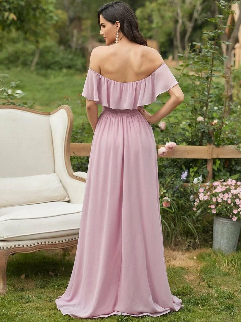 This romantic long flowy bridesmaid dress features a flowy off-shoulder neckline and floor-length skirt with a thigh-high slit. We think it’s perfect to wear this off the shoulder bridesmaid dress at any wedding, evening, party, cocktail, prom, homecoming, graduation or as a holiday vacation dress.