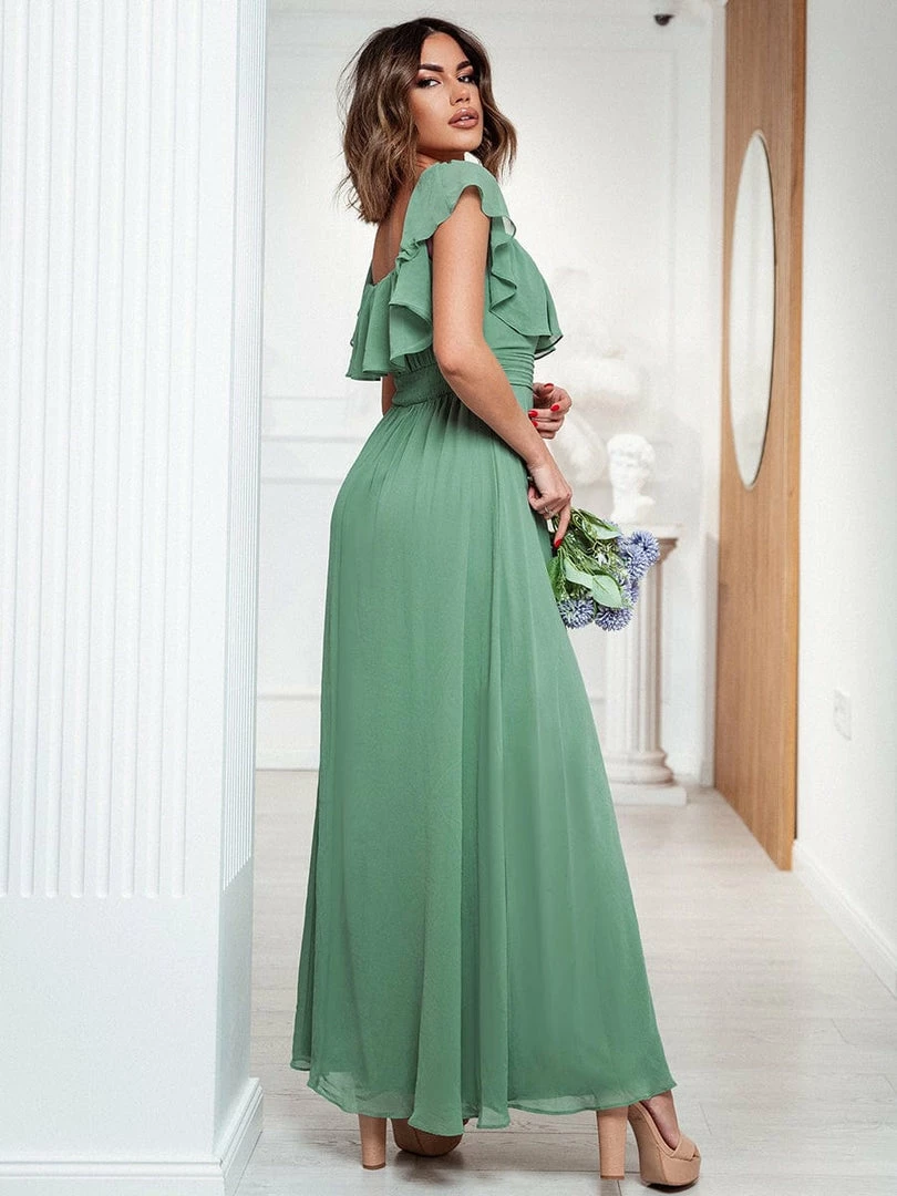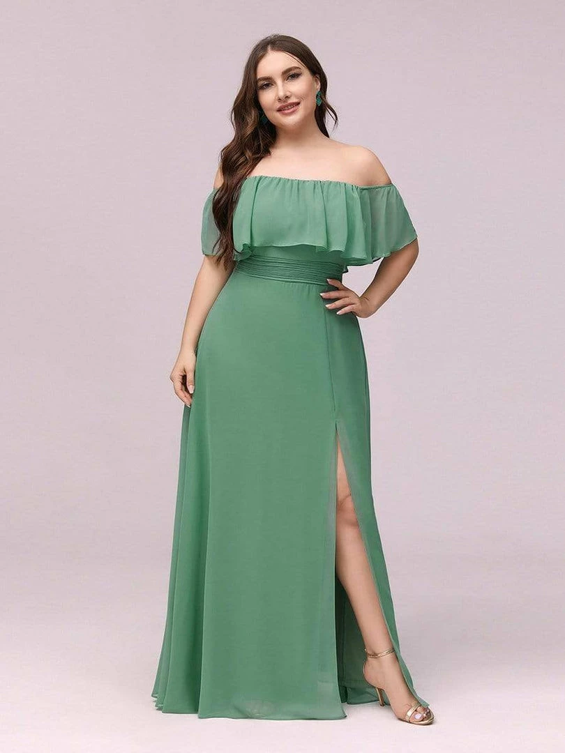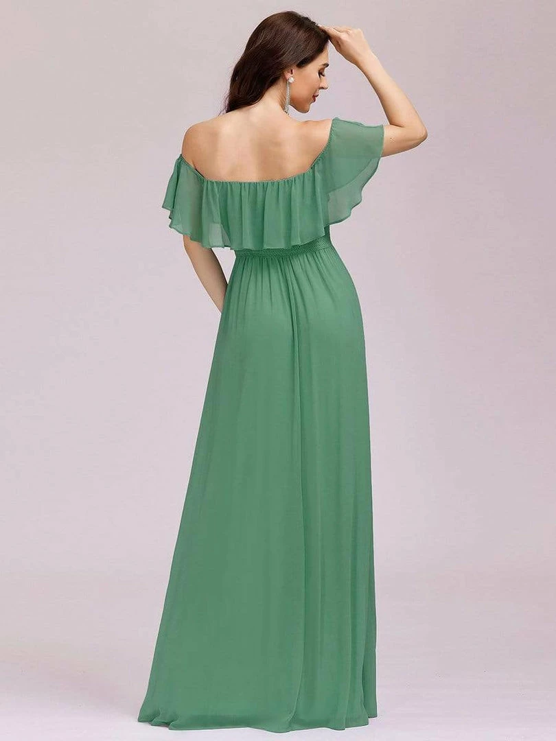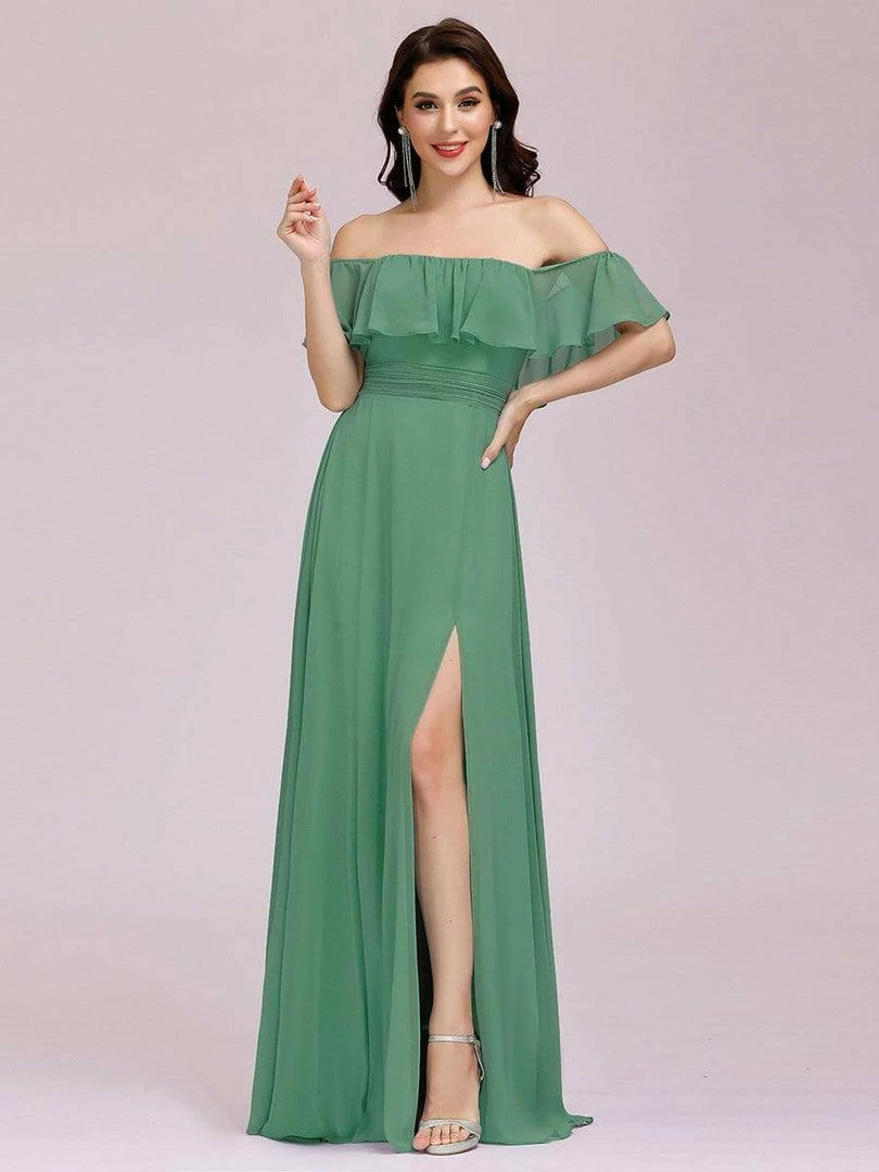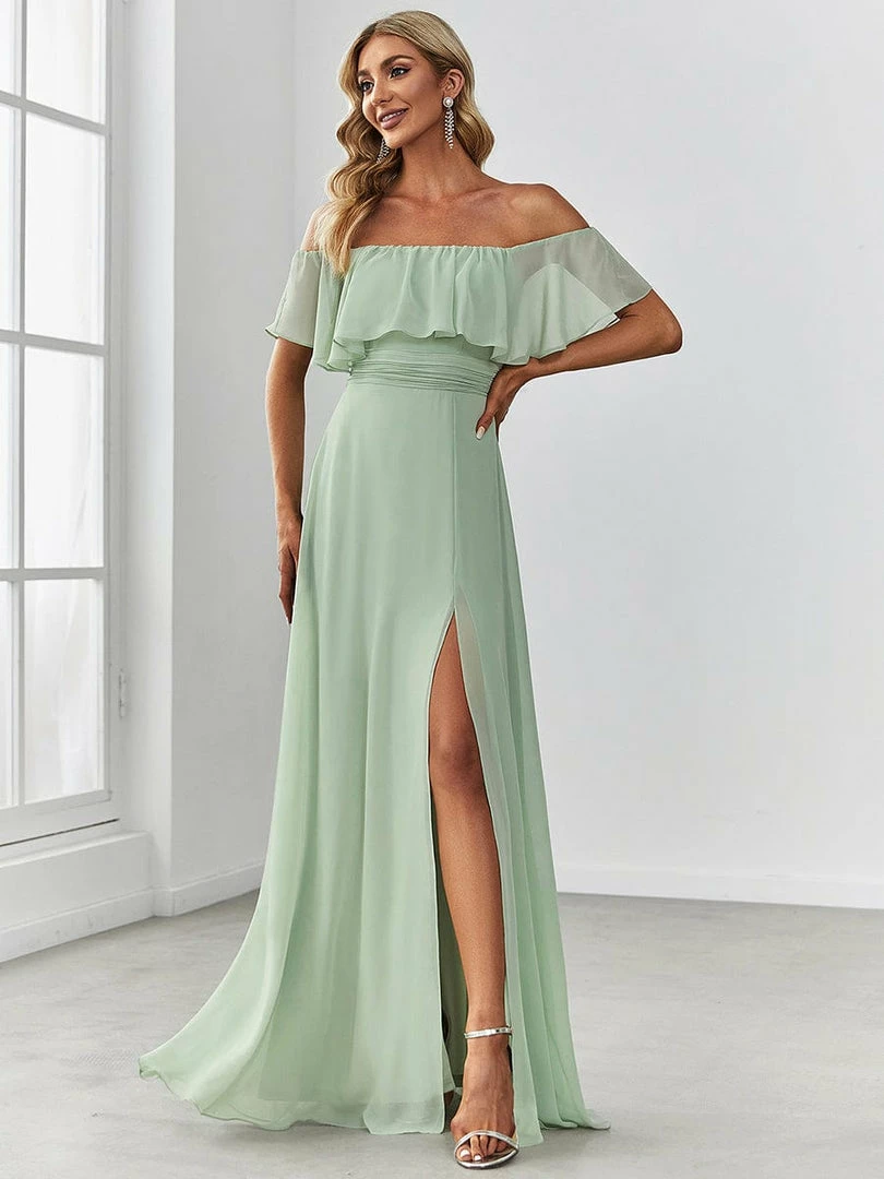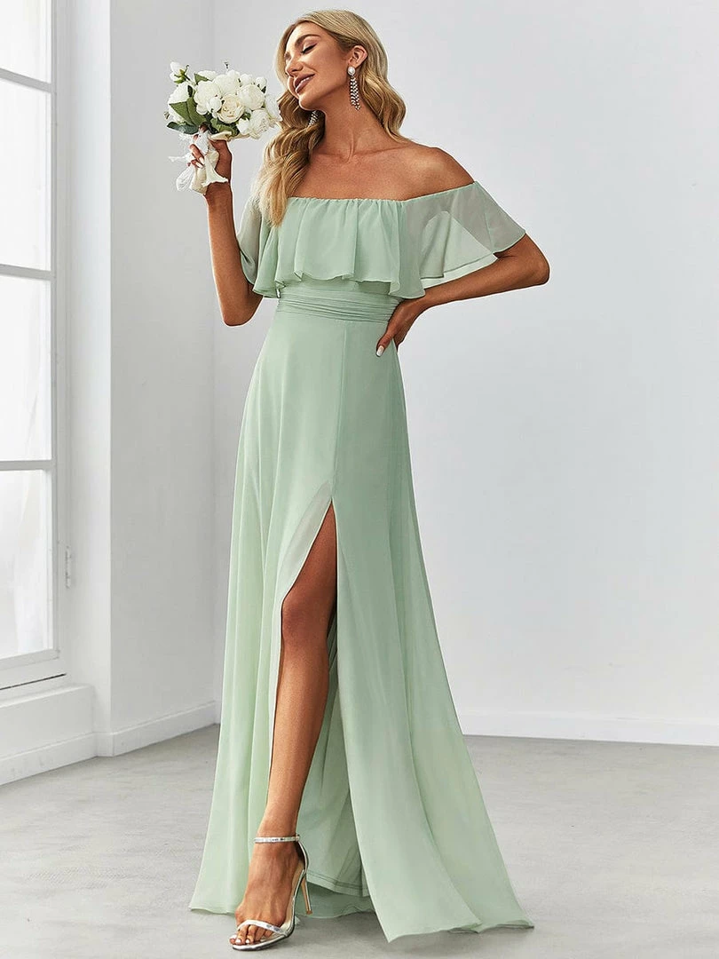 This romantic long flowy bridesmaid dress features a flowy off-shoulder neckline and floor-length skirt with a thigh-high slit. We think it’s perfect to wear this off the shoulder bridesmaid dress at any wedding, evening, party, cocktail, prom, homecoming, graduation or as a holiday vacation dress.