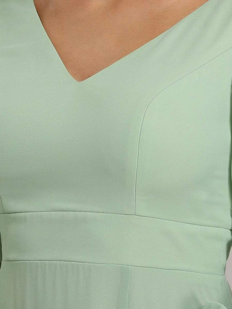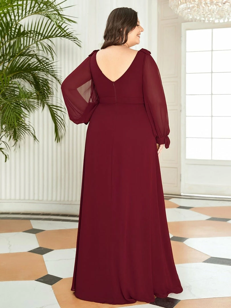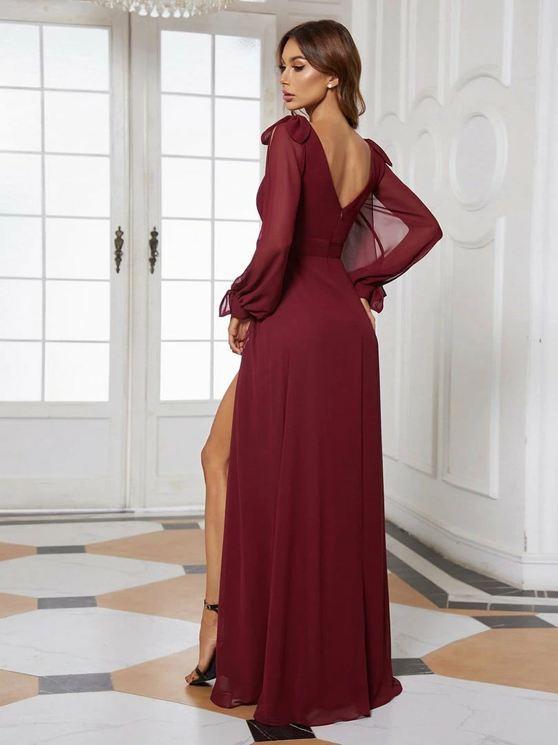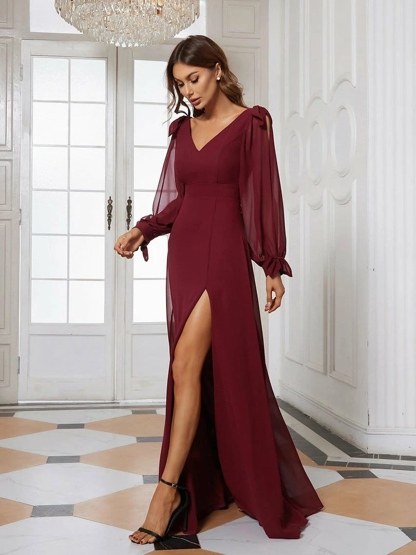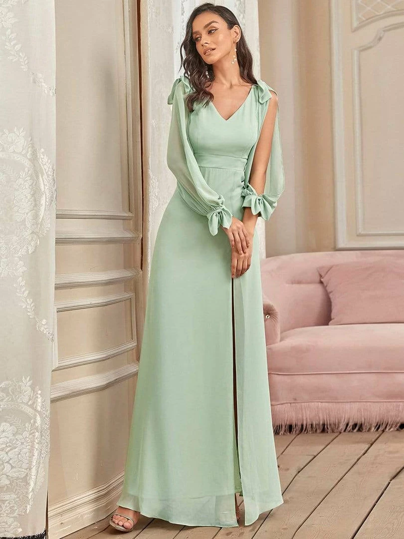 A front slit on this floor-length A-line bridesmaid dress turns up the heat for a look that mixes classic elegance and sultry style. Long open sheer lantern sleeves exude a vintage inspiration, finished with a v-neck that awaits your bridal necklaces.