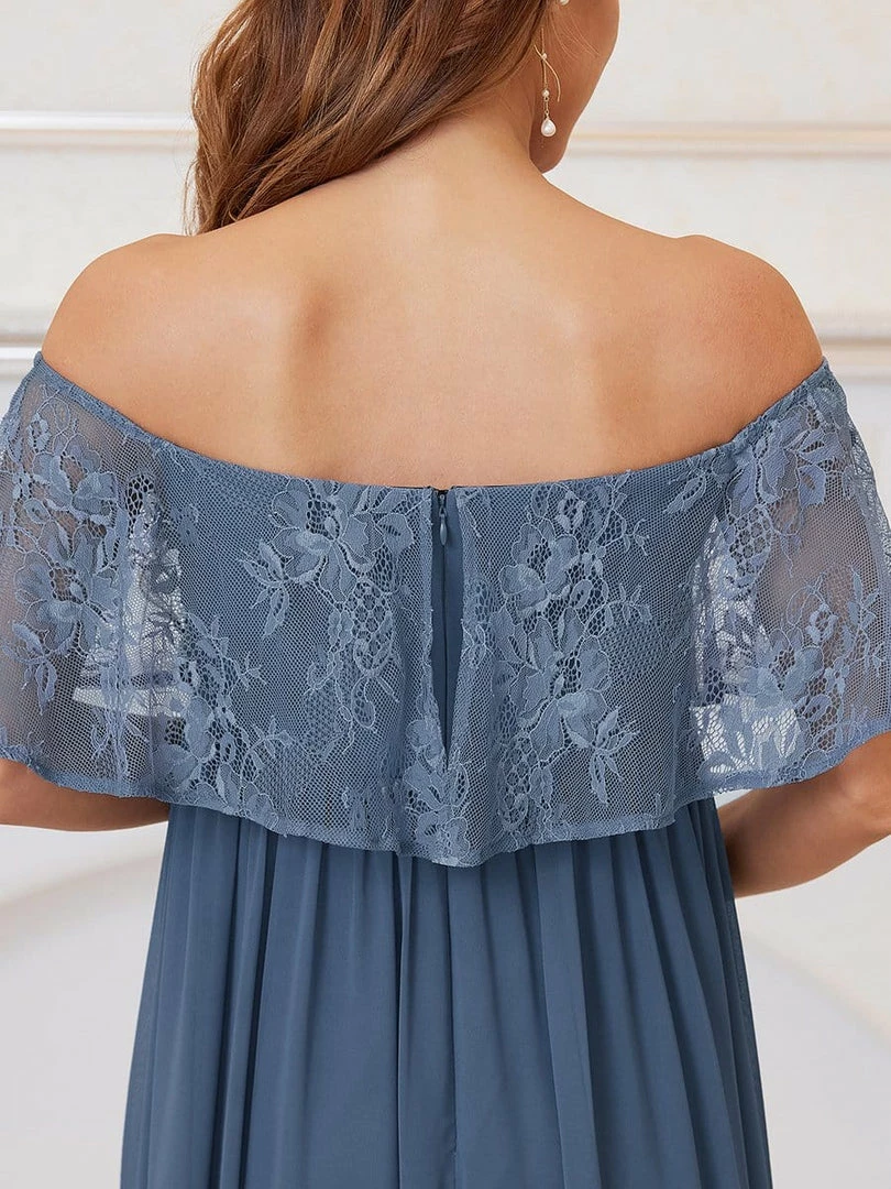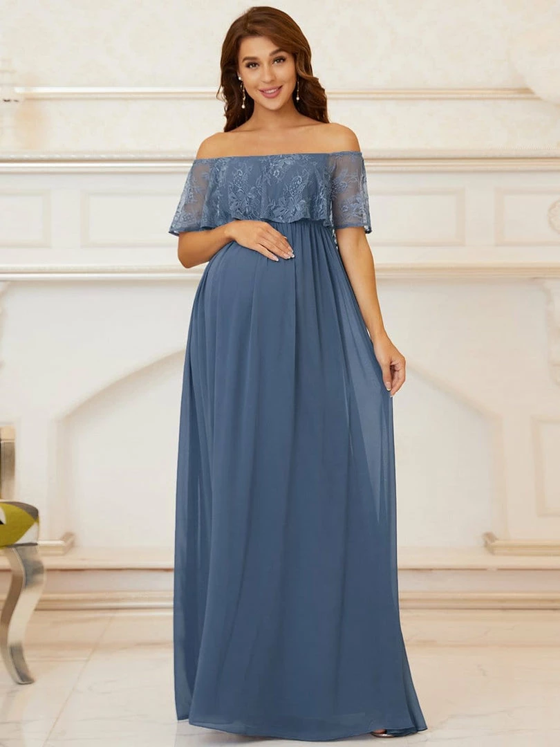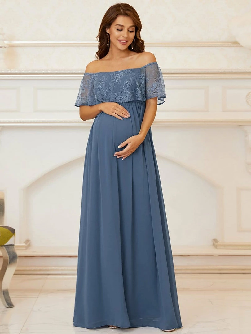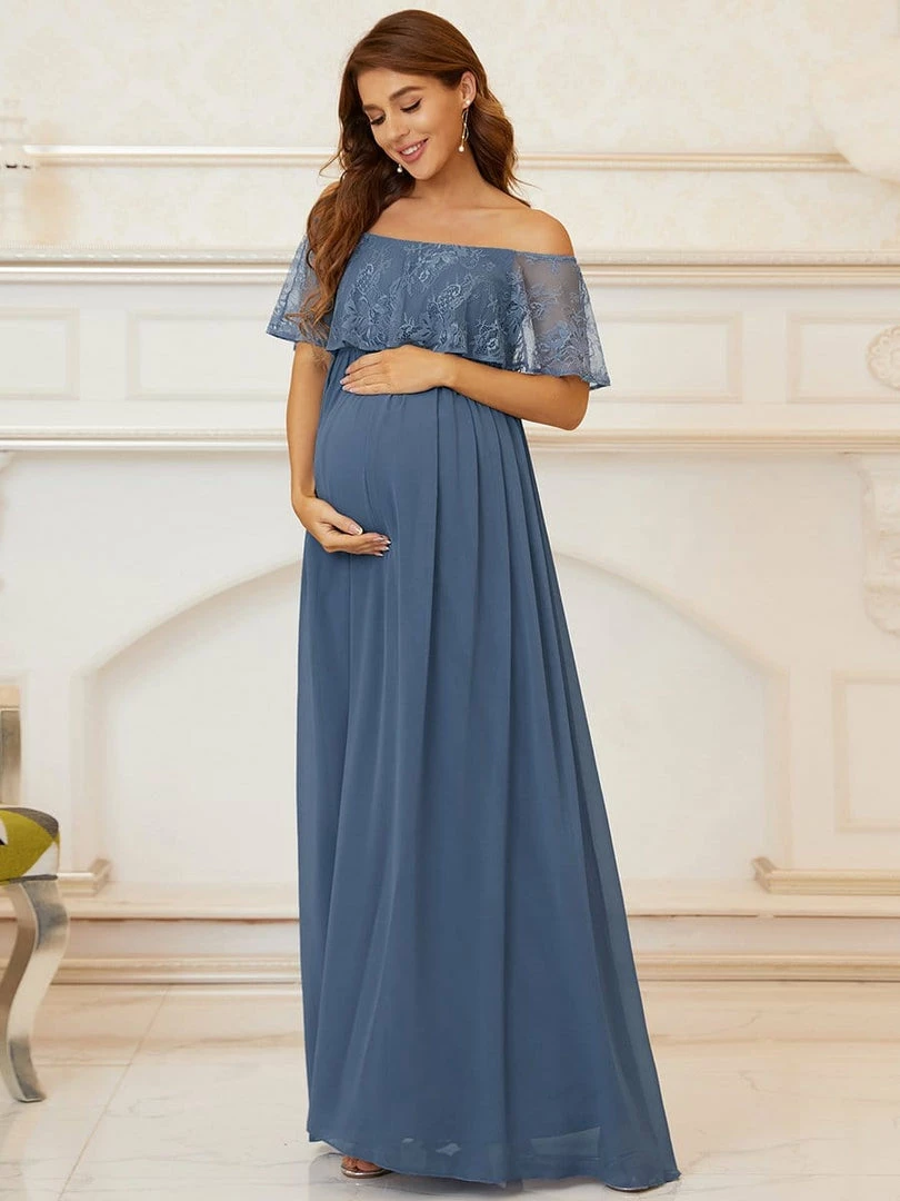 This gorgeous A-line maternity dress features pretty floral lace on the sleeveless bandeau top with an oversized ruffle. A cinched waist and multi-layered floor-length skirt make this stunning off-shoulder maternity dress perfect for different casual or formal occasions, including weddings, bridesmaid dresses, black-tie affairs, banquets, and other momentous events.