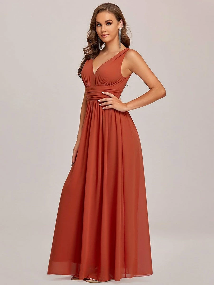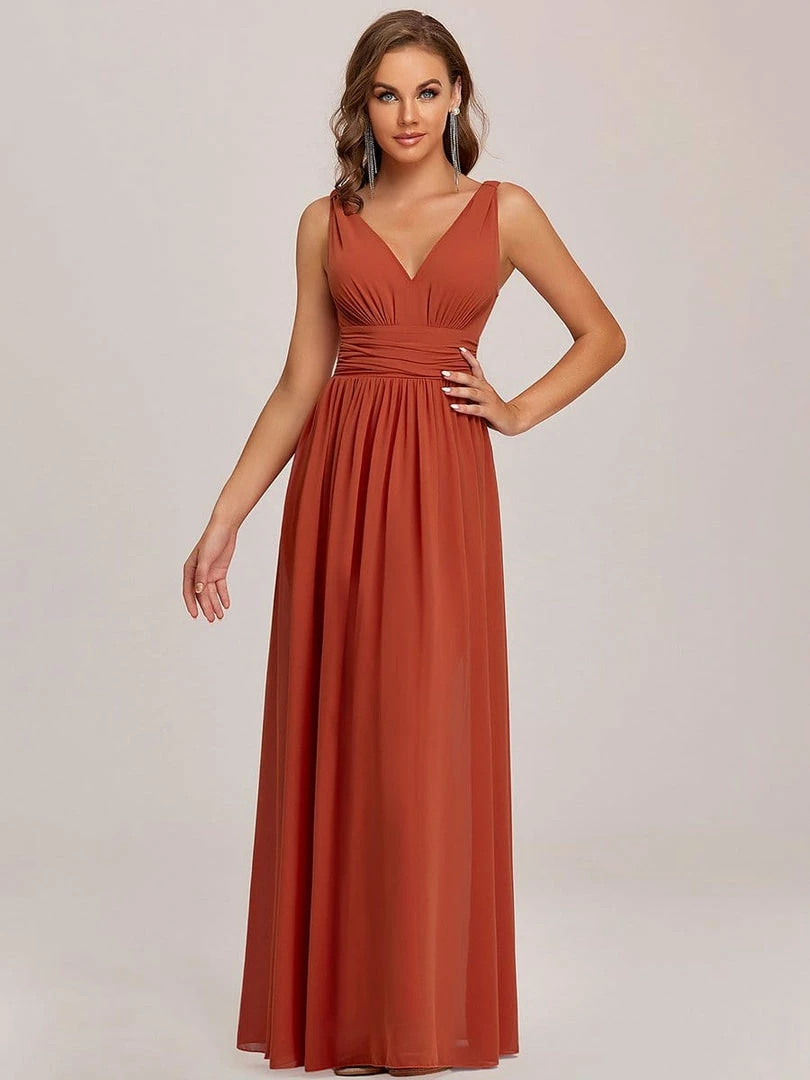 This maxi chiffon plain chiffon bridesmaid dress is perfect for any occasion you are attending. The sleeveless maxi chiffon bridesmaid dress will be a hot addition to your wardrobe with its daring plunging neckline. The fit and flare design of this v neck maxi bridesmaid dress is an absolute beauty as it will look gorgeous on all body types. Wear it for a cocktail evening, wedding or even your prom night.