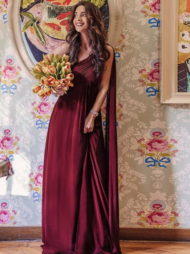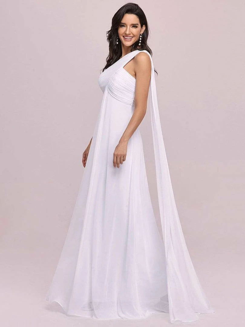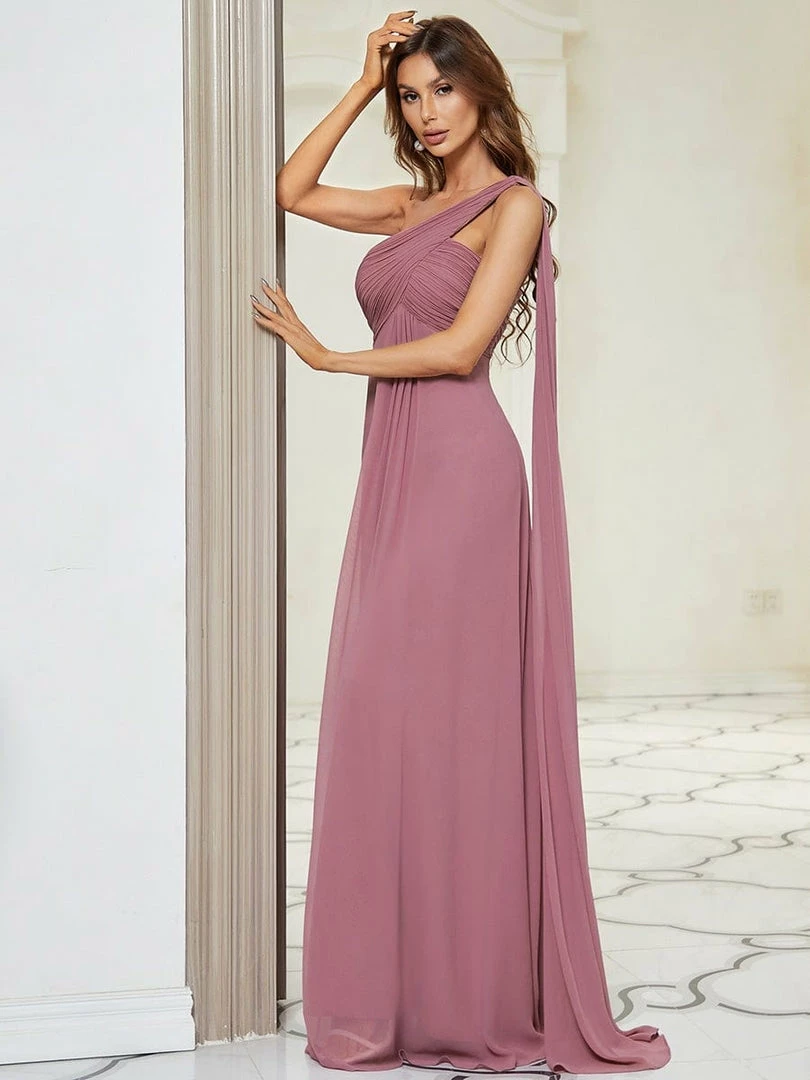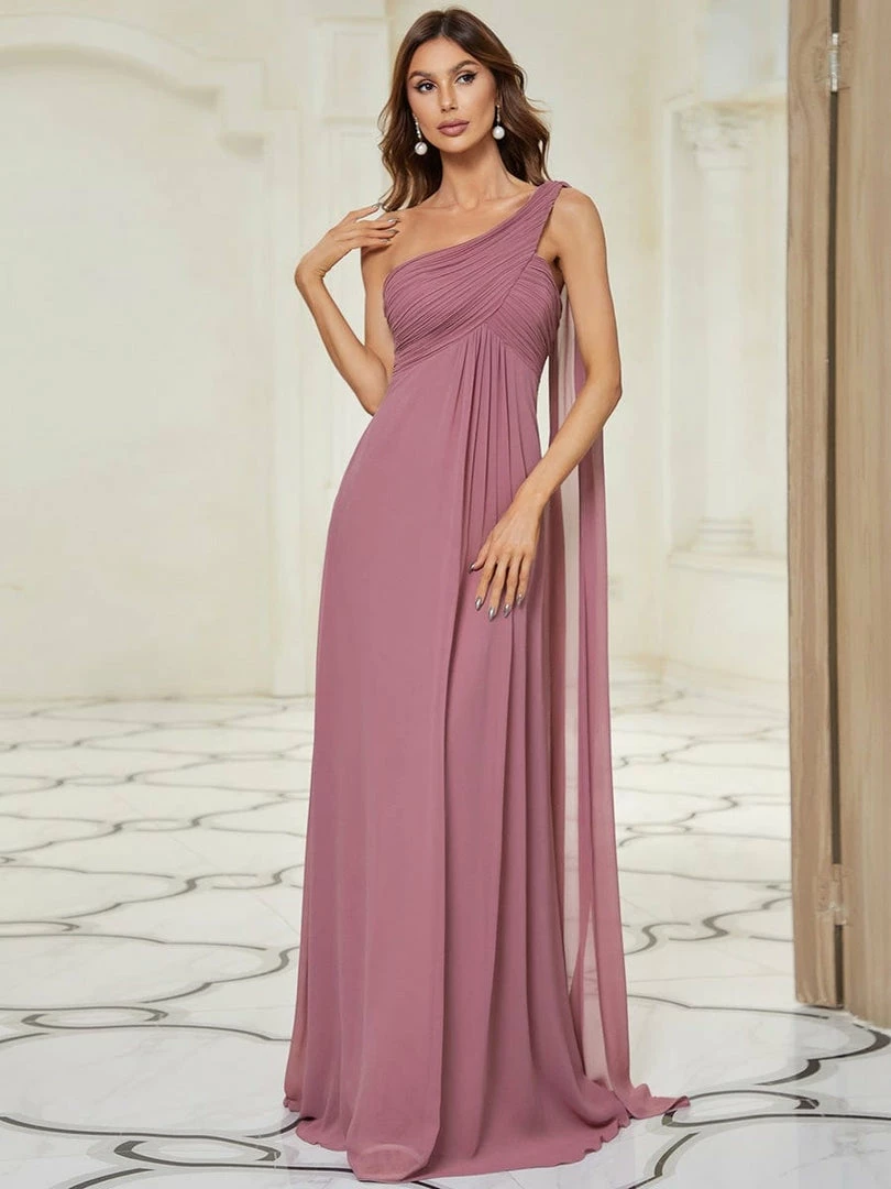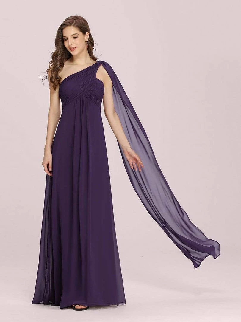 Simple yet elegant, this classic one-shoulder long chiffon evening dress is fashion-forward while still being a closet staple any woman needs. This flowy chiffon one shoulder long evening dress features a ruched, fitted bust with a free-flowing silhouette over the lower half of the body, perfect for evening party, cocktail, prom, homecoming, graduation, weddings, and any other formal affair!