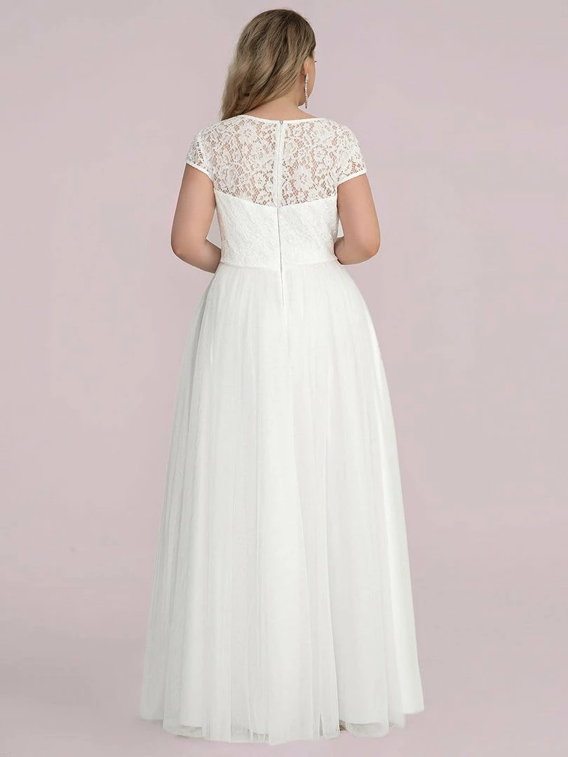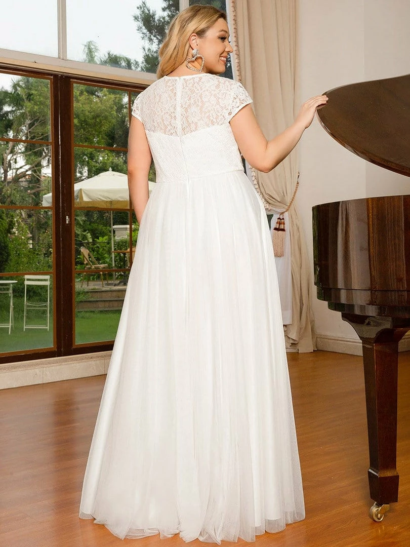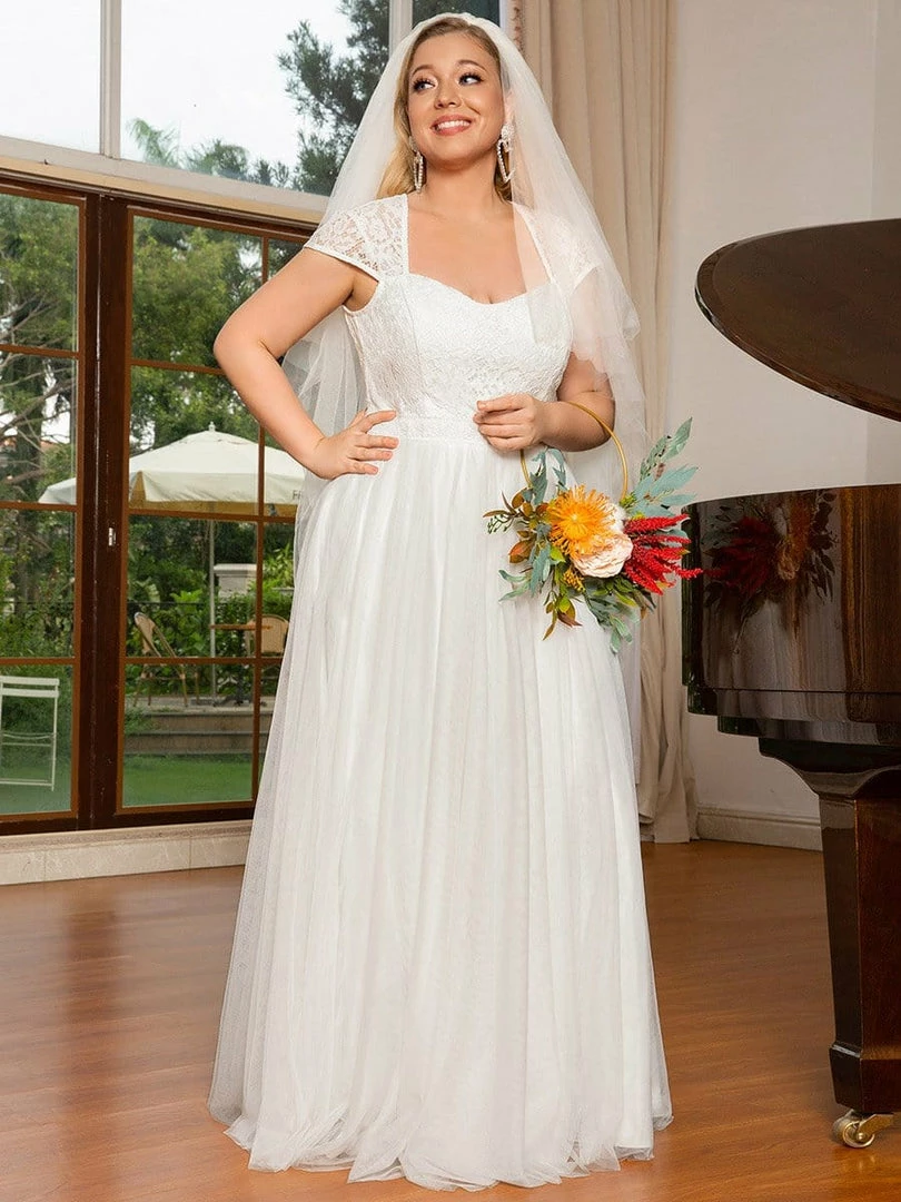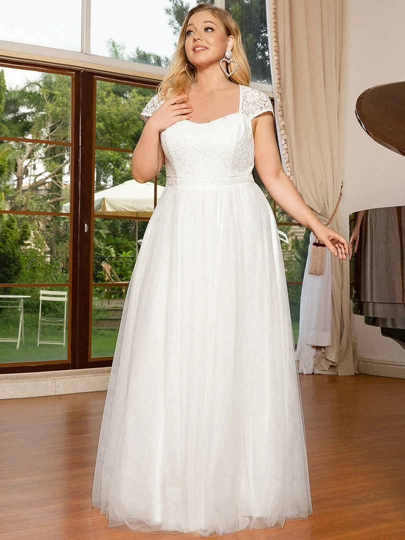 Honor your love commitment wearing this stunning lace capped sleeve wedding dress featuring a flowing layered skirt, cinched waist, and square neckline, perfect for your dream wedding.