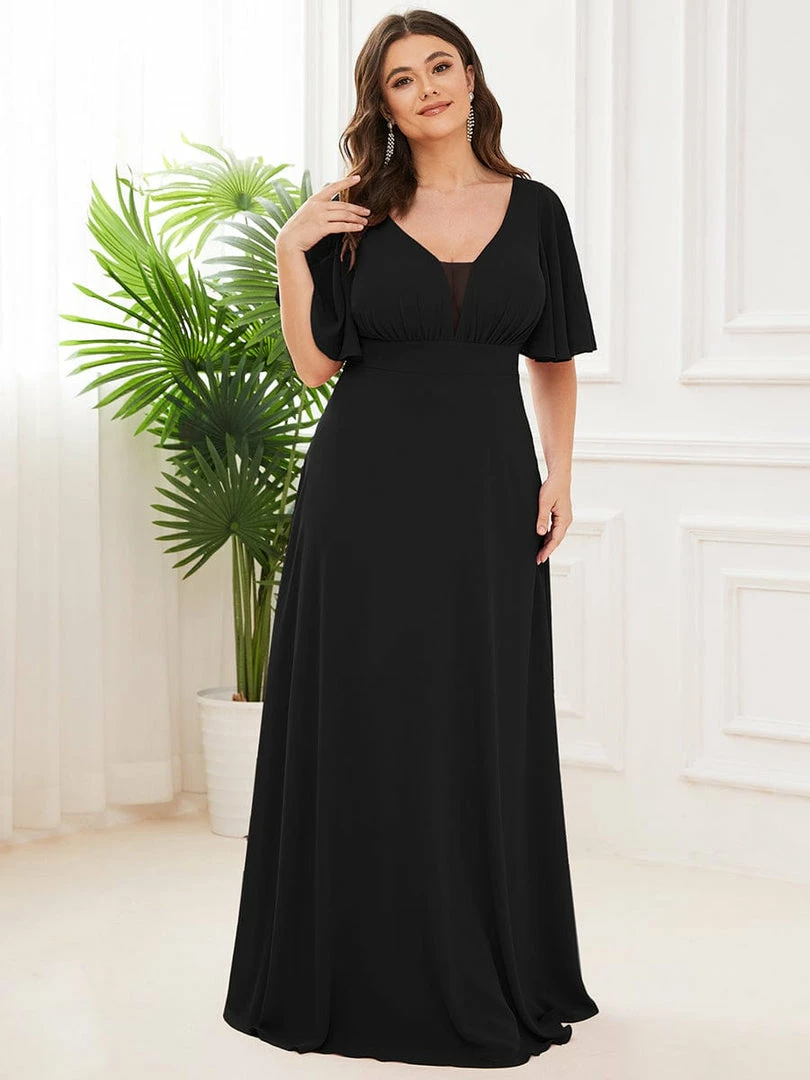 This chiffon A-line mother of the bride dress is perfect for any wedding theme with its short flutter sleeves, cinched waist, and illusion panel v-neckline. The dramatic plunging v-back leaves a lingering impression of elegance.
