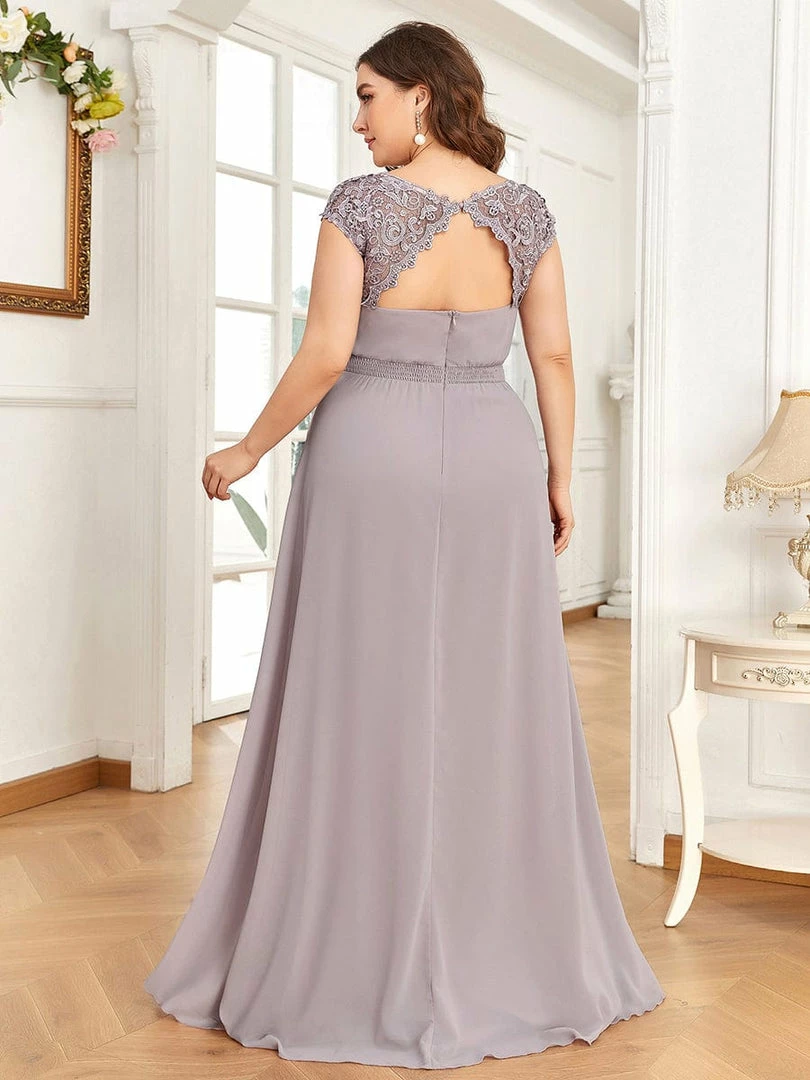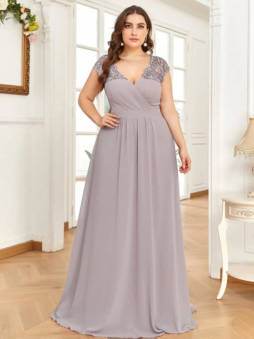 This gorgeous plus size chiffon A-line evening dress exudes a romantic elegance and stunning silhouette, perfect for wearing for any special occasion with its comfortable and flattering cinched waist and flowing floor-length fit. The plunging sweetheart ruched neckline offers support complemented by the vintage-inspired lace-capped shoulders.