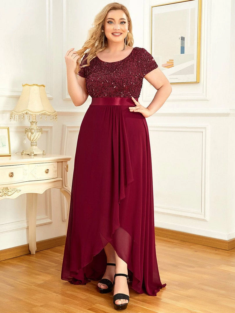 Celebrate your next special event wearing this glitter sequin A-line evening dress featuring an empire ribbon sash waist and asymmetrical layers of gorgeous chiffon. The bodycon top with a backless fit gives this beautiful floor-length dress a lingering impression of elegance, perfect for a premiere or banquet.