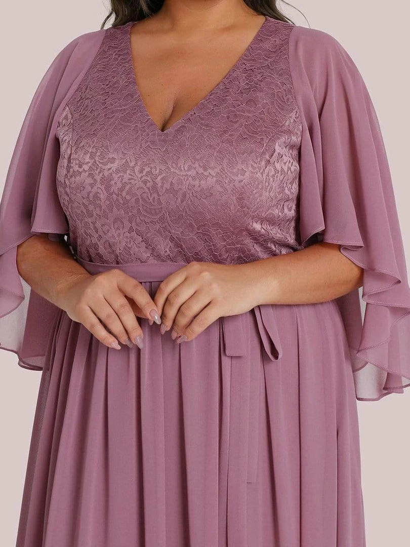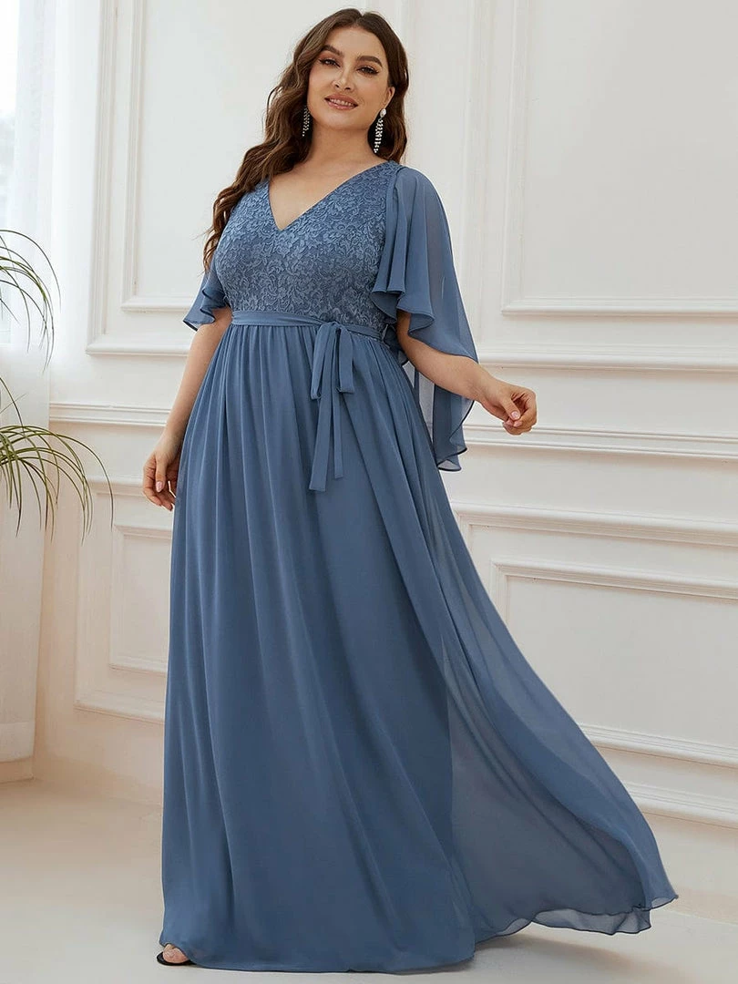 This sexy and edgy plus size formal evening dress would help you to show off your great choice and style. The plus maxi evening dress has an A-line silhouette and accentuates your whole body. It features deep V-neck and ruffles sleeves. The waist belt is also present which creates the illusion of slimmer waist. Grab this curvy evening dress and win hearts. A perfect choice for formal weddings and evening parties, cocktail, prom, homecoming, graduation, and any other formal affair!