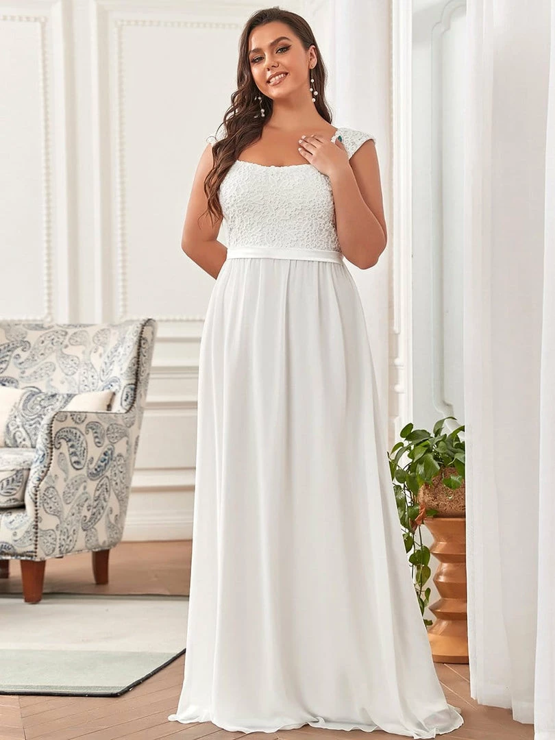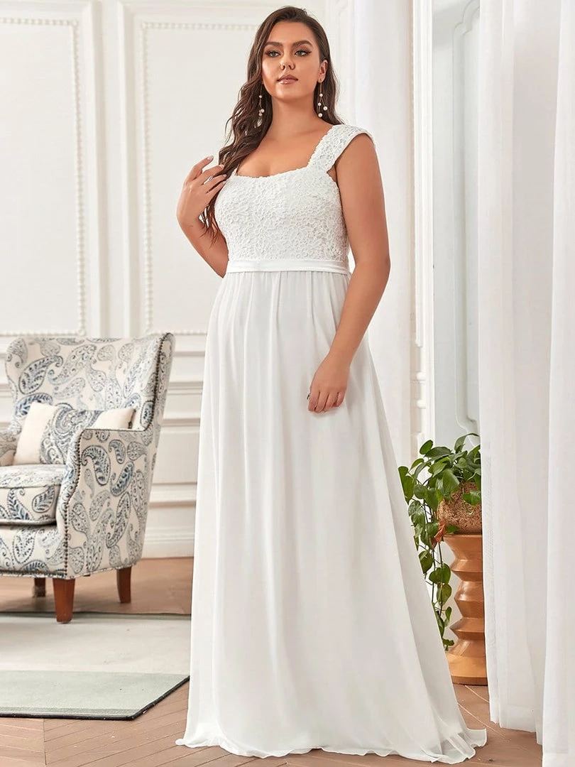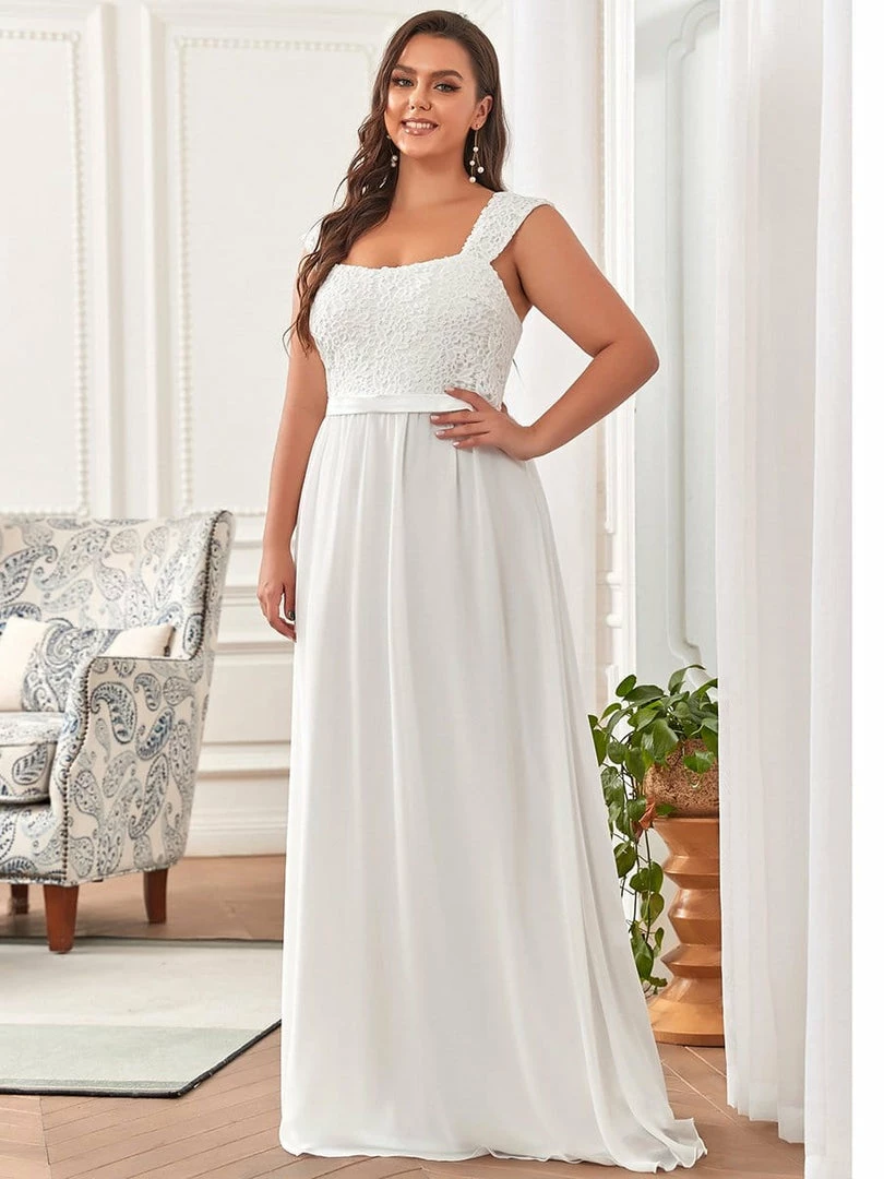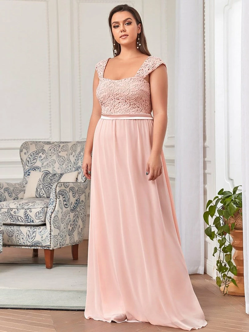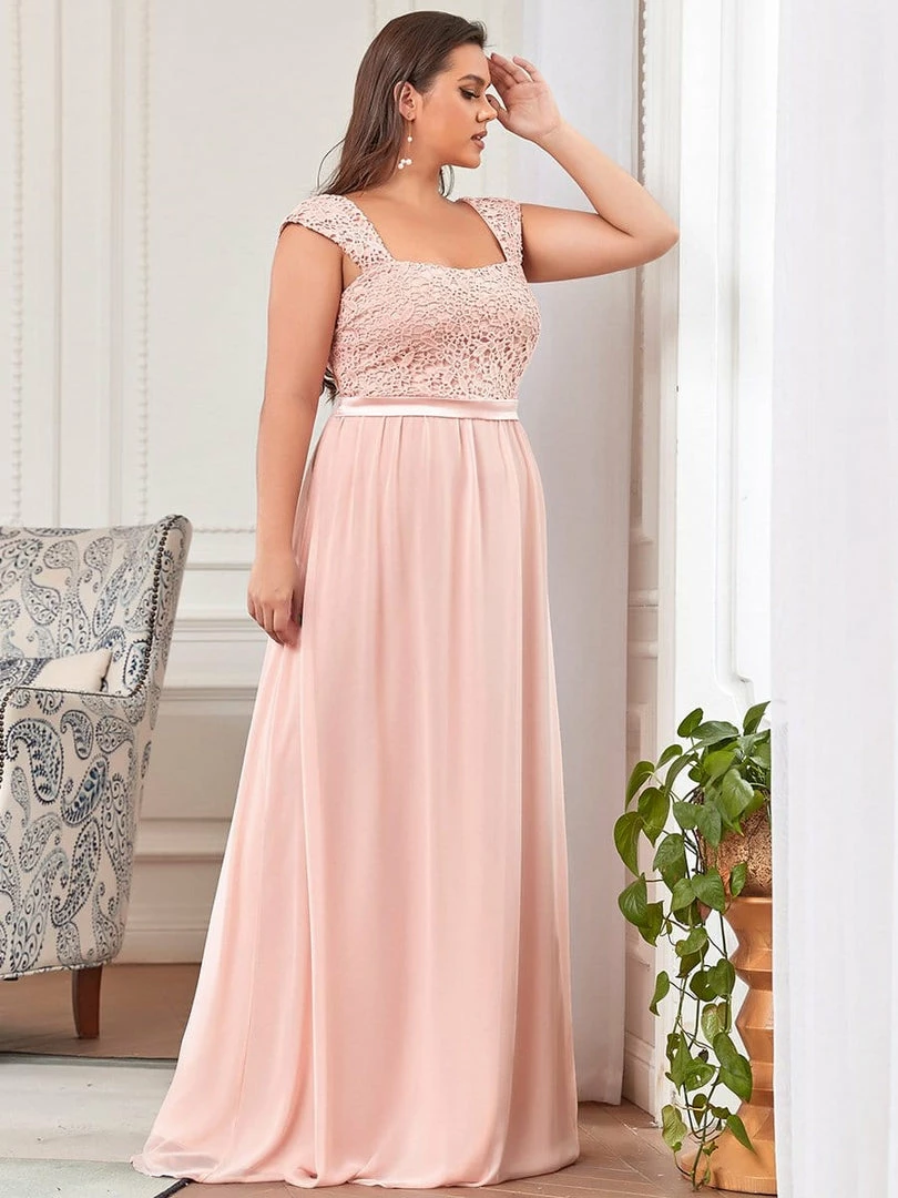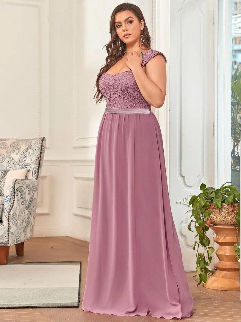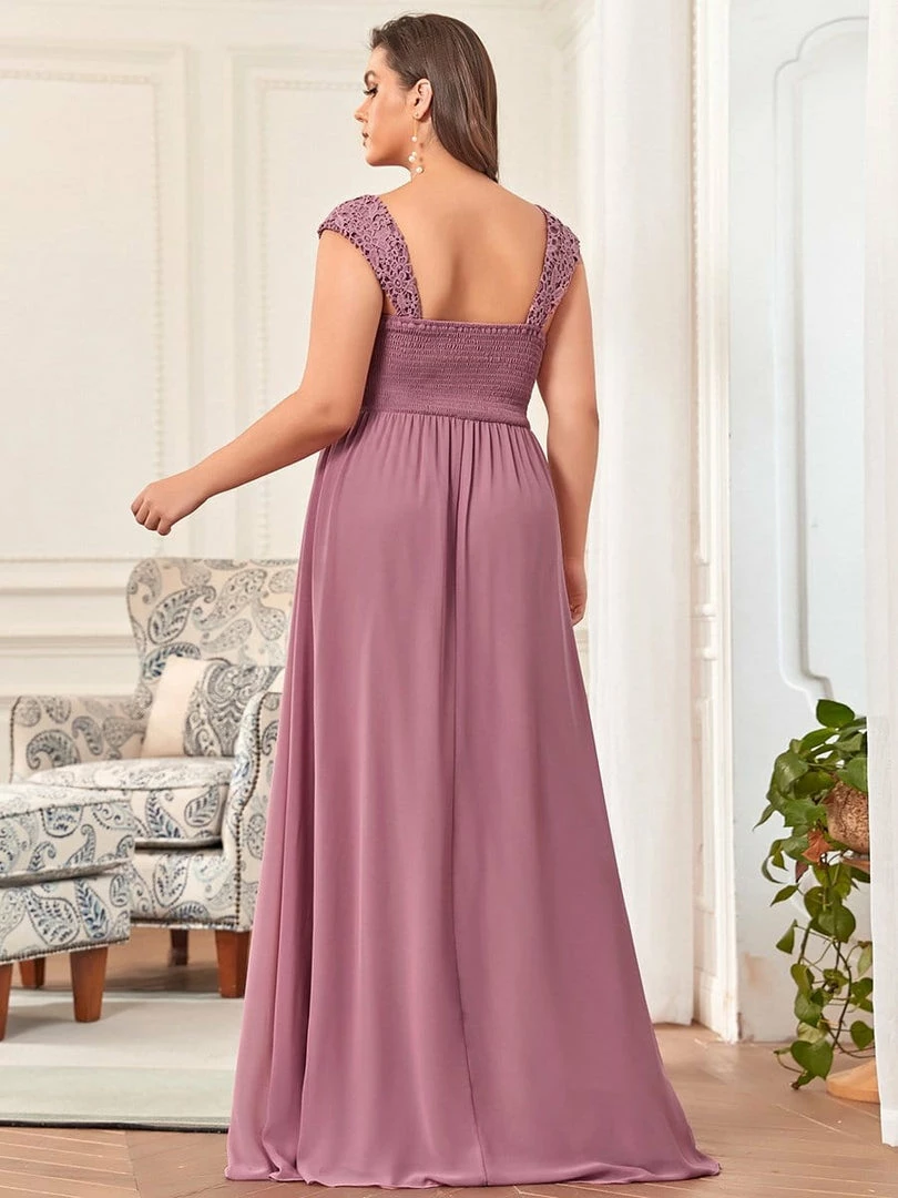 This elegant a line maxi bridesmaid dress features a lace bodice and flowy chiffon skirt. It is available in gray, purple, burgundy, pink, white and more. Select yours and be ready for your next event.
