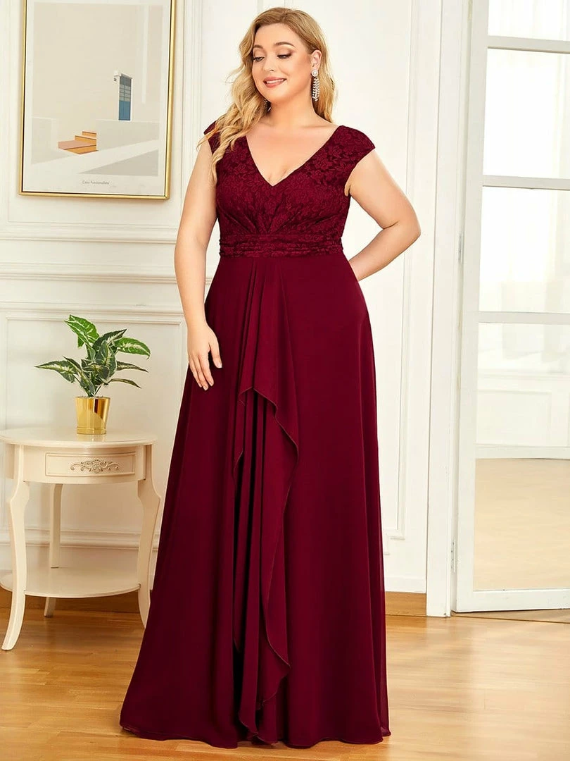This stunning plus size mother of the bride dress is the perfect selection for the wedding, featuring a beautiful balance of asymmetrical, floor-length chiffon layers and a floral lace fitted top. The capped sleeves/sleeveless fit and v-neck accentuate the face and gorgeous jewels in pure elegance and timeless style. Get perfect plus size formal dress for weddings and enjoy great customer service.