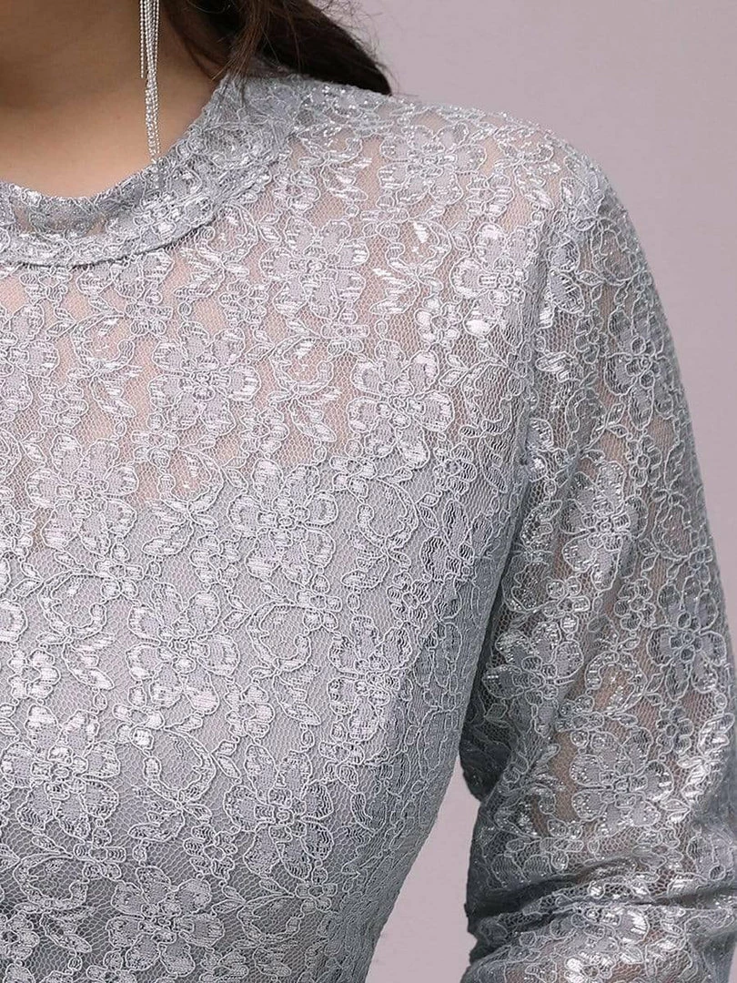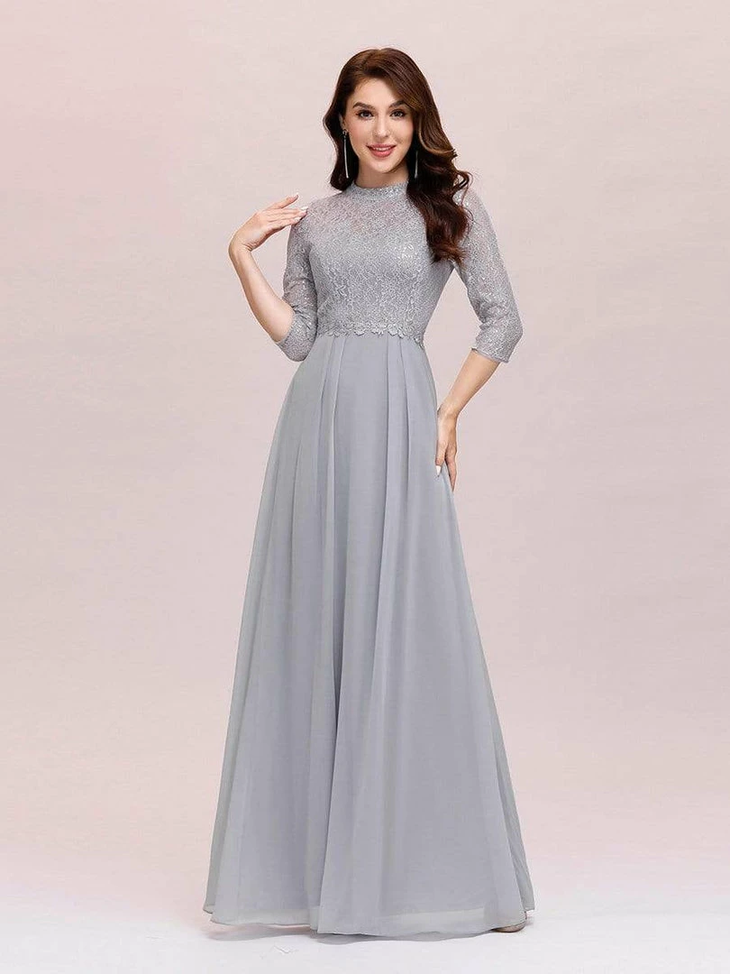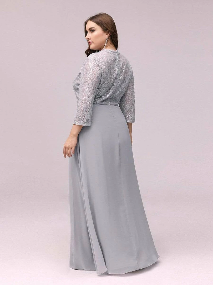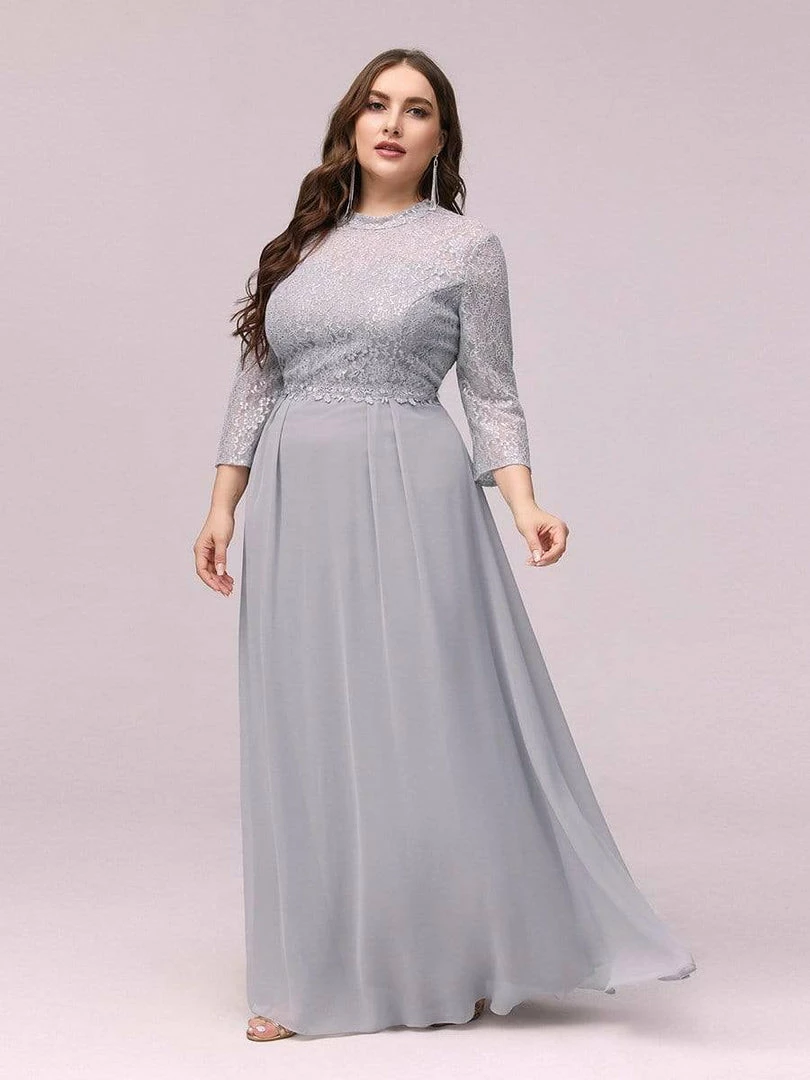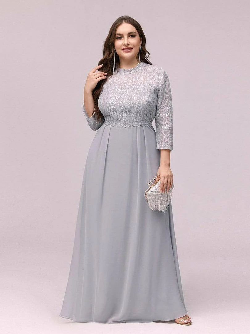 Look like an elegant princess by wearing this elegant high neck plus size formal evening dress for ladies. The upper part of the plus size formal dress is made of beautiful silver lace clothe and is quite eye catching. This plus size lace chiffon evening dress features a round neck and half sleeves. The A-line silhouette also helps to accentuate the body shape of the wearer.
