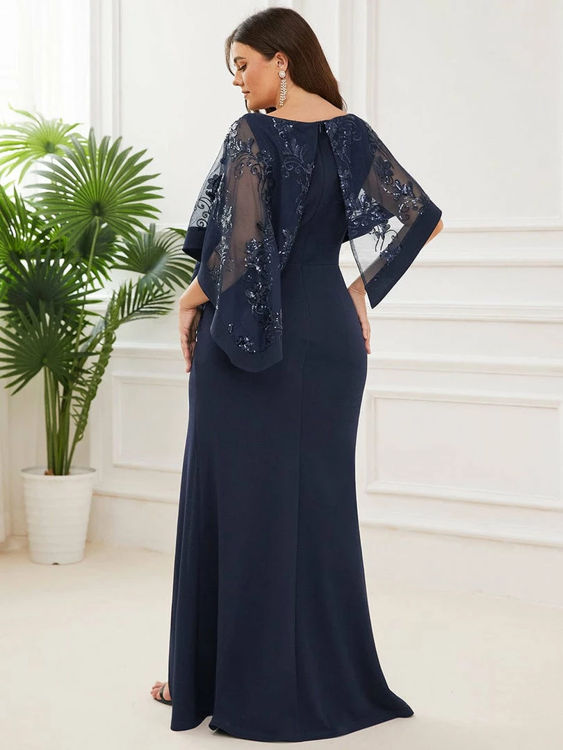This sophisticated plus size black sequin mother’s dress features a demure sheer floral sequin overlay top for extra coverage and style. The high split design makes you look sexy. The soft plus chiffon formal dress in cape tailored for curvy figures which show your timeless elegance. The bodycon fit and front slit add a feminine look, making this mature dress perfect for a wedding, a banquet, or any formal event.