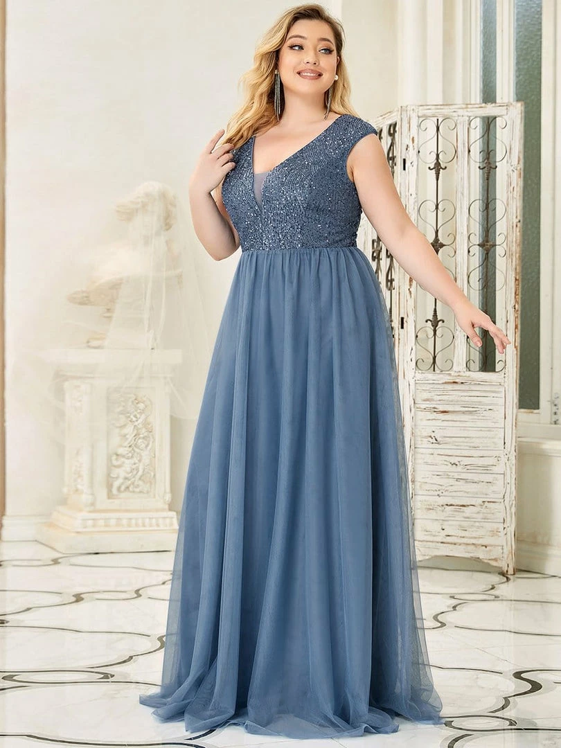 This prom dress for plus size girls features a V neckline,a full A-line skirt,and a fitted sequins top. Mixed materials are a fun trend and what better combination then sequins and tulle! Perfect for all formal occasions,from evening party,cocktail,weddings to prom,homecoming,and graduation!