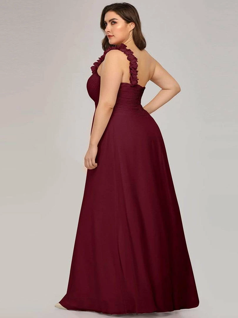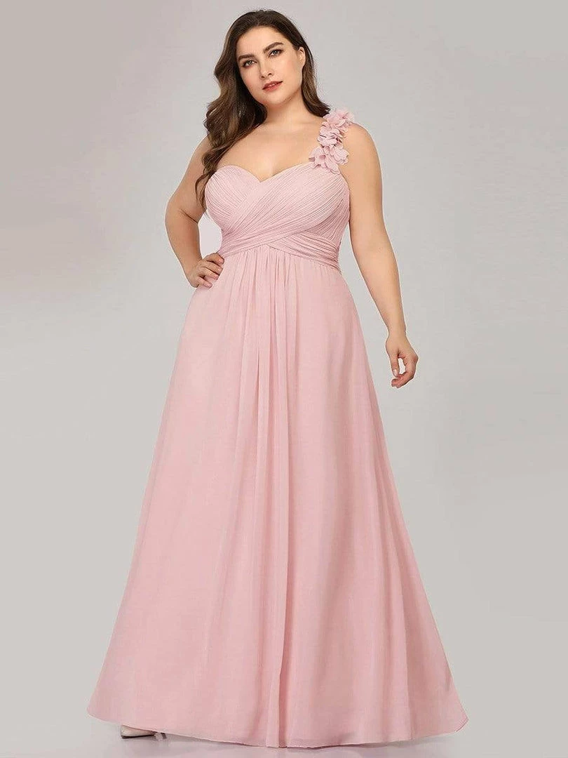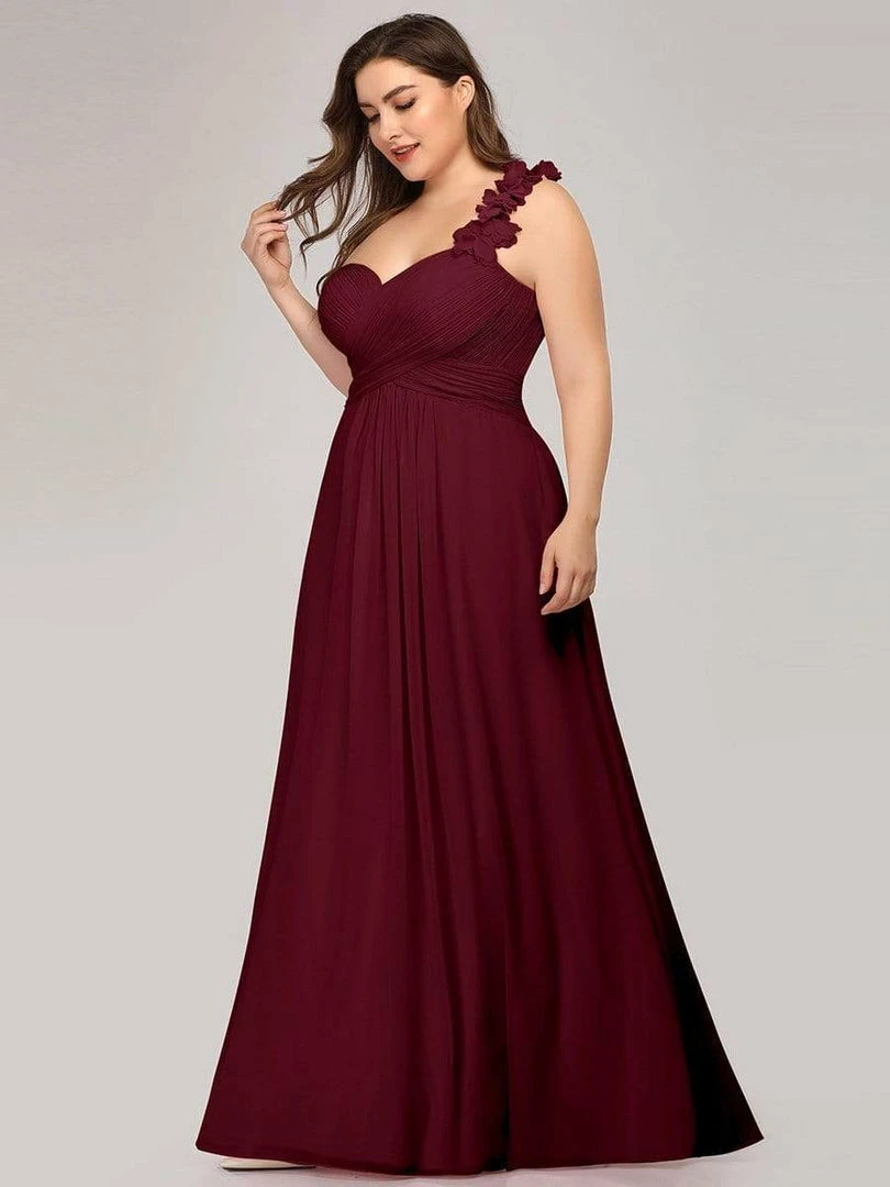 This plus size one-shoulder bridesmaid gown features a flattering ruched sweetheart neckline with a draping lower design in the lower half of the silhouette. The flower detailing on the single shoulder strap gives the maid of honor dress a sweet touch. Really perfect for all formal occasions, from evening party, cocktail, weddings to prom, homecoming, and graduation!