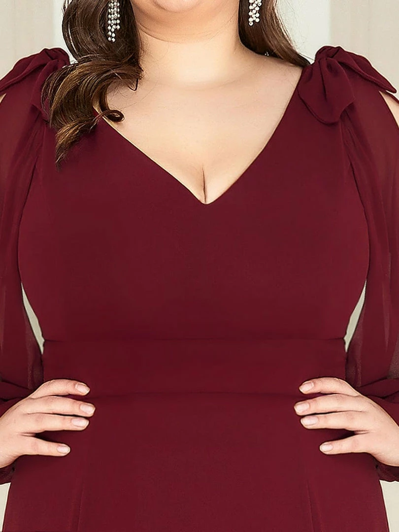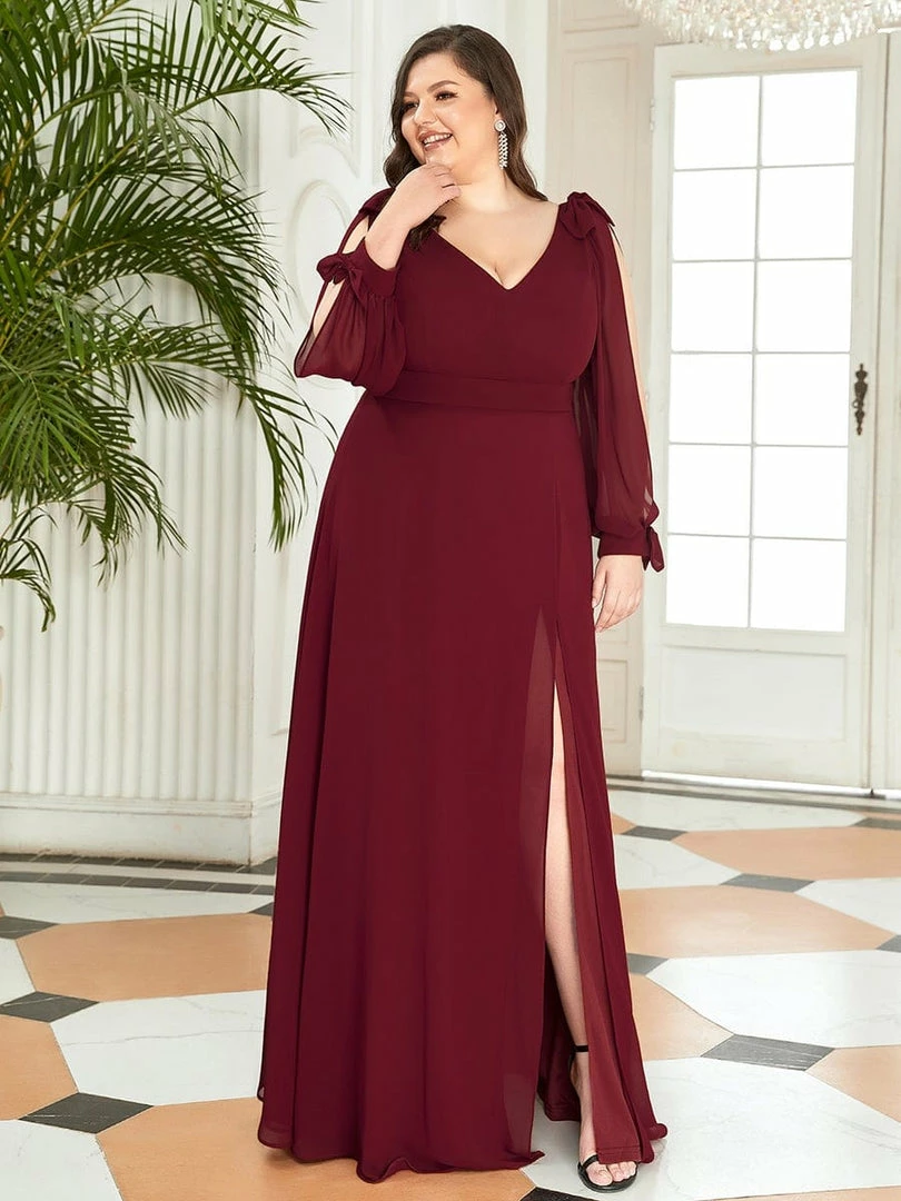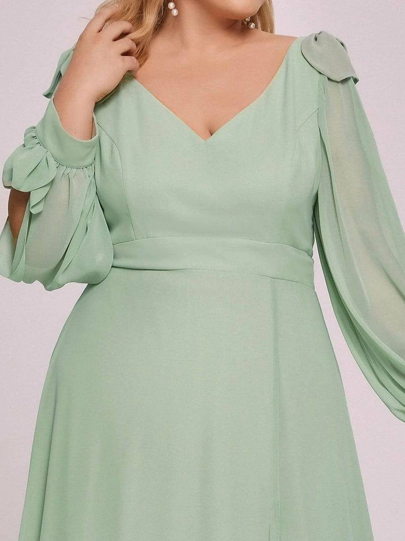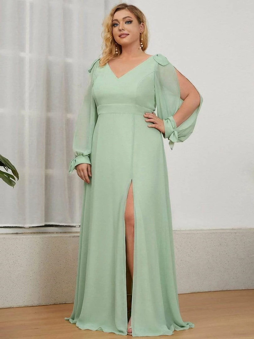 A front slit on this floor-length A-line bridesmaid dress turns up the heat for a look that mixes classic elegance and sultry style. Long open sheer lantern sleeves exude a vintage inspiration, finished with a v-neck that awaits your bridal necklaces.