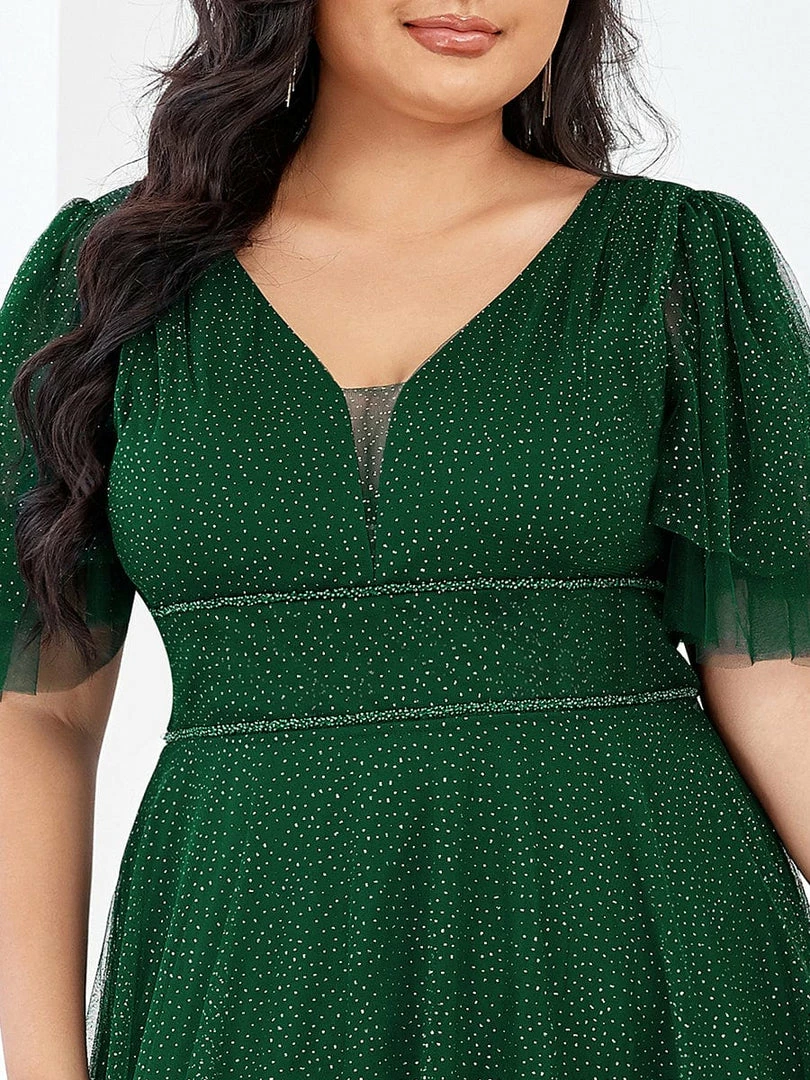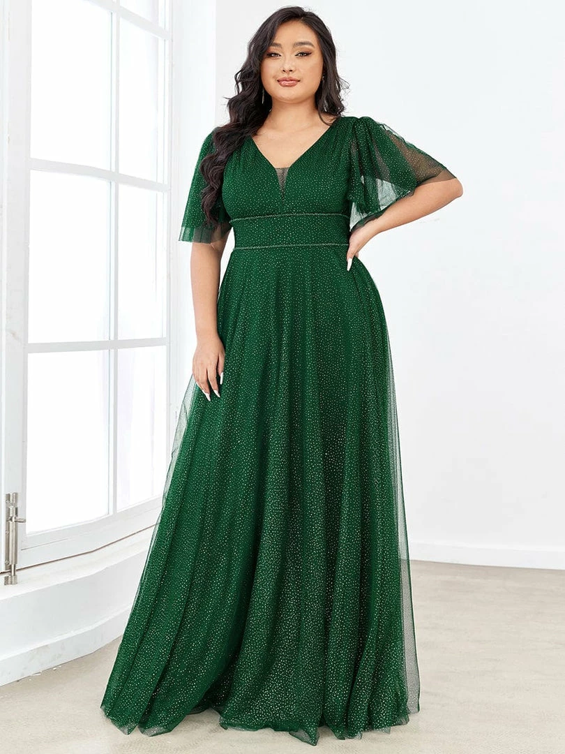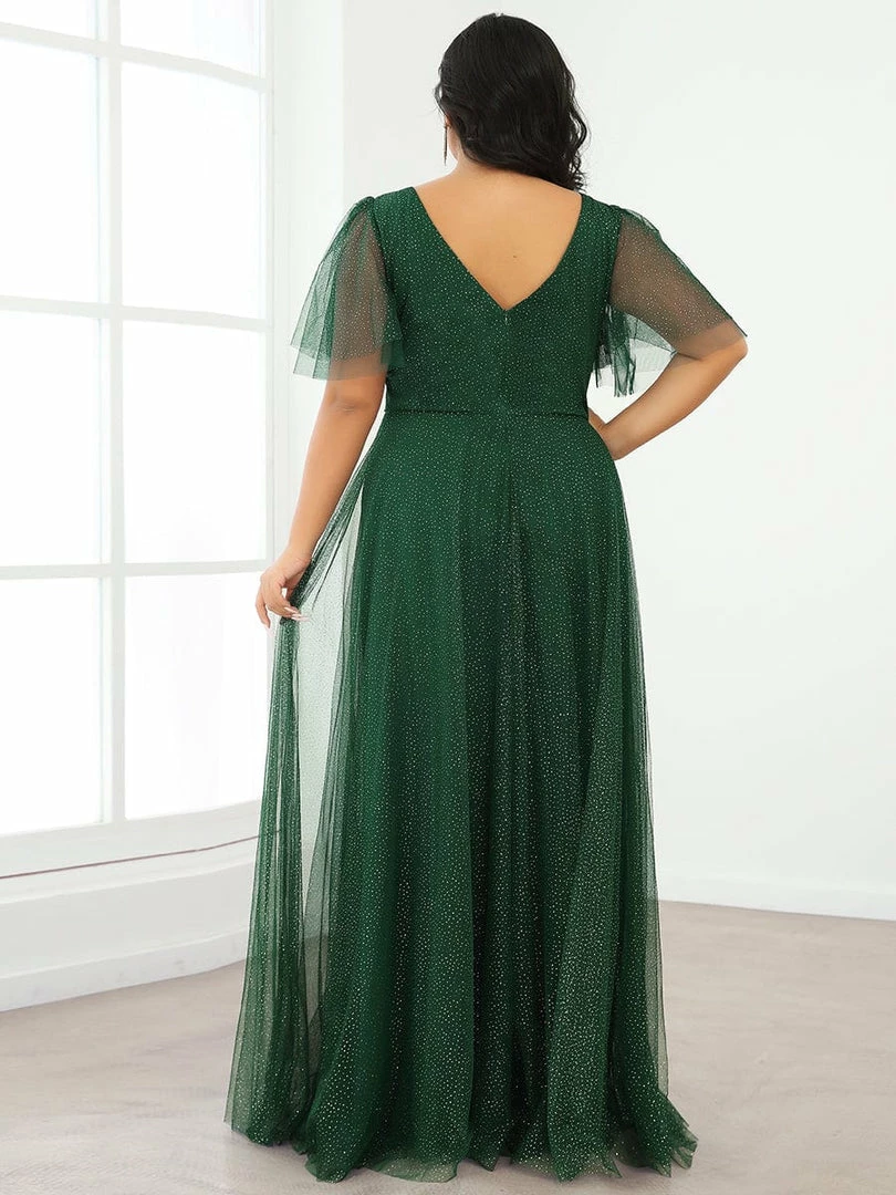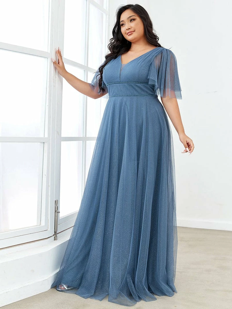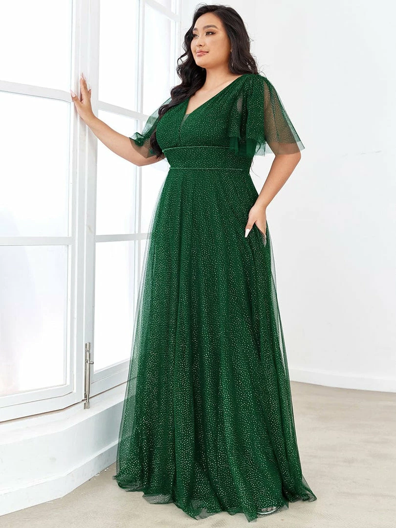 This plus size cute tulle evening dress with golden stamps will give you a sophisticated fancy look from head to toe. Its ruffle sleeves with a plunging neckline will make you look super cute. Beautiful bead lace sewn parallel on slimming waistline and hot V-neck on the back is the elegant combination. The finished look defines the floor-length shimmering tulle with gold stamps all over to make it a super pick for any evening party, wedding, or prom, etc.