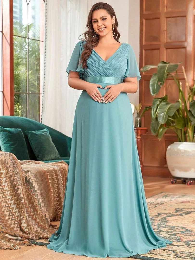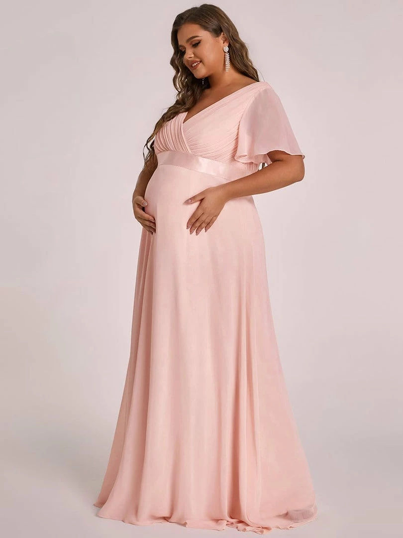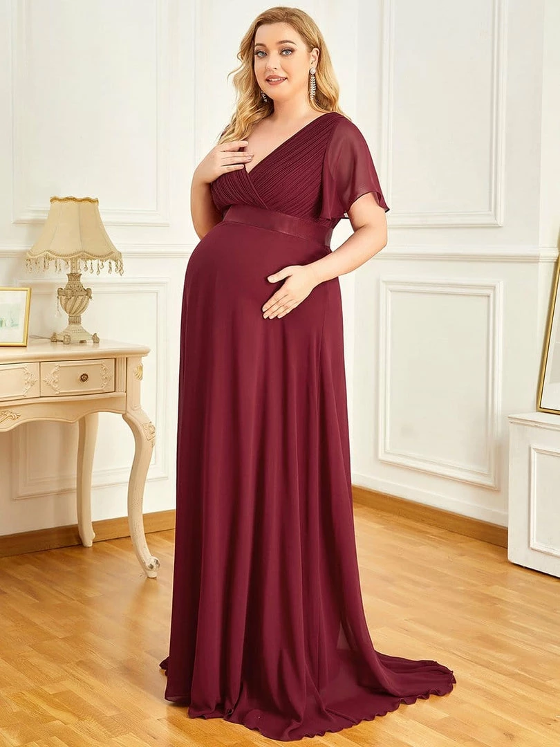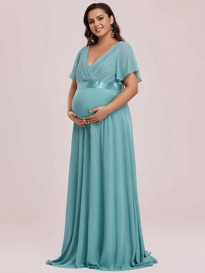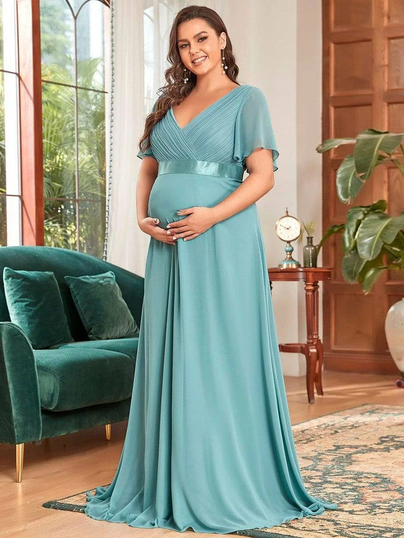 Wear this gorgeous floor-length maternity evening dresses for your next special event! This feminine A-line dress features ruffle sleeves and a textured top, along with a cinched ribbon waist. The long skirt gives this stunning maternity evening dresses a formal style, perfect for a wedding, banquet, concert, or dinner.