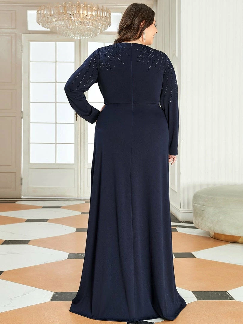 This sophisticated mother of the bride dress leaves a lingering impression of elegance and unique style. Streams of sparkling sequins on the shoulders, cinched waist, and plunging v-neckline offer the perfect balance of bodycon fit and long-wear comfort. A slit in the front exposes your heels of choice.