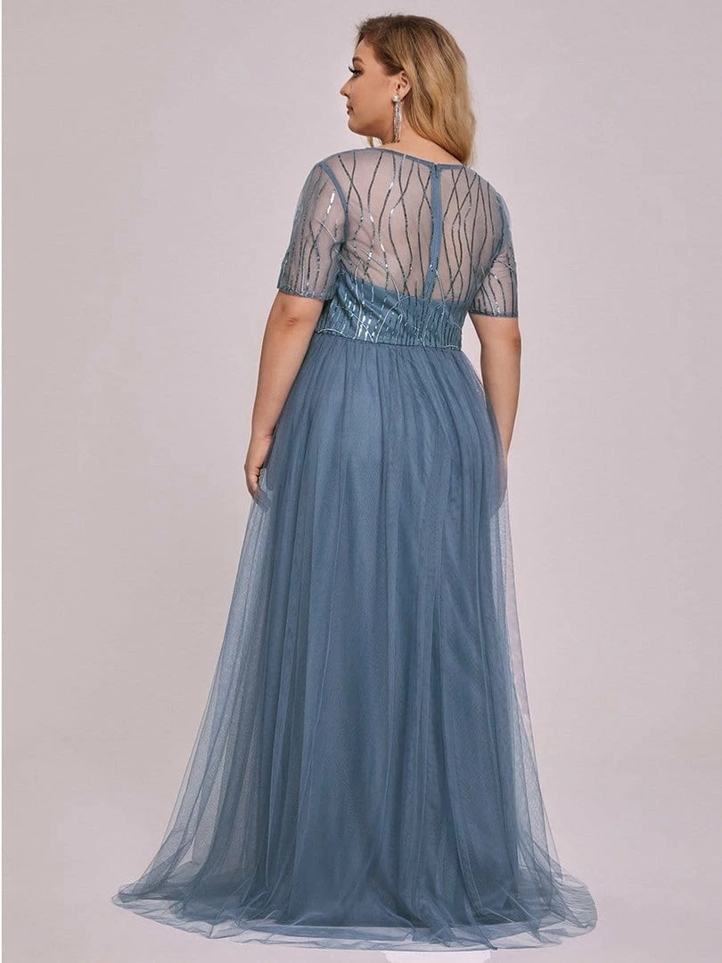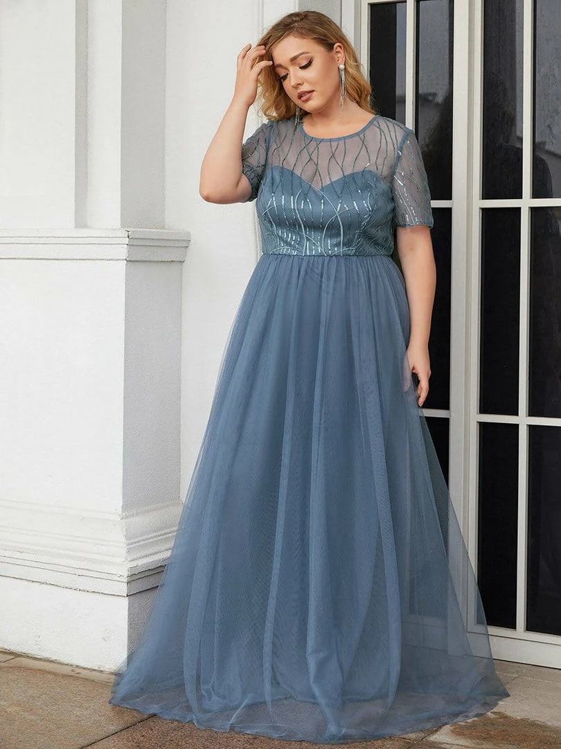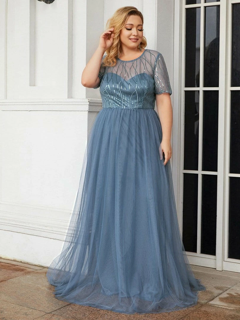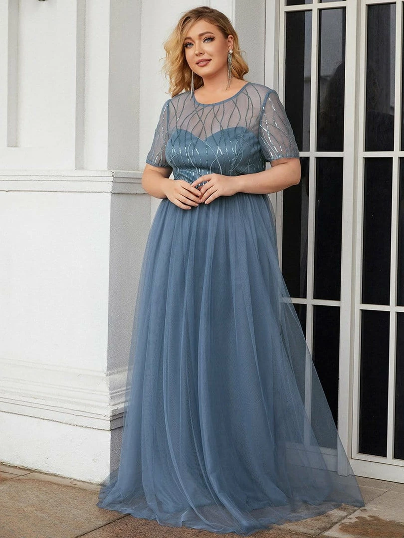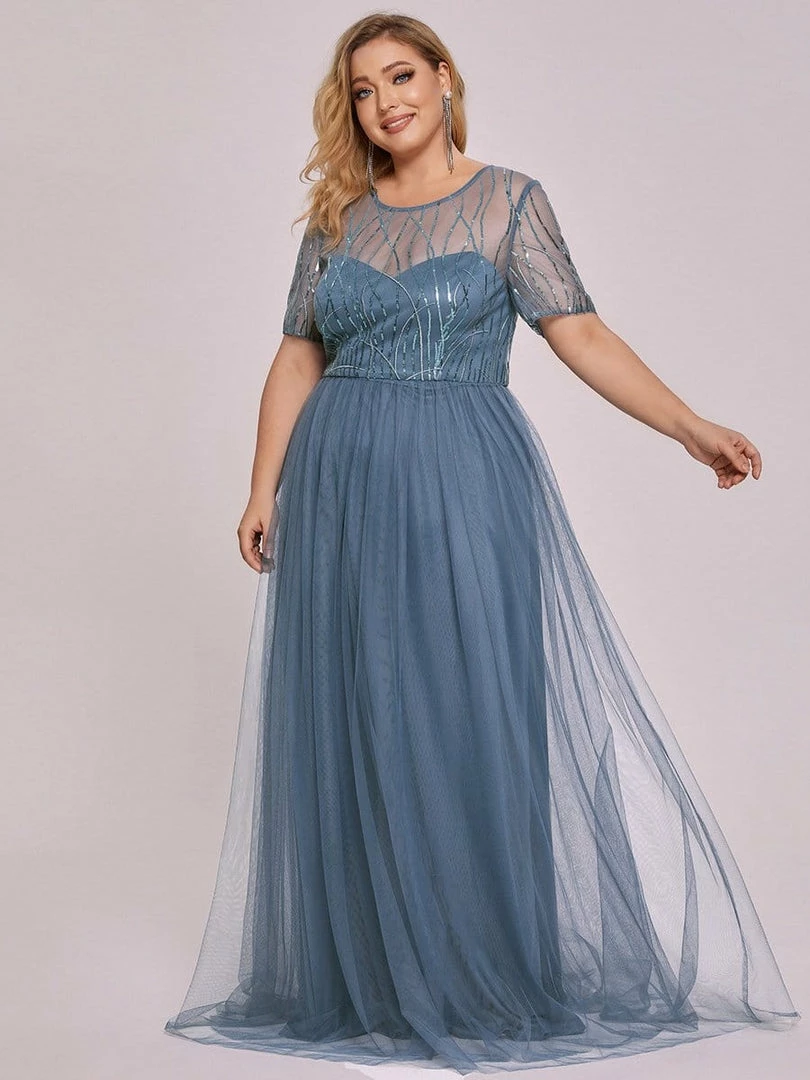 This mature plus size mother of the bride dress is effortlessly elegant, featuring a sheer short-sleeved top with a sweetheart neckline. Sparkling streams of sequins on top, a cinched waist, and a flowing A-line layered silhouette make this plus size mother of the bride dress remarkable, perfect for a wedding, mother of the bride, dinner, or any formal event.