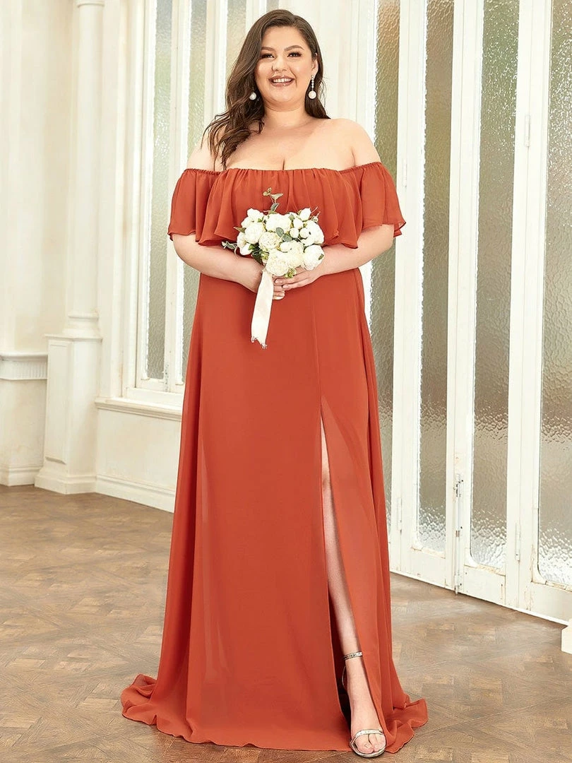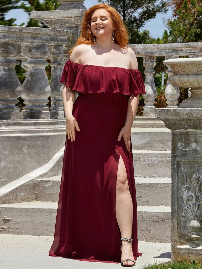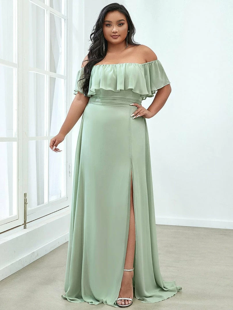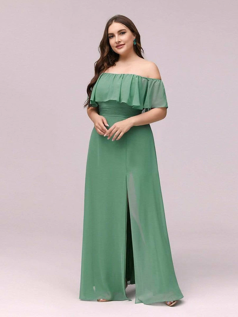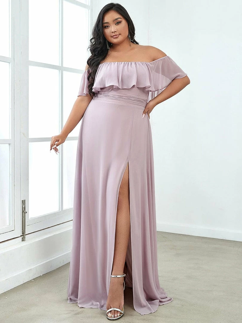 This sexy plus size formal dress features beautiful ruched waist creates a figure flattering empire waistline while the elastic in the back creates a comfortable fit for all day wear. The thigh high slit allows the plus size dress to spin beautiful and move with you on the dance floor.