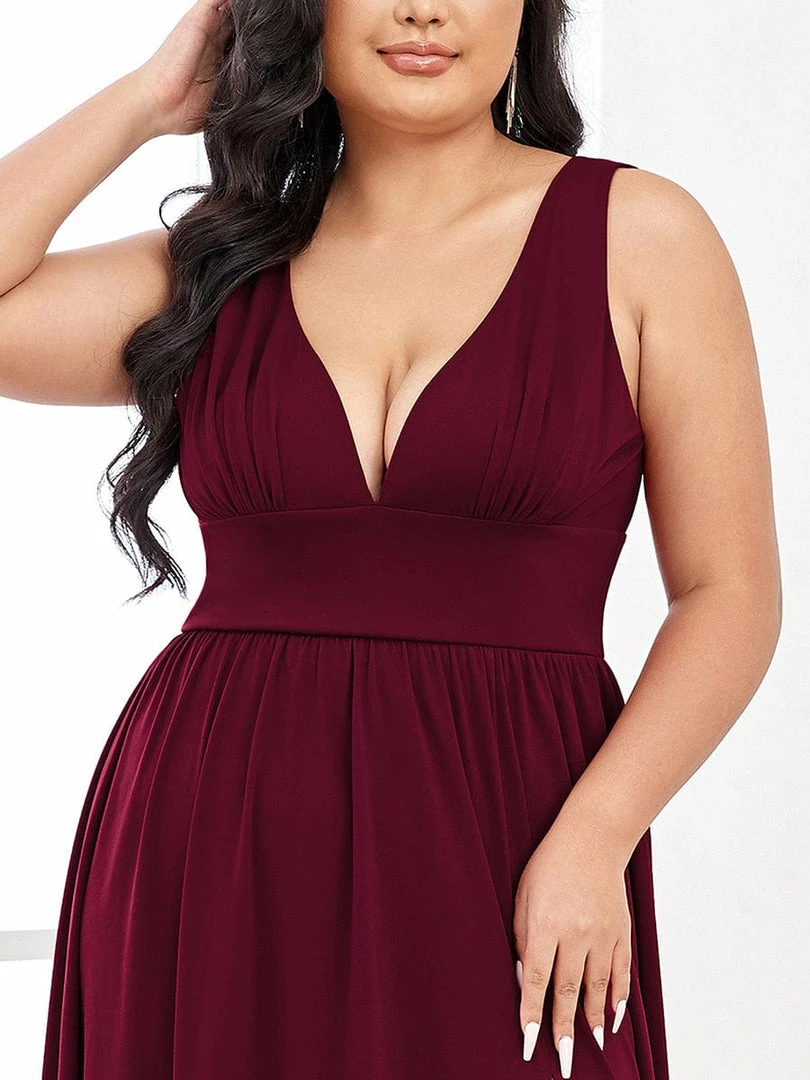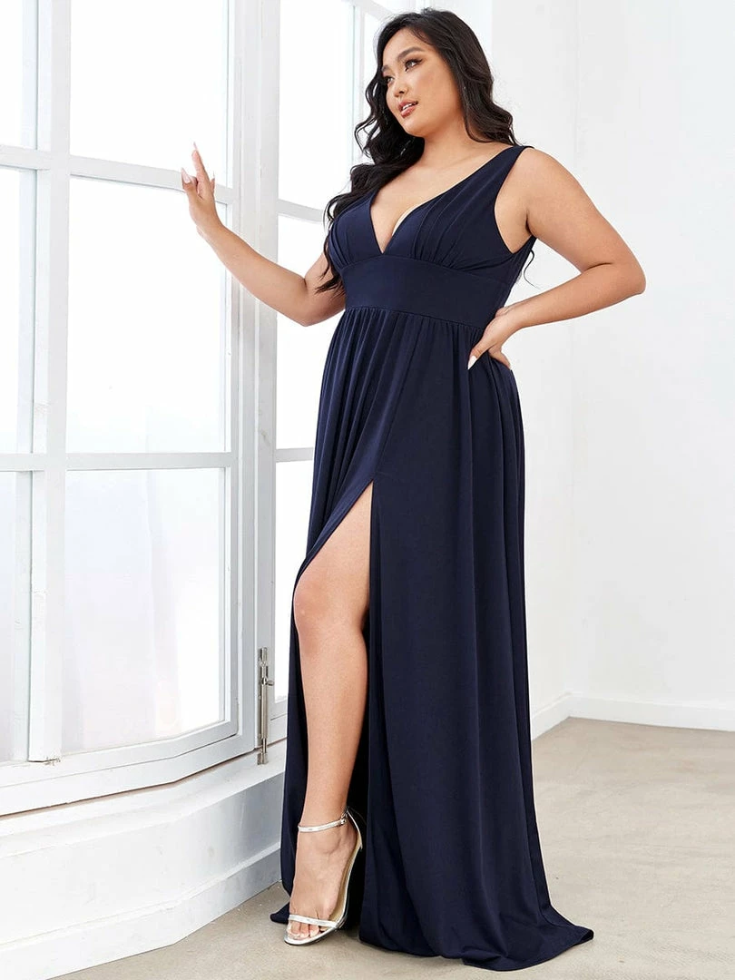 This elegant floor-length evening dress is suitable for different events with its classic style and daring front slit. A sleeveless top and plunging v-neckline give way to a wide cinched empire waist and pleating, providing the perfect fit worthy of any photo. Pair this versatile and beautiful dress with your favorite heels.