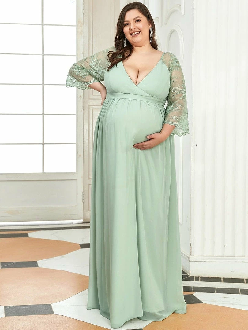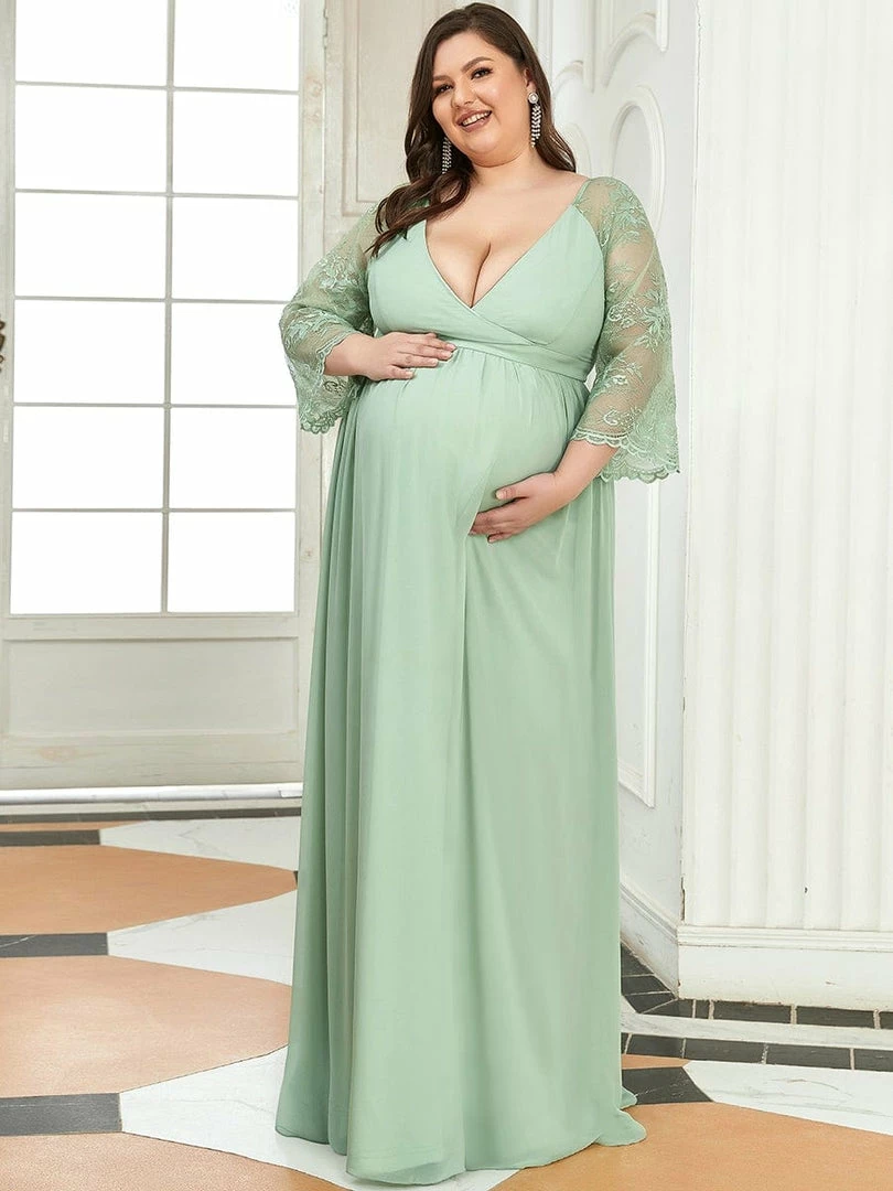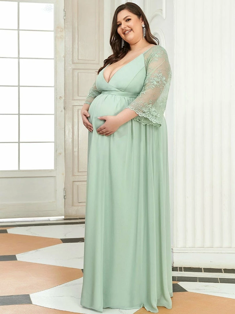 Celebrate any formal occasion with this vintage-style plus size formal maternity dress. Gorgeous long lace sleeves and a plunging v-neckline await your favorite jewelry pairing. The bump-friendly elastic waist and flowing floor-length fit offer comfort and elegance, ideal for a wedding, worn as a bridesmaid dress, or to a luncheon.