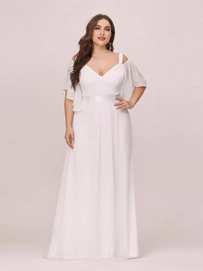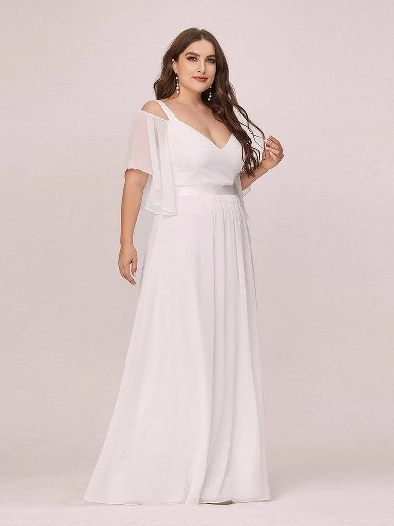 This romantic plus size off the shoulder bridesmaid dress features a empire waist, flutter sleeves, and belt design. The shoulder straps are unadjustable. This comfortable chiffon off shoulder semi formal dress with sleeves is perfect for summer beach or any weddings. Also suitable for evening party, cocktail, prom, homecoming, graduation, weddings, and any other formal affair!Prices will vary as certain colors of this style is on sale.