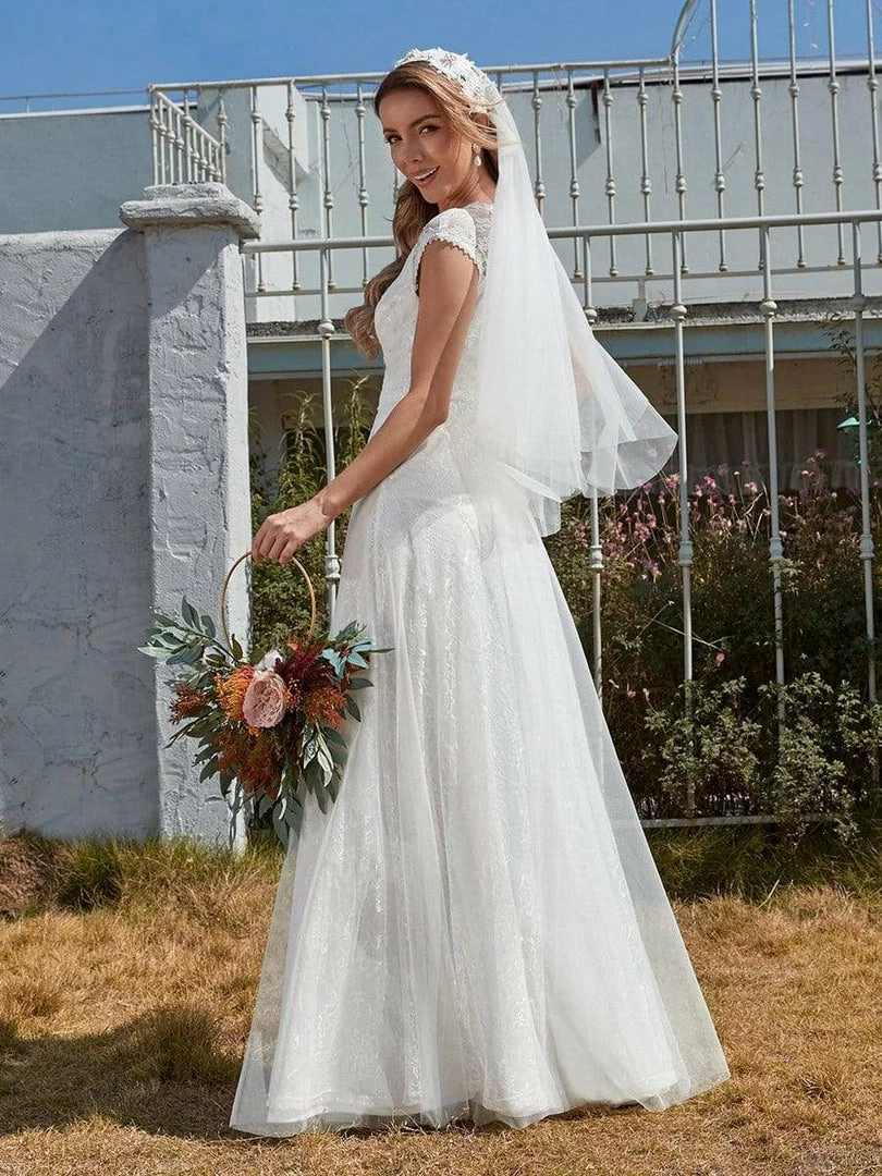 Featuring a sexy deep V neckline, cap sleeves, a floor length A-line skirt, and delicate floral lace decorates the top which gives this wedding dress a romantic air. We think this gorgeous dress is perfect for all formal occasions, from evening party, cocktail, weddings to prom, homecoming and graduation!