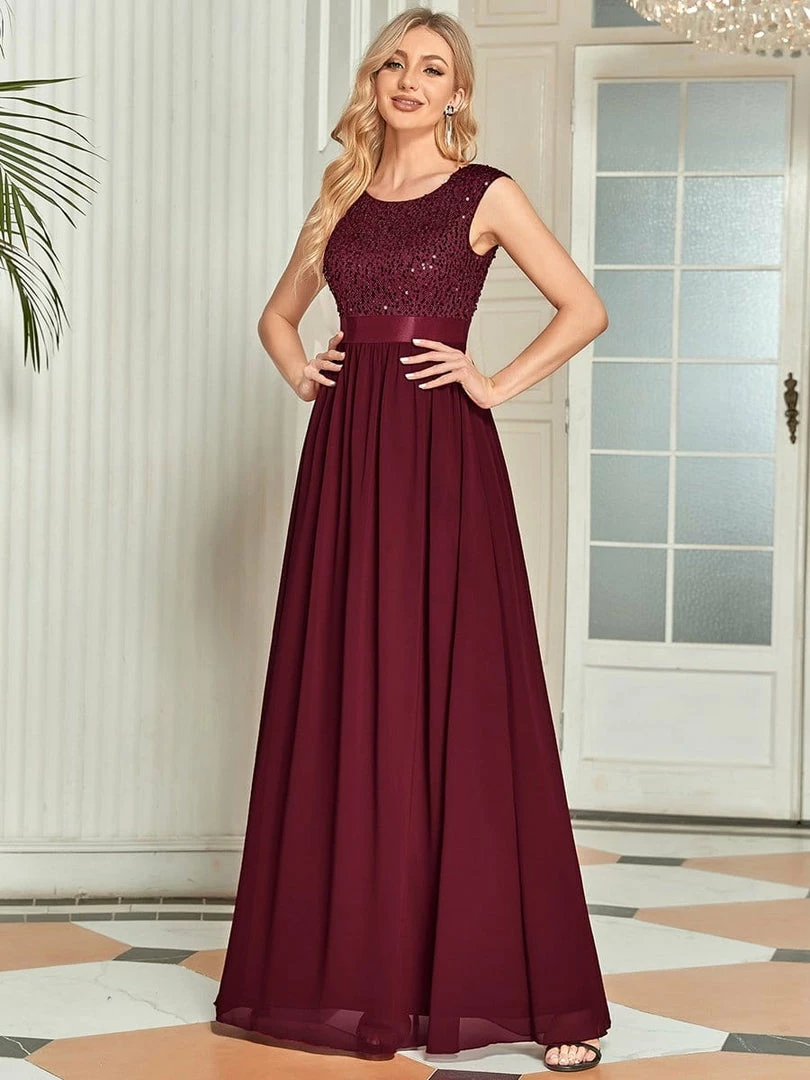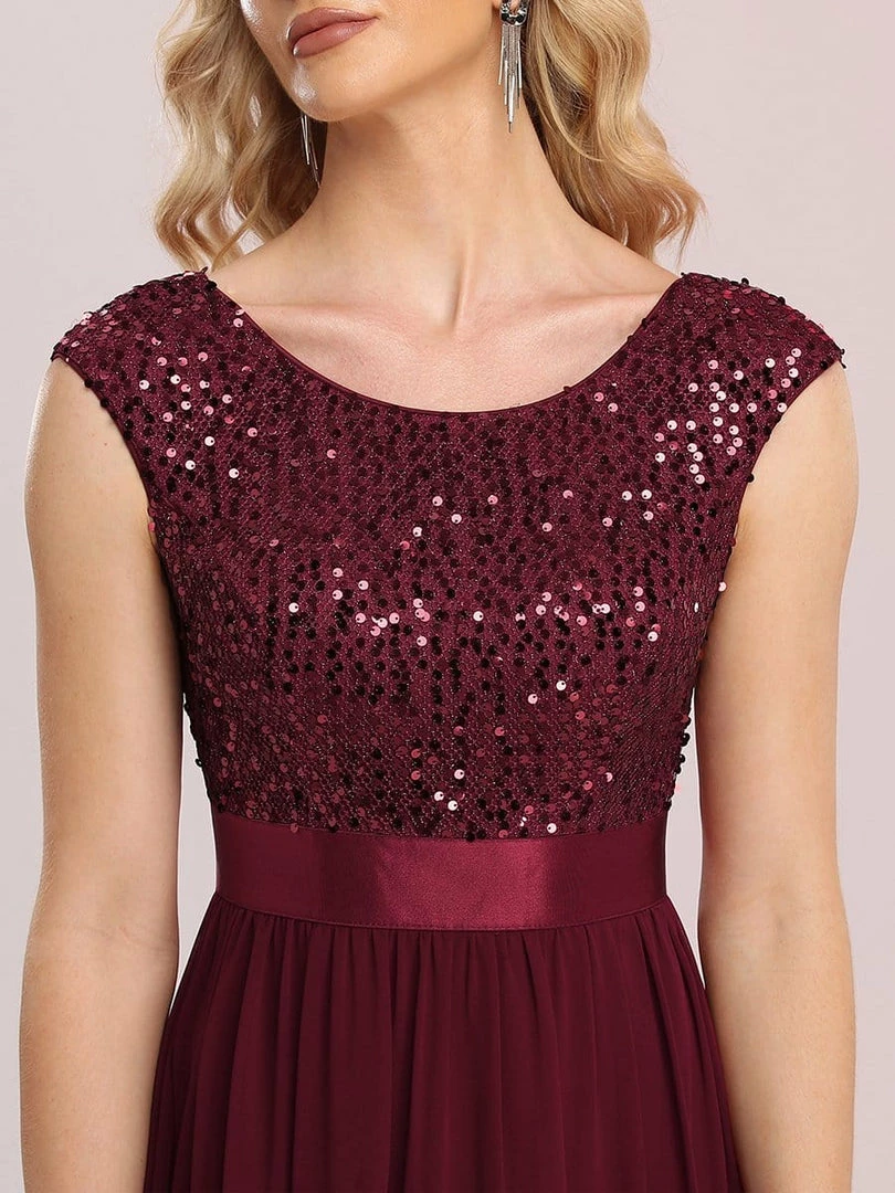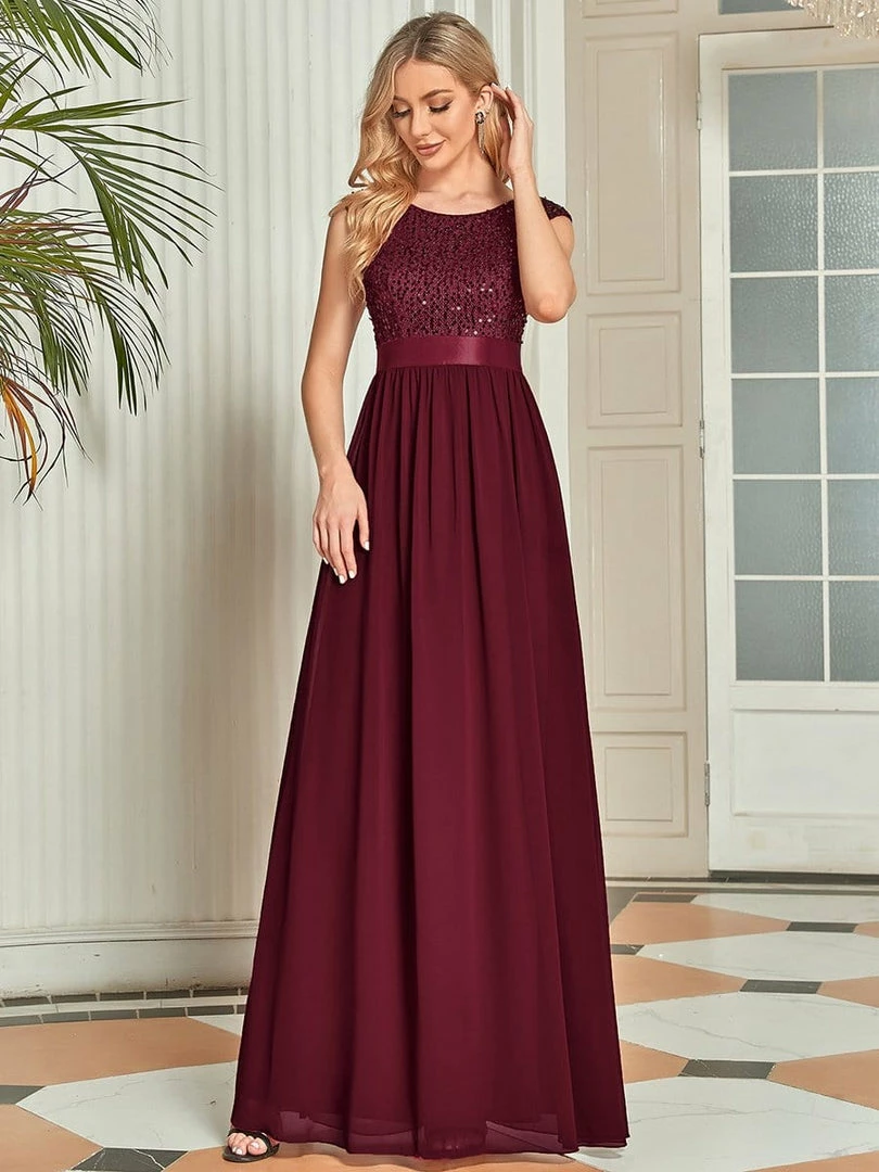 This sophisticated floor-length evening dress features sparkling sequins on top with a round collar and a short sleeve/sleeveless fit just in time for the warmer months. The waist is accentuated with luxurious ribbon detail, finished with a flowing A-line silhouette. Wear this elegant gown to a wedding, as a mother of the bride dress, to a banquet, or a concert with heels or flats.