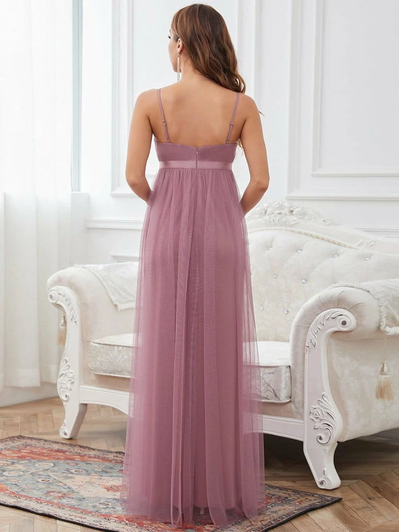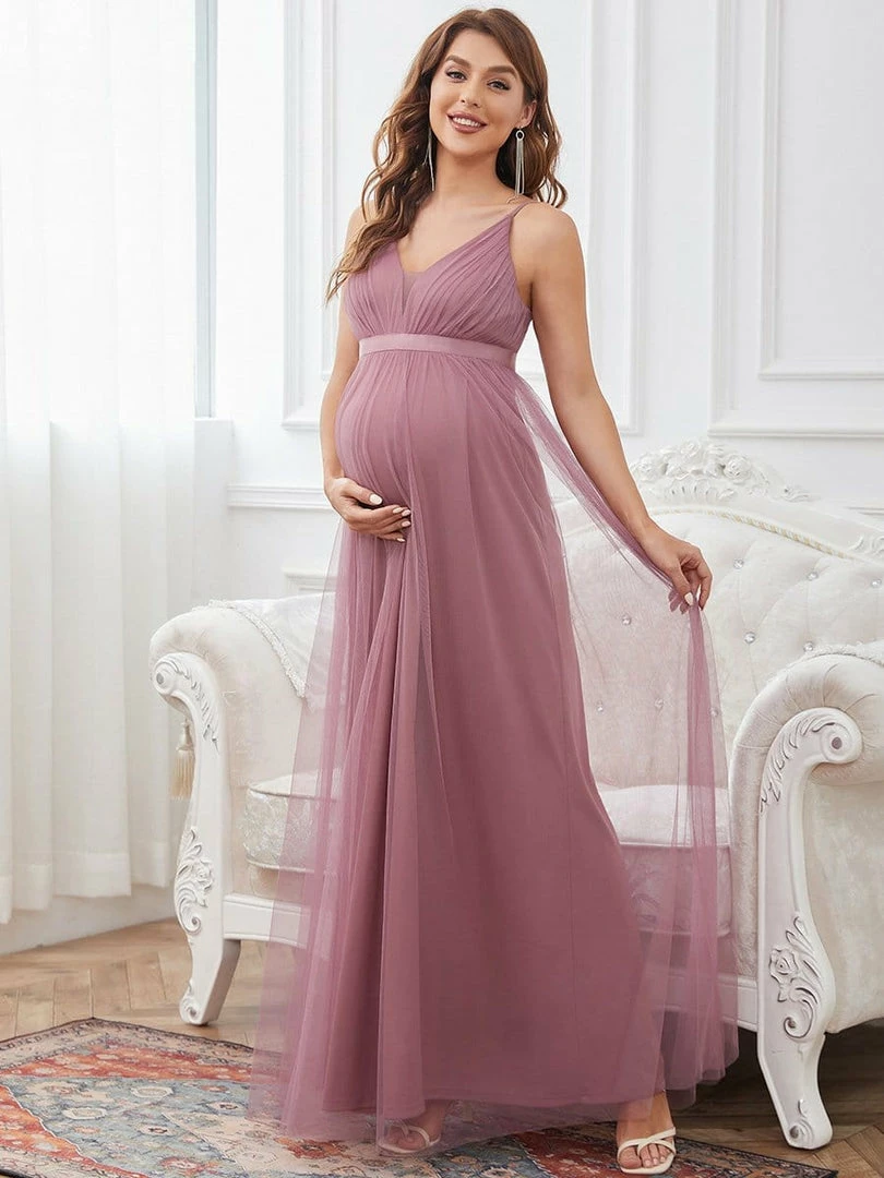 A plunging v-neckline and tapered spaghetti straps give this sleeveless maternity dress pure elegance. A comfortable cinched waist and A-line silhouette add a formal look. Wear this maternity dress to any special occasion and complement it with your favorite heels or flats.