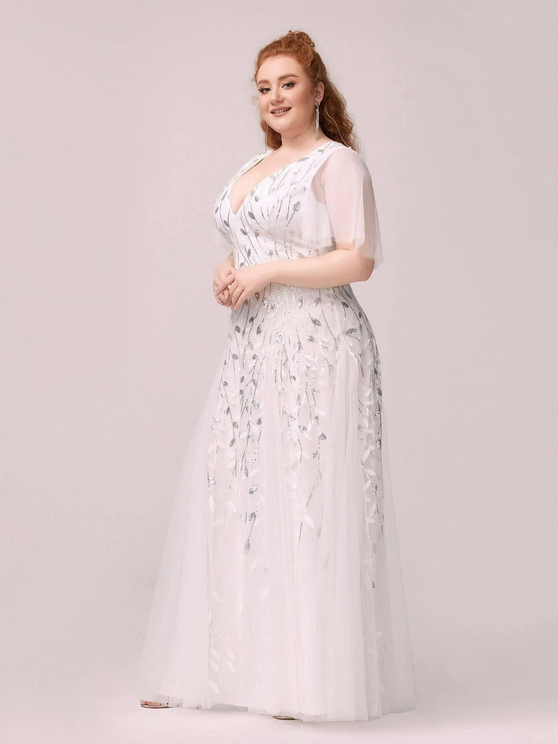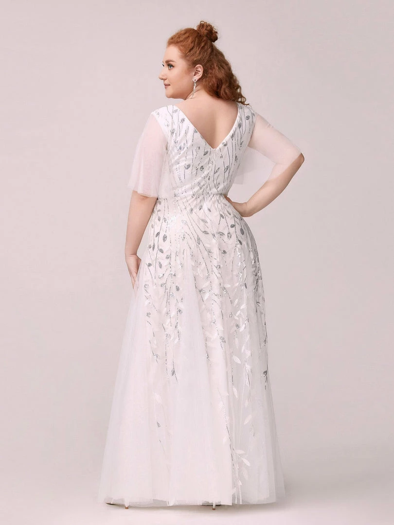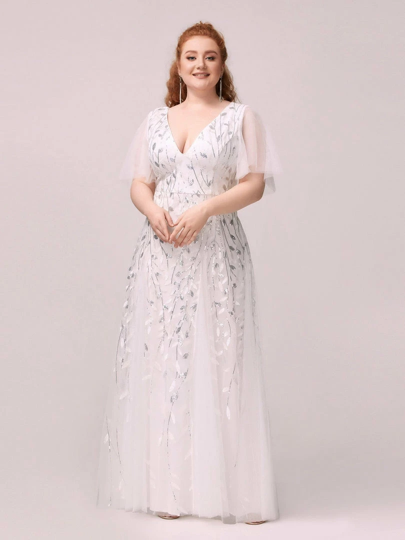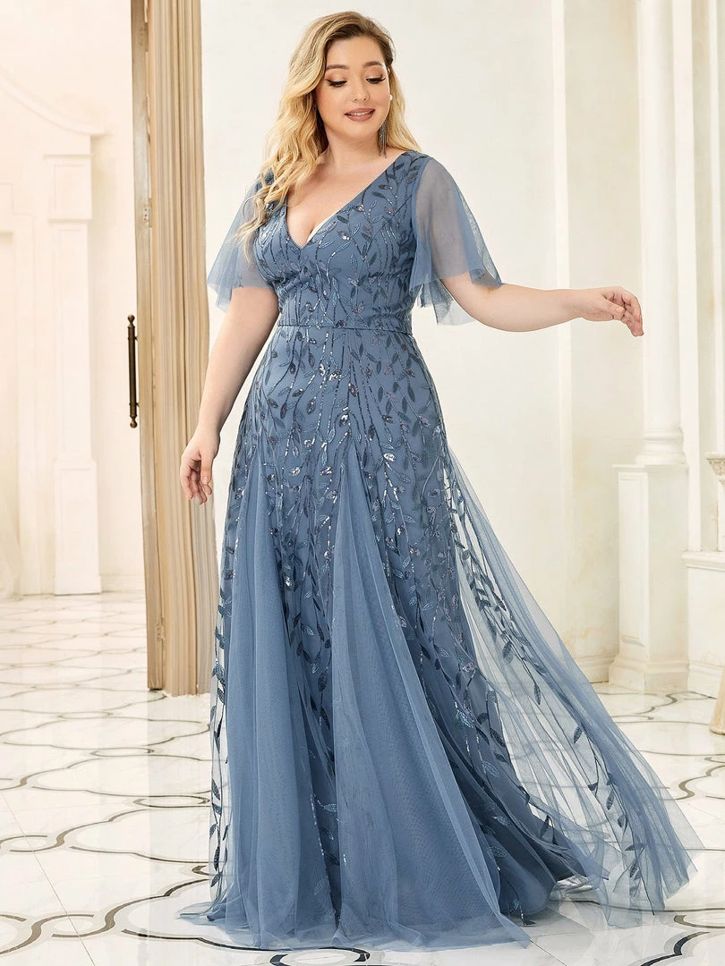 This shimmery maxi long evening gown features a double deep V neckline and ruffles sleeves. The shimmery leave design gives a romantic vibe. No matter what occasion,?this long tulle evening dress with sleeves will make you look gorgeous and elegant. Suitable for evening party, cocktail, weddings, prom, homecoming and graduation!?Prices will vary as certain colors of this style is on sale.