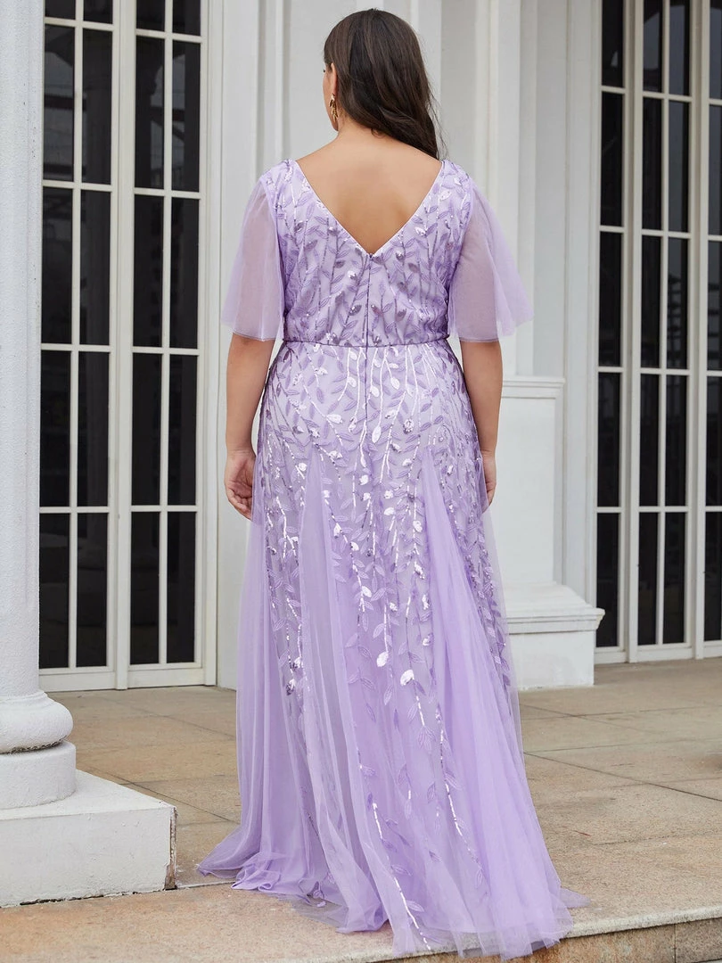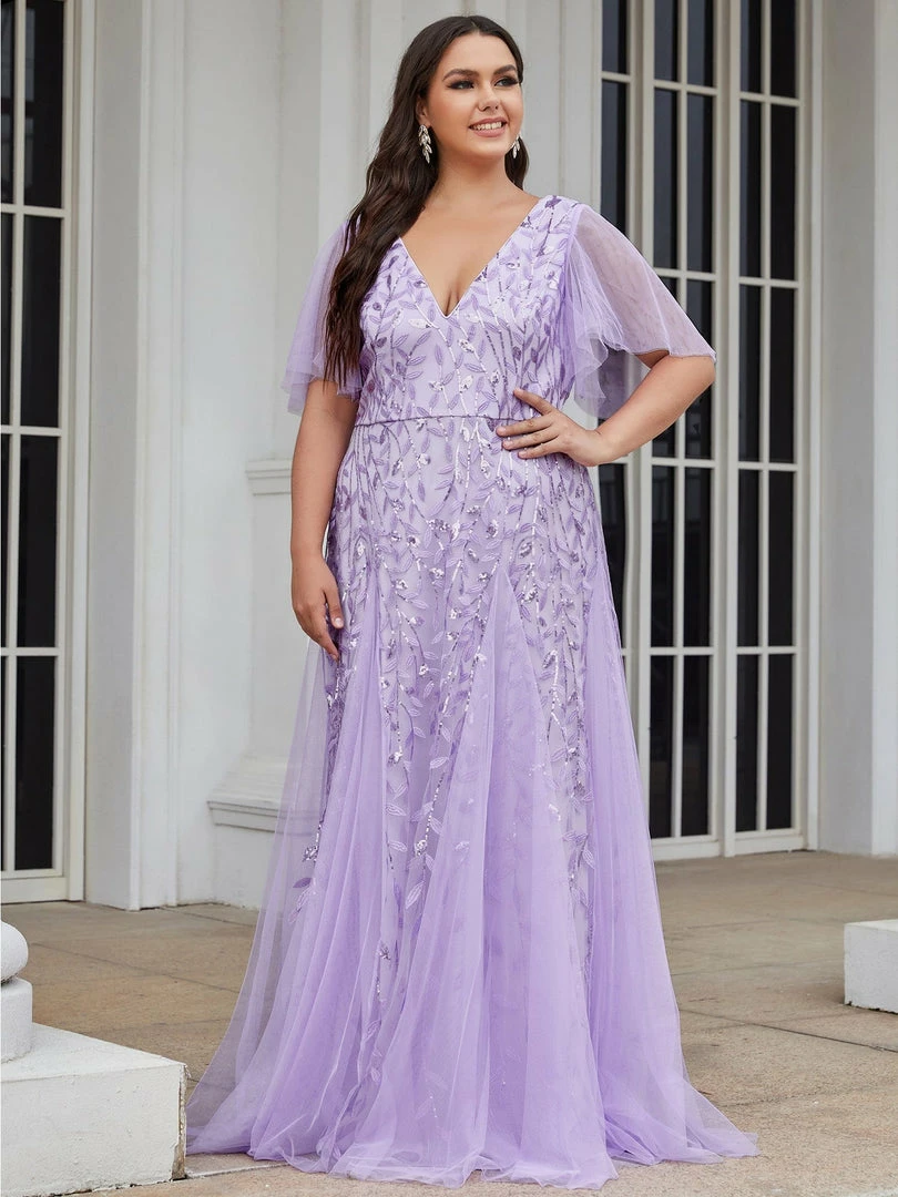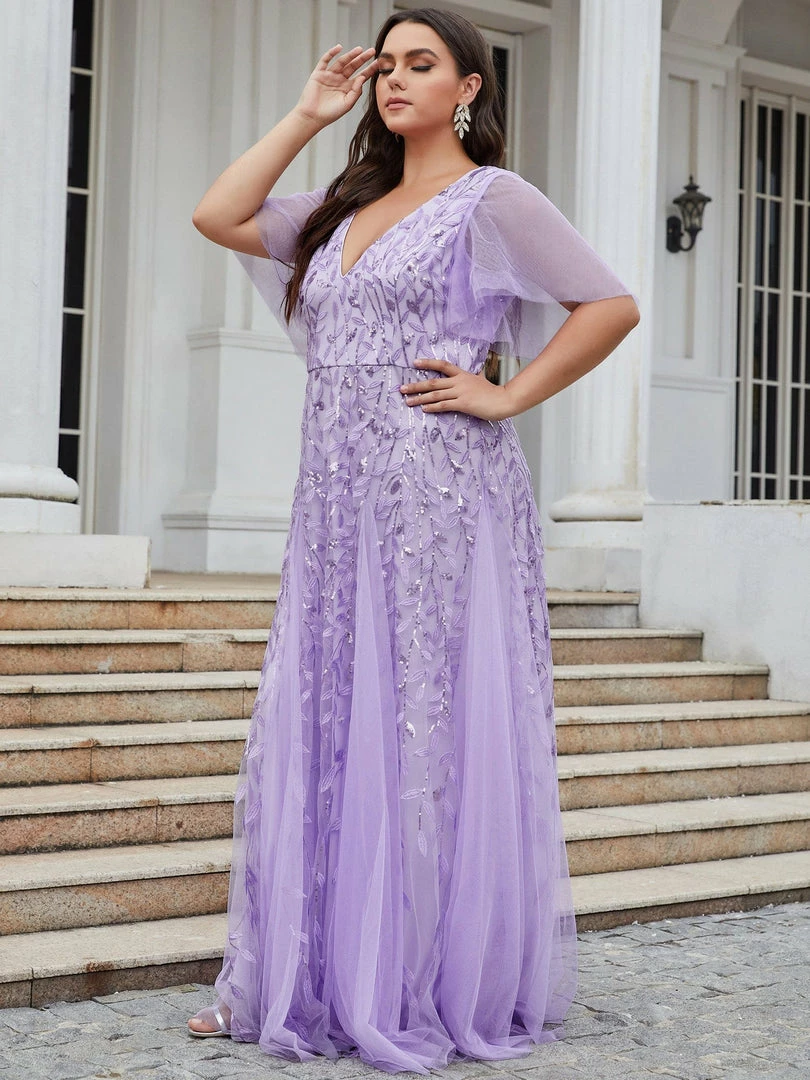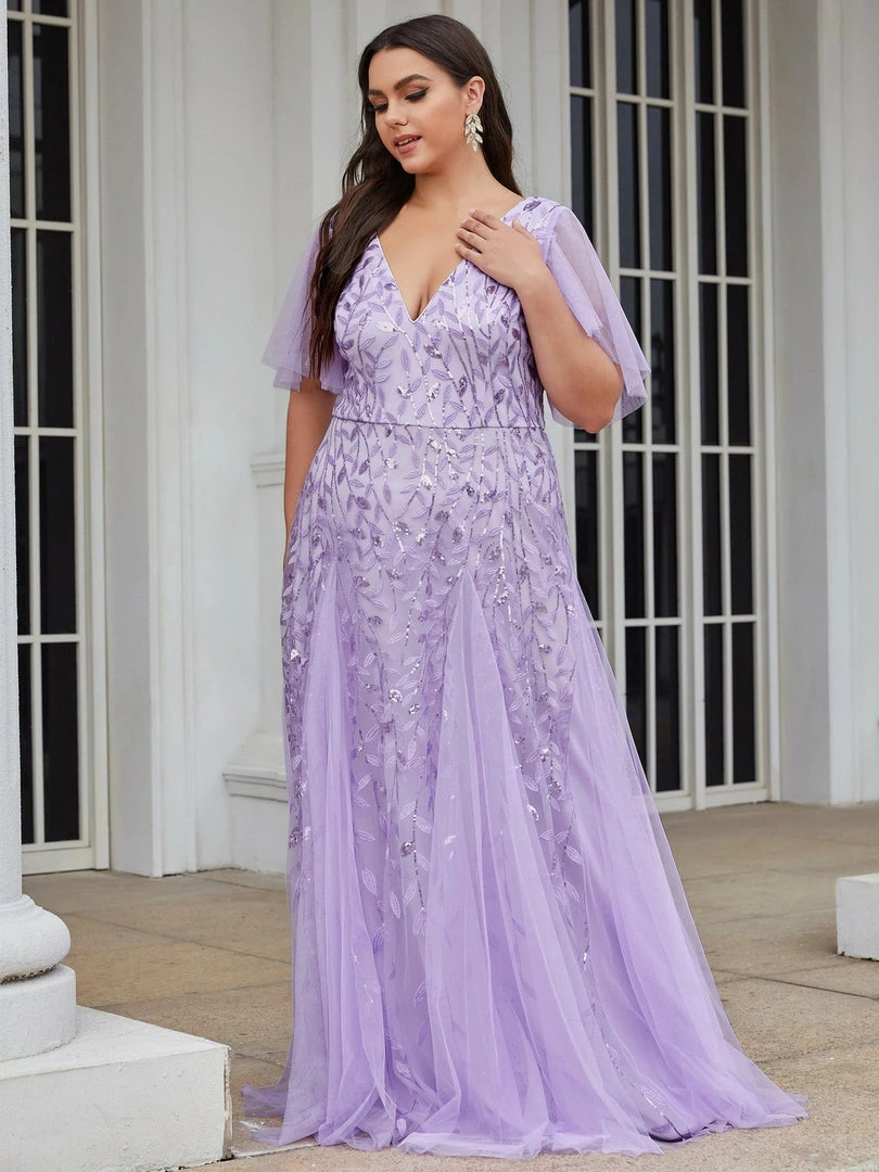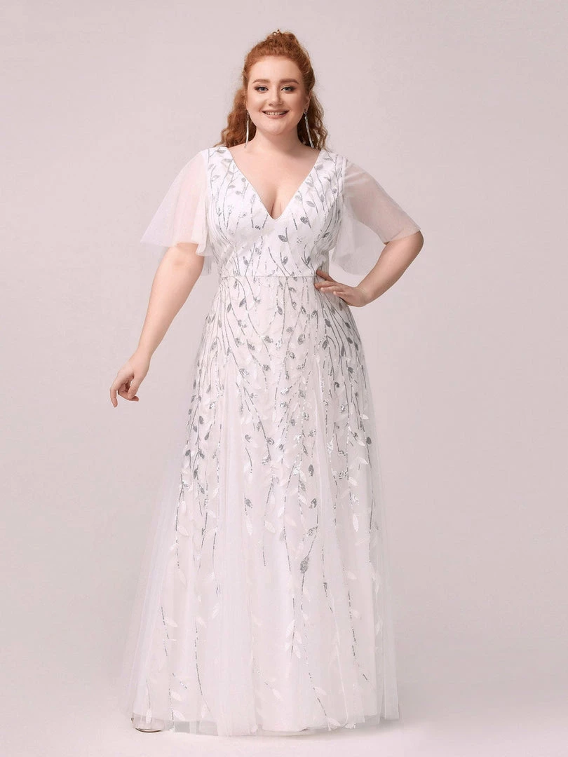 This shimmery maxi long evening gown features a double deep V neckline and ruffles sleeves. The shimmery leave design gives a romantic vibe. No matter what occasion,?this long tulle evening dress with sleeves will make you look gorgeous and elegant. Suitable for evening party, cocktail, weddings, prom, homecoming and graduation!?Prices will vary as certain colors of this style is on sale.