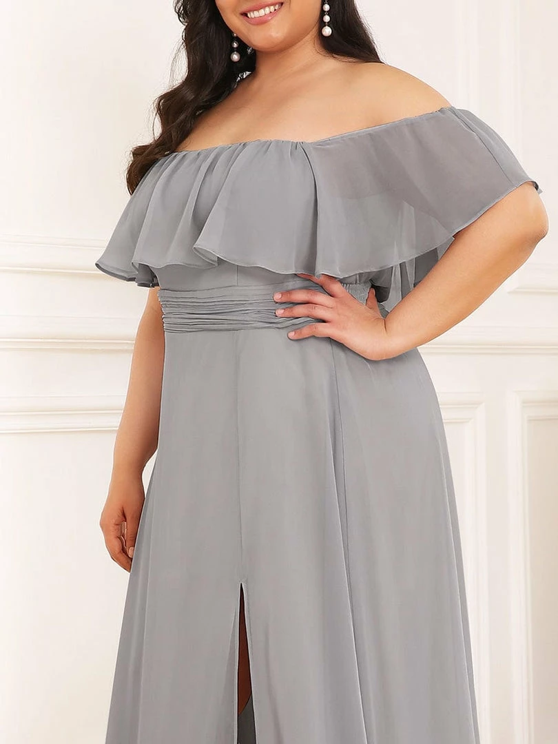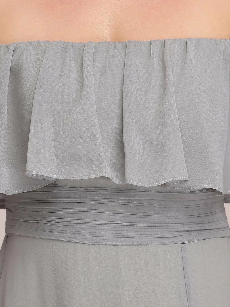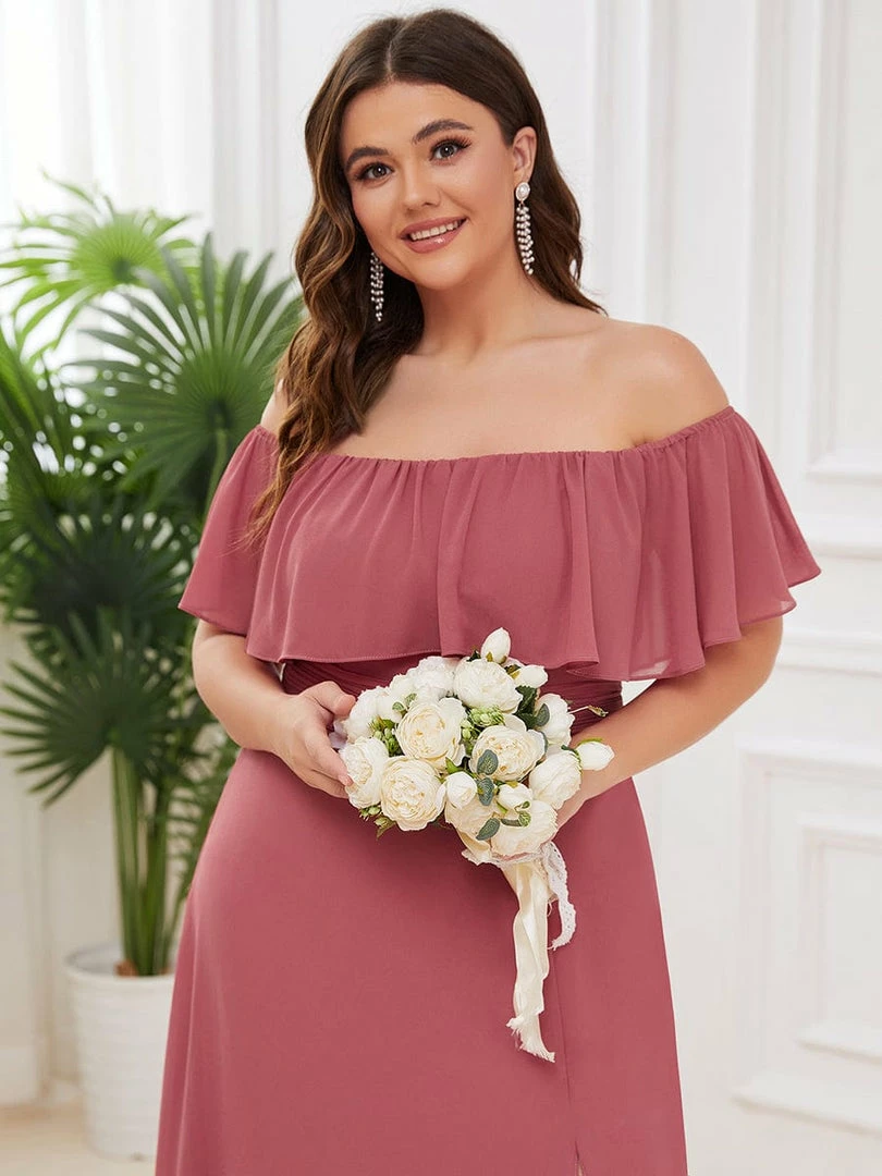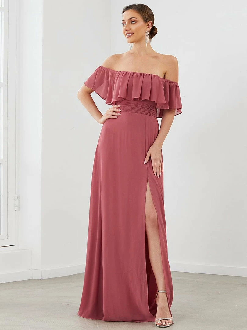This romantic long flowy bridesmaid dress features a flowy off-shoulder neckline and floor-length skirt with a thigh-high slit. We think it’s perfect to wear this off the shoulder bridesmaid dress at any wedding, evening, party, cocktail, prom, homecoming, graduation or as a holiday vacation dress.