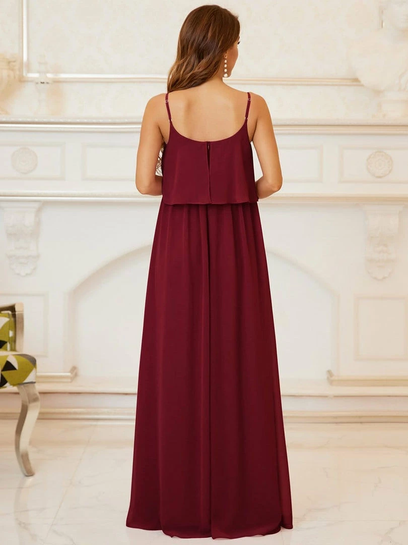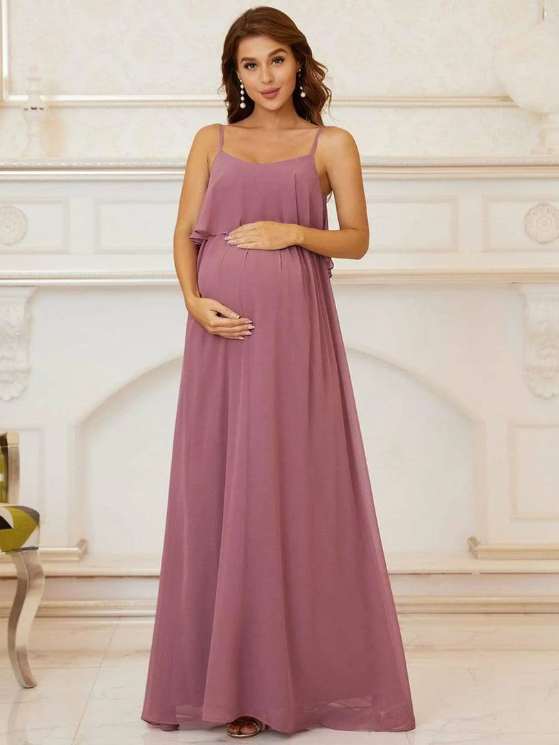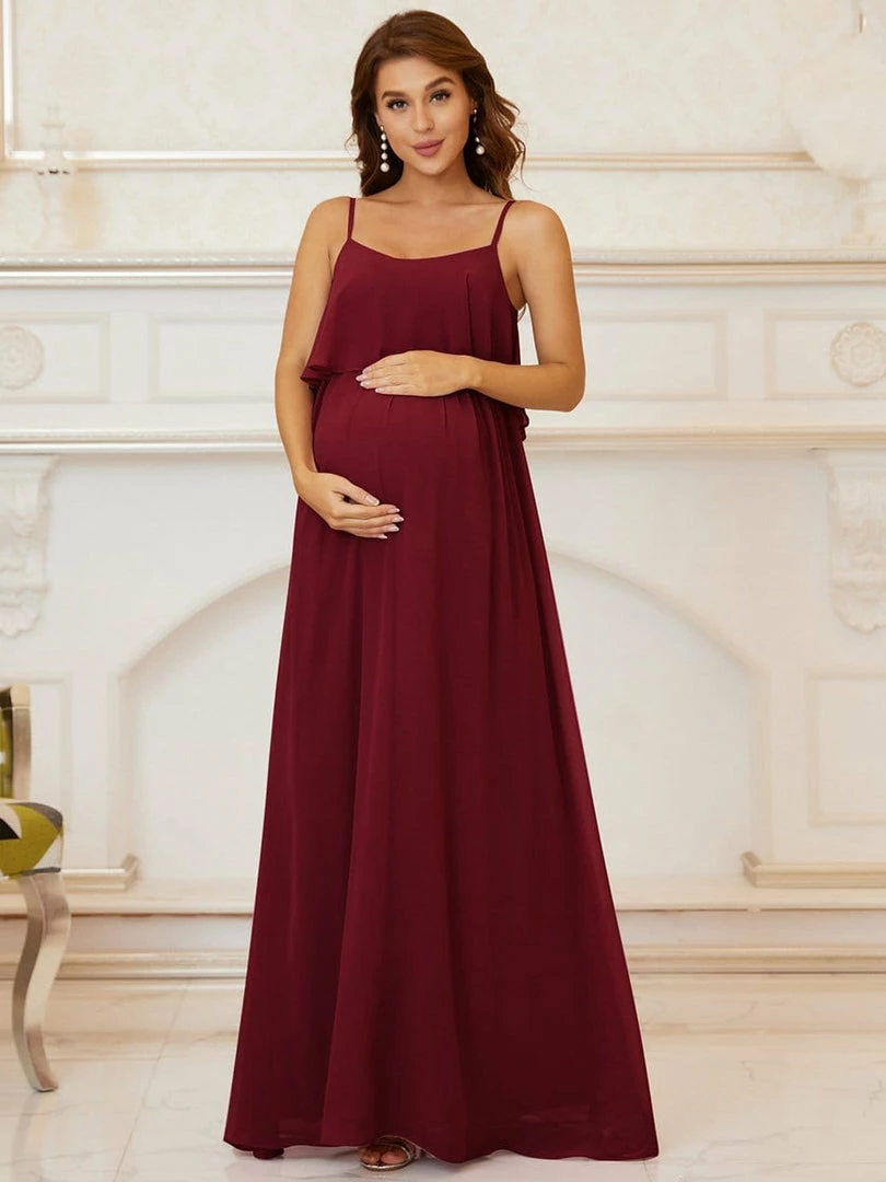 Get summer-ready with this beautiful maternity maxi dress! This floor-length maternity dress features a comfortable elastic waist and flattering ruffled top, along with slender spaghetti straps and a billowy skirt, making it the perfect complement to any occasion.