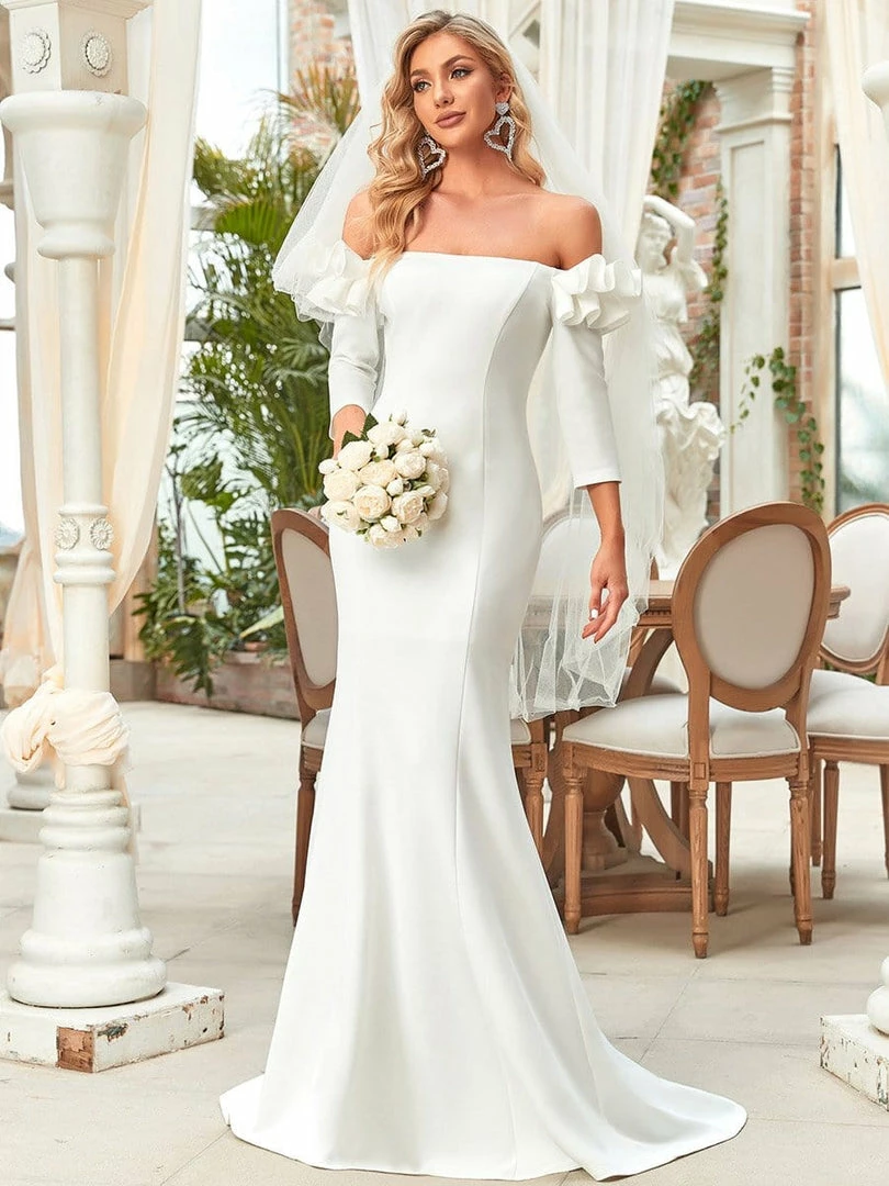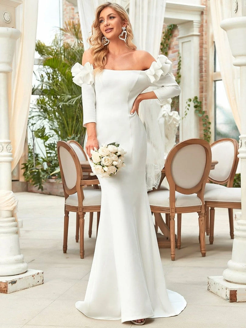Celebrate your special event in elegance wearing this off-shoulder long sleeve wedding dress, ideal for a memorable wedding, as a perfect bridal gown. The cinched bodice features darts for extra support, along with a flowing floor-length fishtail fit and feminine ruffles on the top of each shoulder.