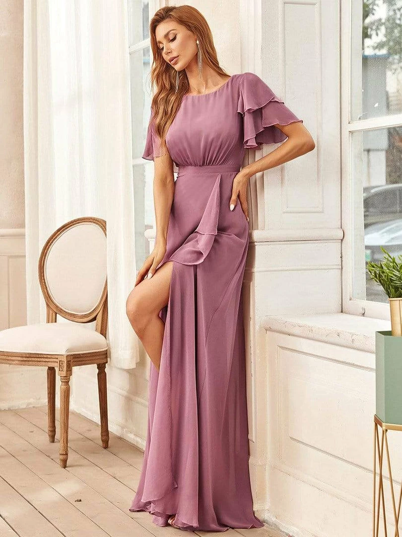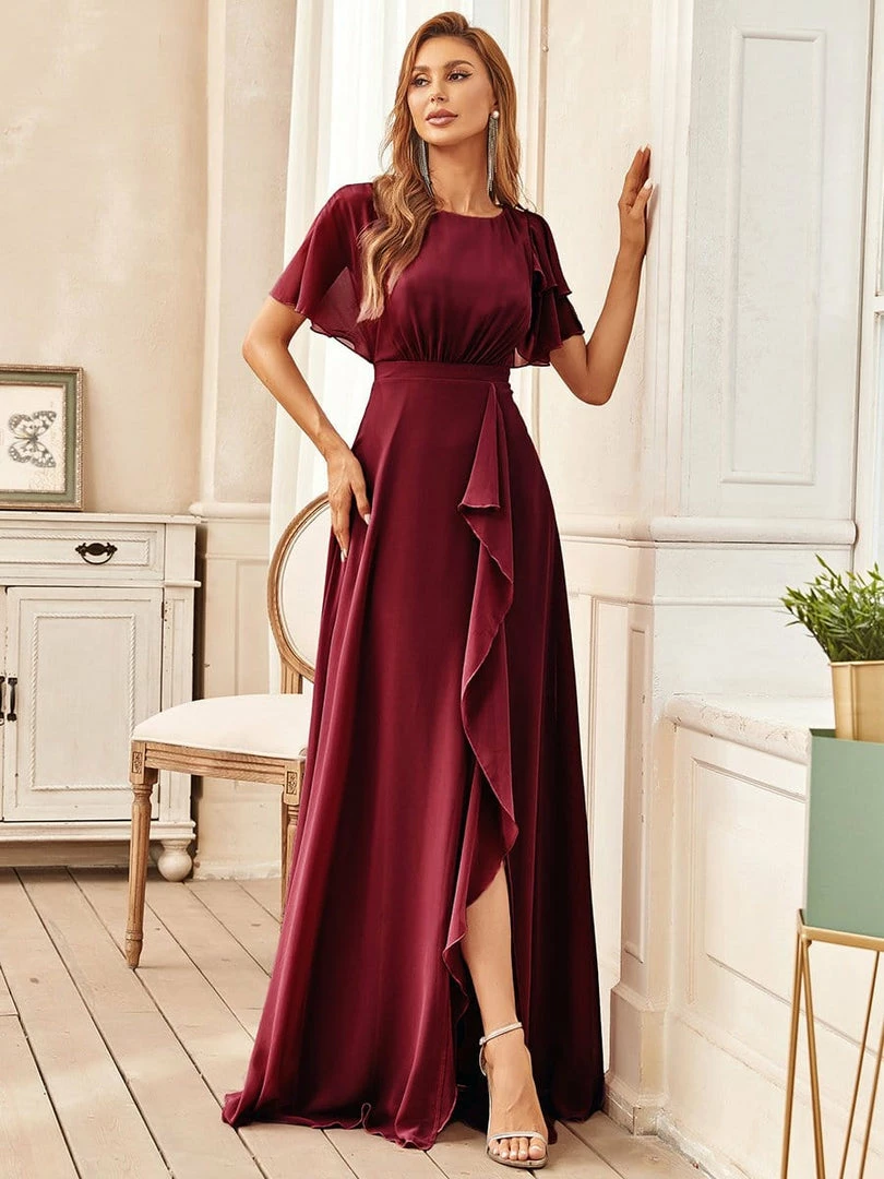 Celebrate your next formal event wearing this gorgeous ruffled A-line evening dress. This sophisticated floor-length evening dress features fluttered sleeves, a comfortable cinched waist, and a front slit, perfect for showing off your shoes of choice. Wear this elegant evening dress to a wedding, banquet, party, or other important function.