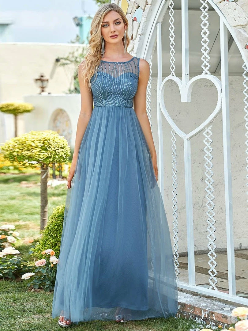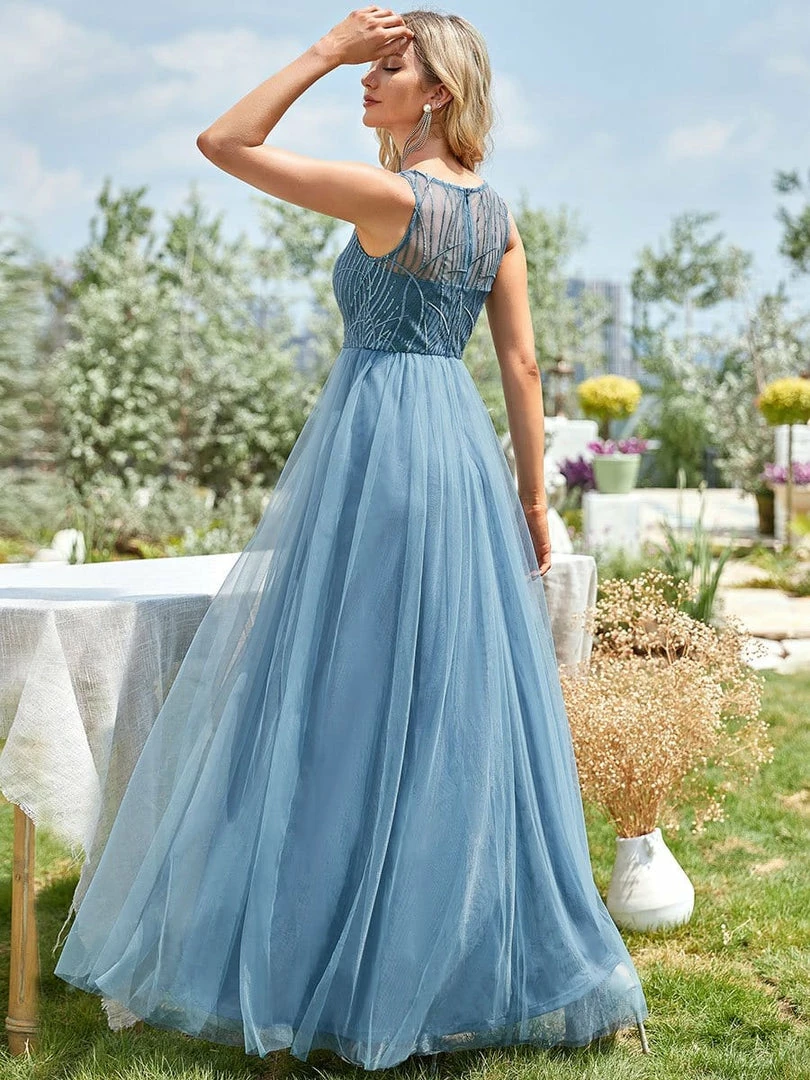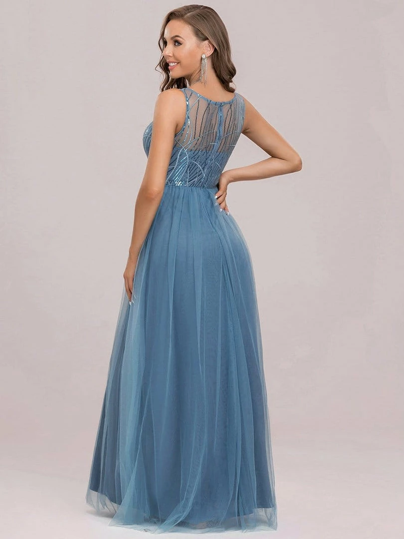 Want to look dainty and yet show your style? Then this evening dress with a floor-length A-line silhouette is specially designed for you. The round neck that has a see-through lace paillette design on the bodice is a remarkable work of art. This evening dress is sure to make you look like one in a million because of the elegance it emanates. Wear this beautiful dress to your prom or at an evening party and bedazzle everyone with your stunning charm.