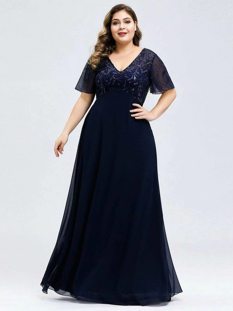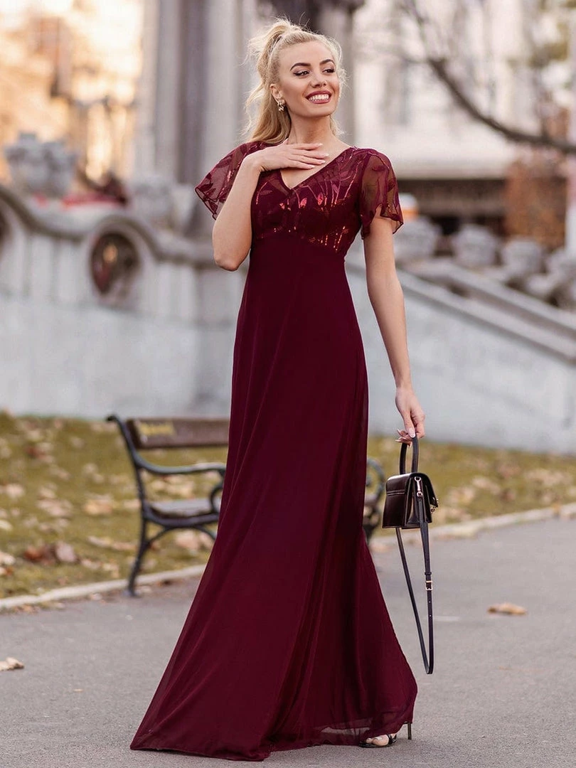 Featuring a sexy deep V neckline, ruffle sleeves and a floor-length flowy tulle skirt, this stunning short sleeves evening dress is a perfect choice for people who are looking for an elegant and sexy look. It oozes romance with the shimmery leave design on the top which add just enough flair to show your taste. We think this gorgeous evening dress is perfect for parties, cocktail, prom, homecoming, graduation, weddings, and any other formal affair! Prices will vary as certain colors of this style is on sale.