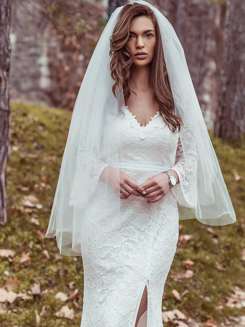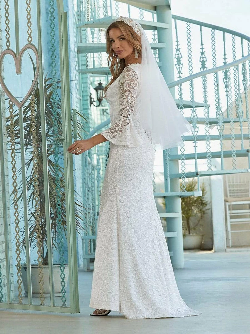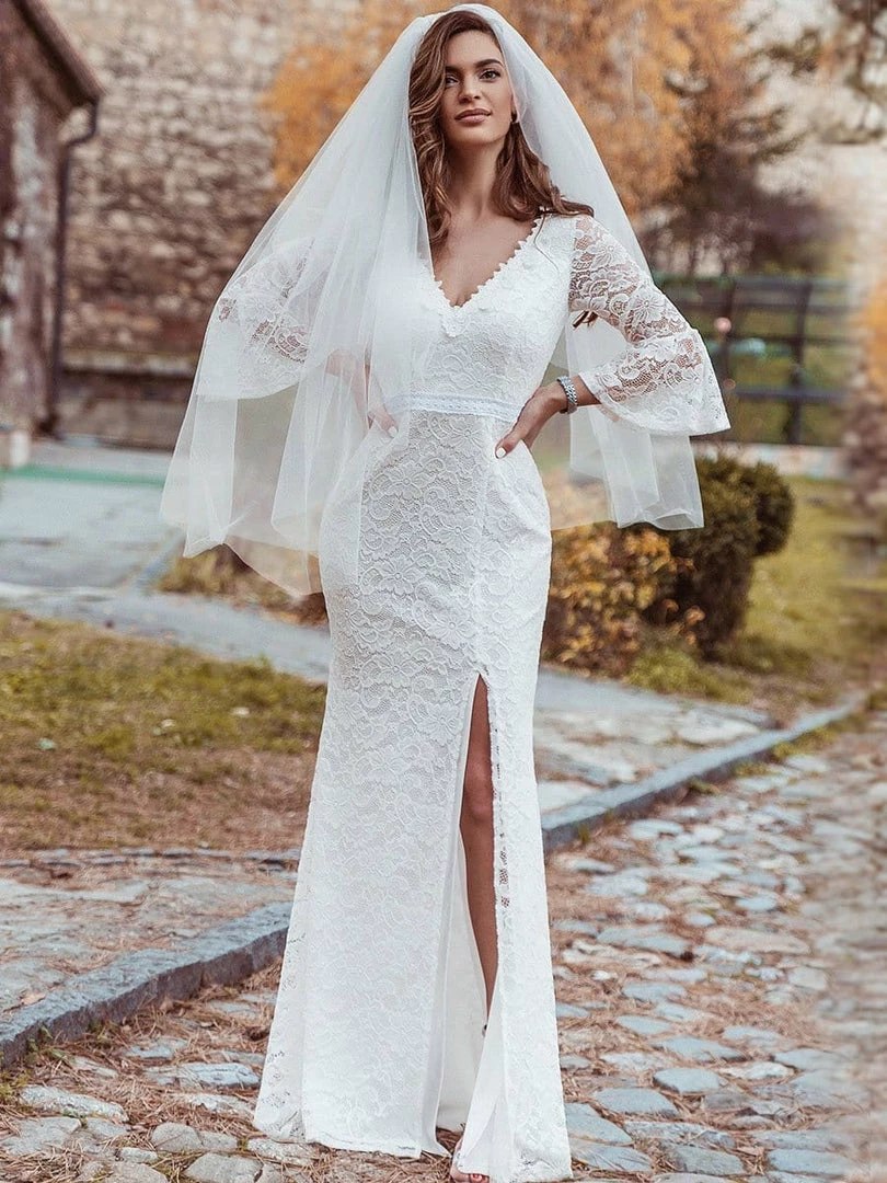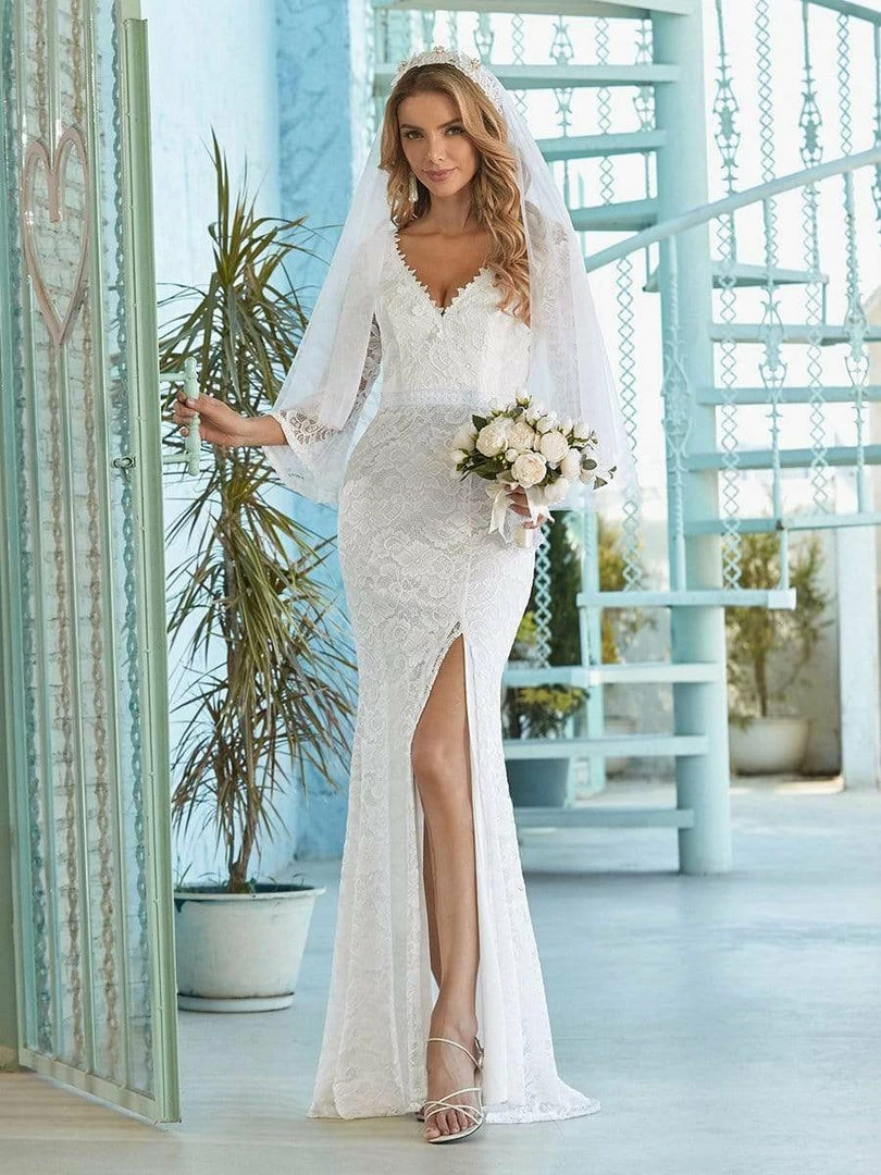 Figure-hugging and flowy, this simple mermaid wedding dress is both casual and sexy. The elastic lace and high split skirt mean the dress is as comfortable as it is beautiful – ideal for the bride who plans to dance all night long at her reception. Trumpet sleeves are a unique and carefree touch, while the fishtail silhouette is perfectly completed by a small, trailing tail.