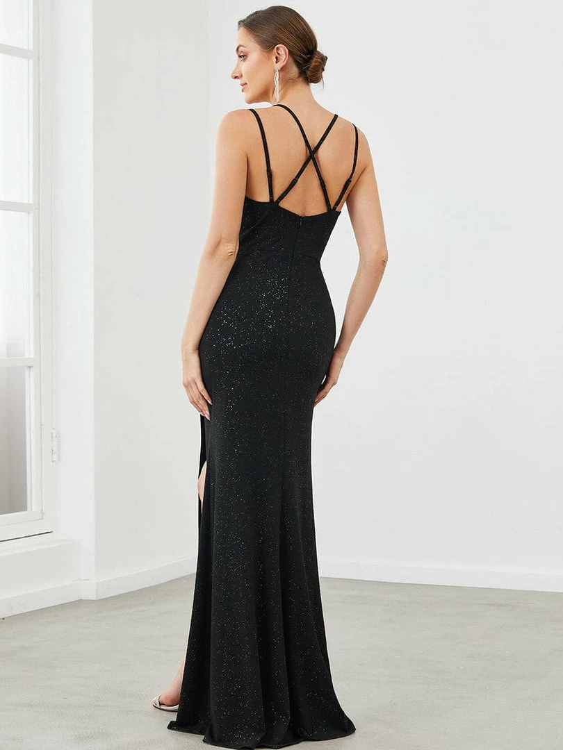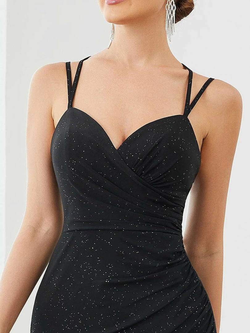 This bodycon evening dress makes a glamorous splash with its all-over pleating accentuating the silhouette with sparkly material and plunging sweetheart neckline. A daring high side slit and cross strappy backless fit finish this sophisticated look. Add metallic or black heels.