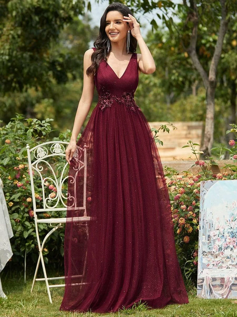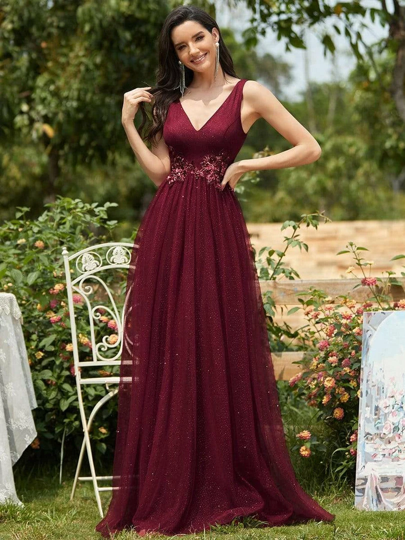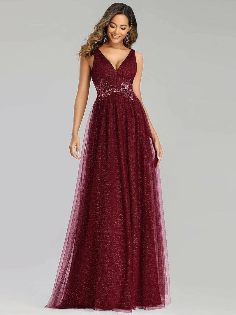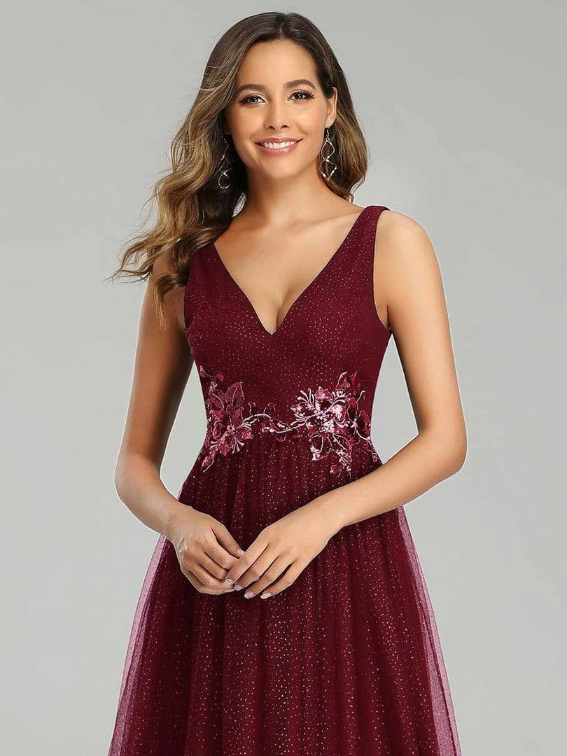 Featuring a sexy double V neckline and a floor length A-line skirt, while the delicate applique decorates the waist to create a figure flattering silhouette, this shimmery evening dress is perfect for any formal occasion! We think this elegant evening dress is perfect for all formal occasions, from evening party, cocktail, weddings to prom, homecoming and graduation!