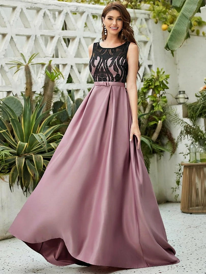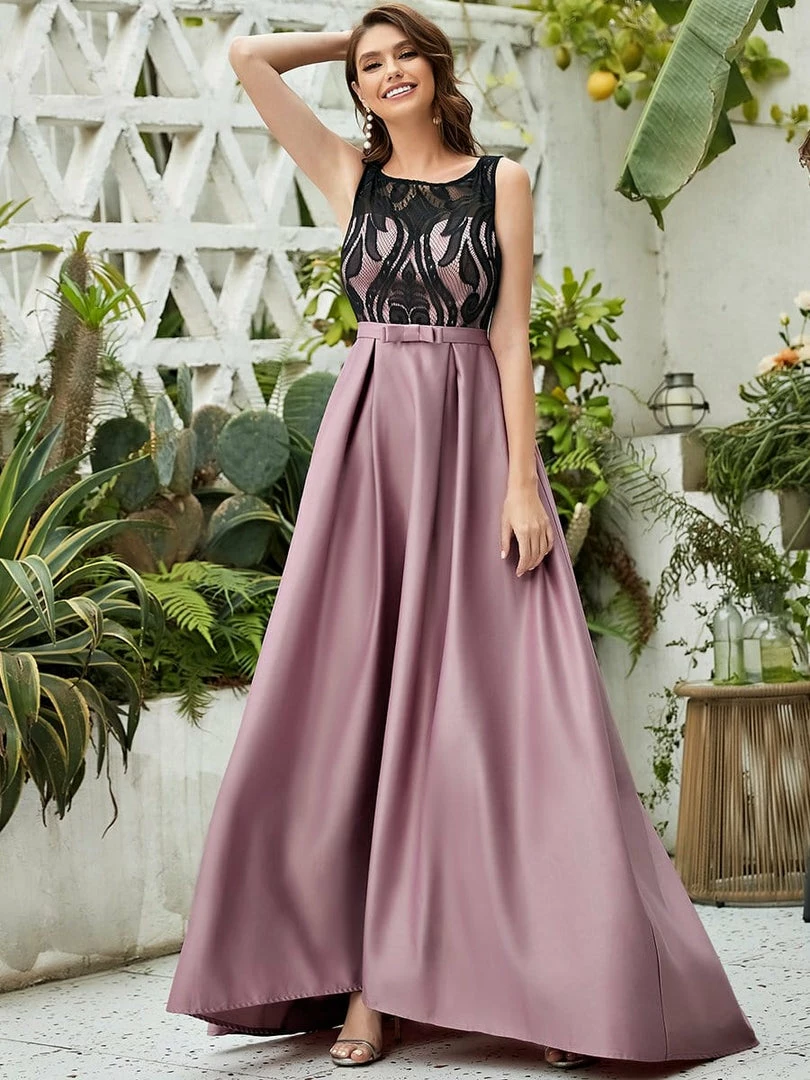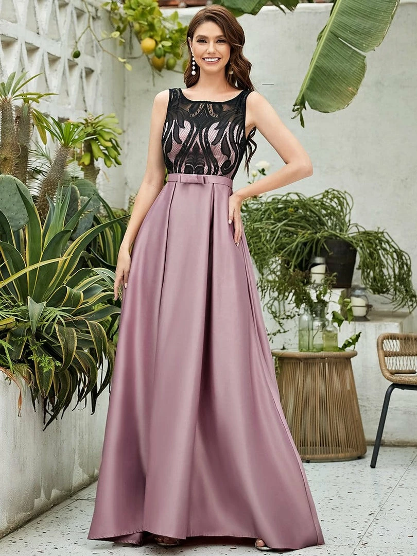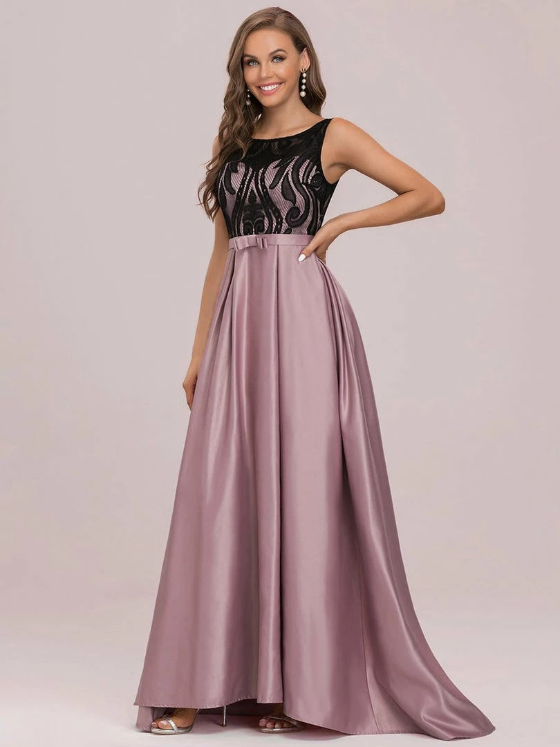 Evening gown with round neckline and sleeveless ready to wear on formal events. The cinched waist detail accentuates the waist and adds a glamorous touch to any occasion or formal event. For a night event, a long tail evening dress is the best combination. Enhance Your Beauty in a luxurious evening dress on special occasions.