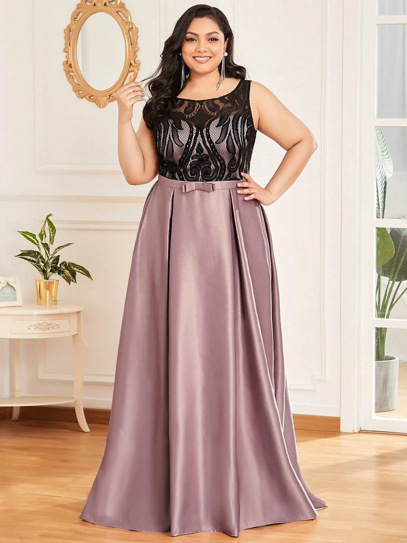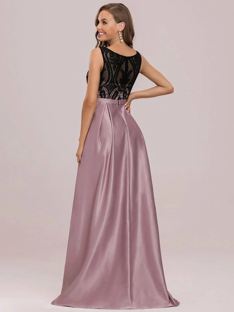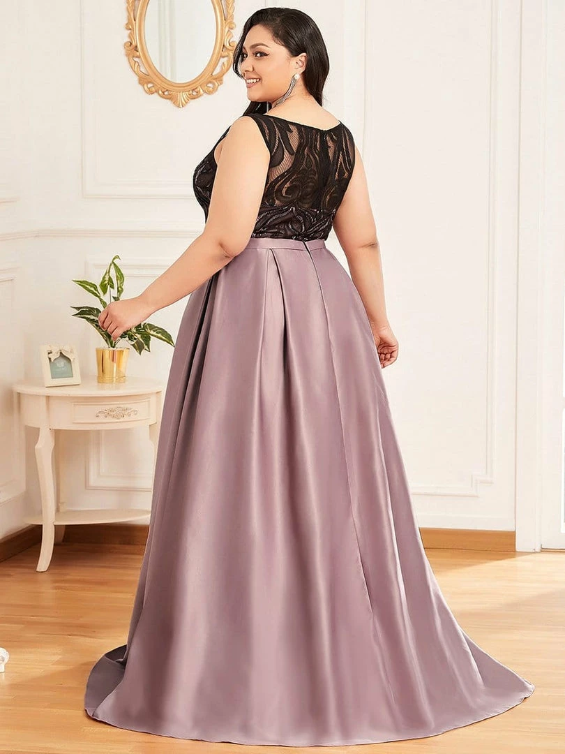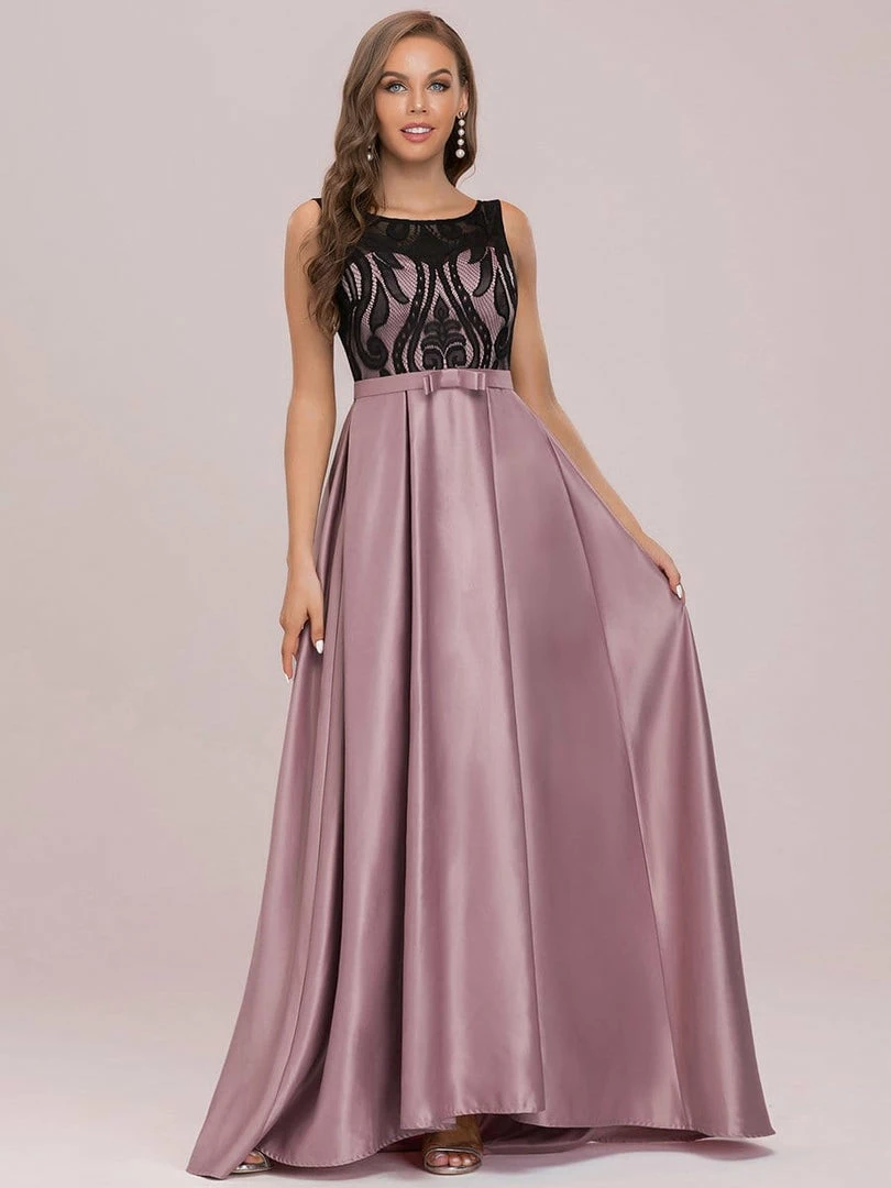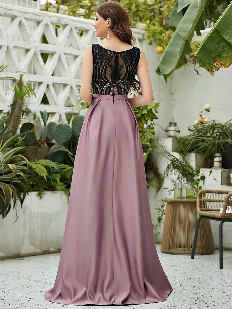 Evening gown with round neckline and sleeveless ready to wear on formal events. The cinched waist detail accentuates the waist and adds a glamorous touch to any occasion or formal event. For a night event, a long tail evening dress is the best combination. Enhance Your Beauty in a luxurious evening dress on special occasions.