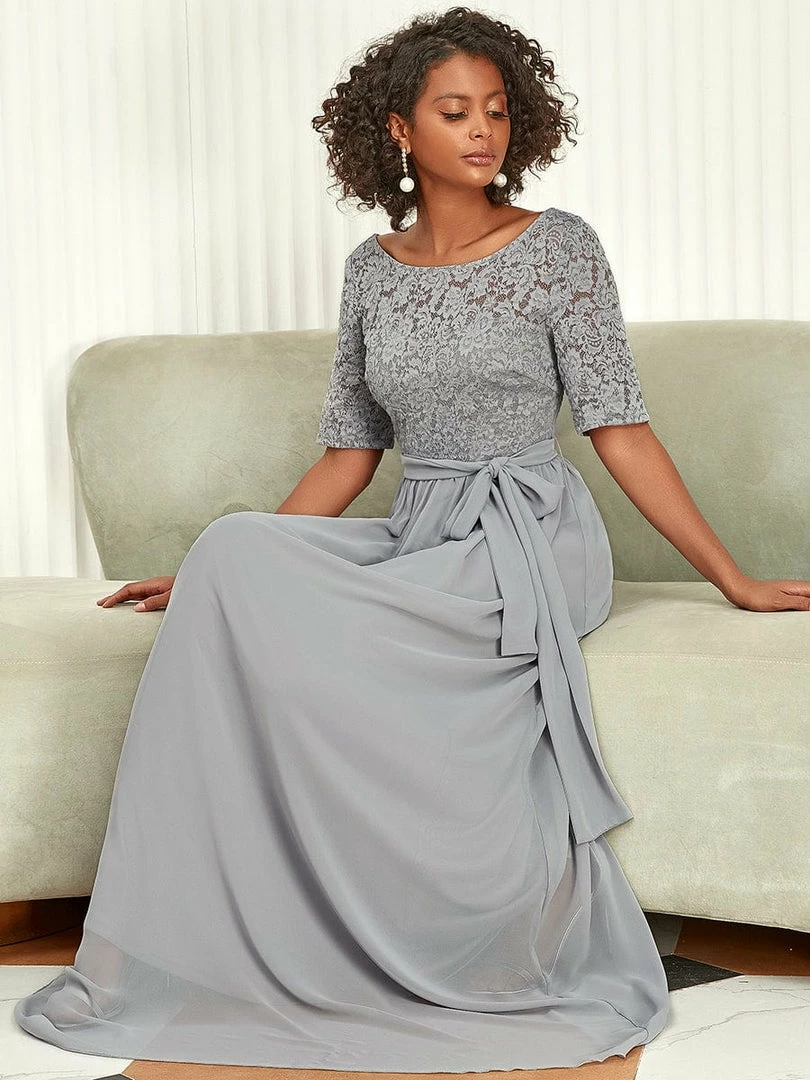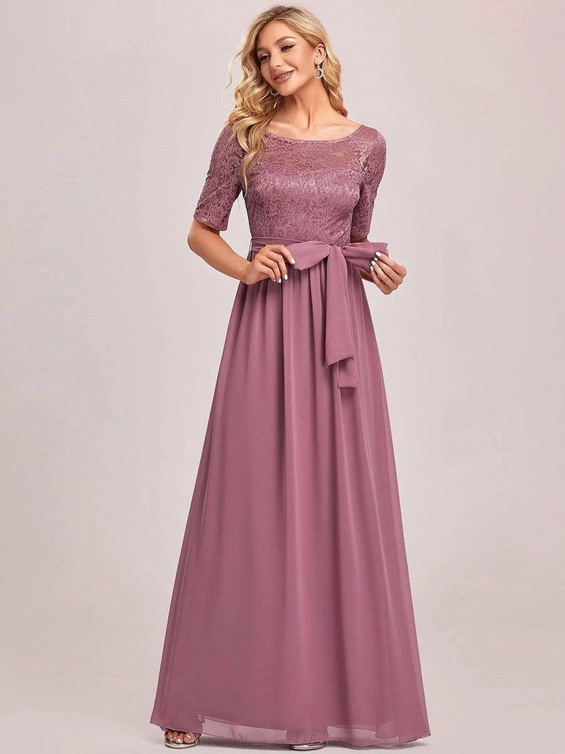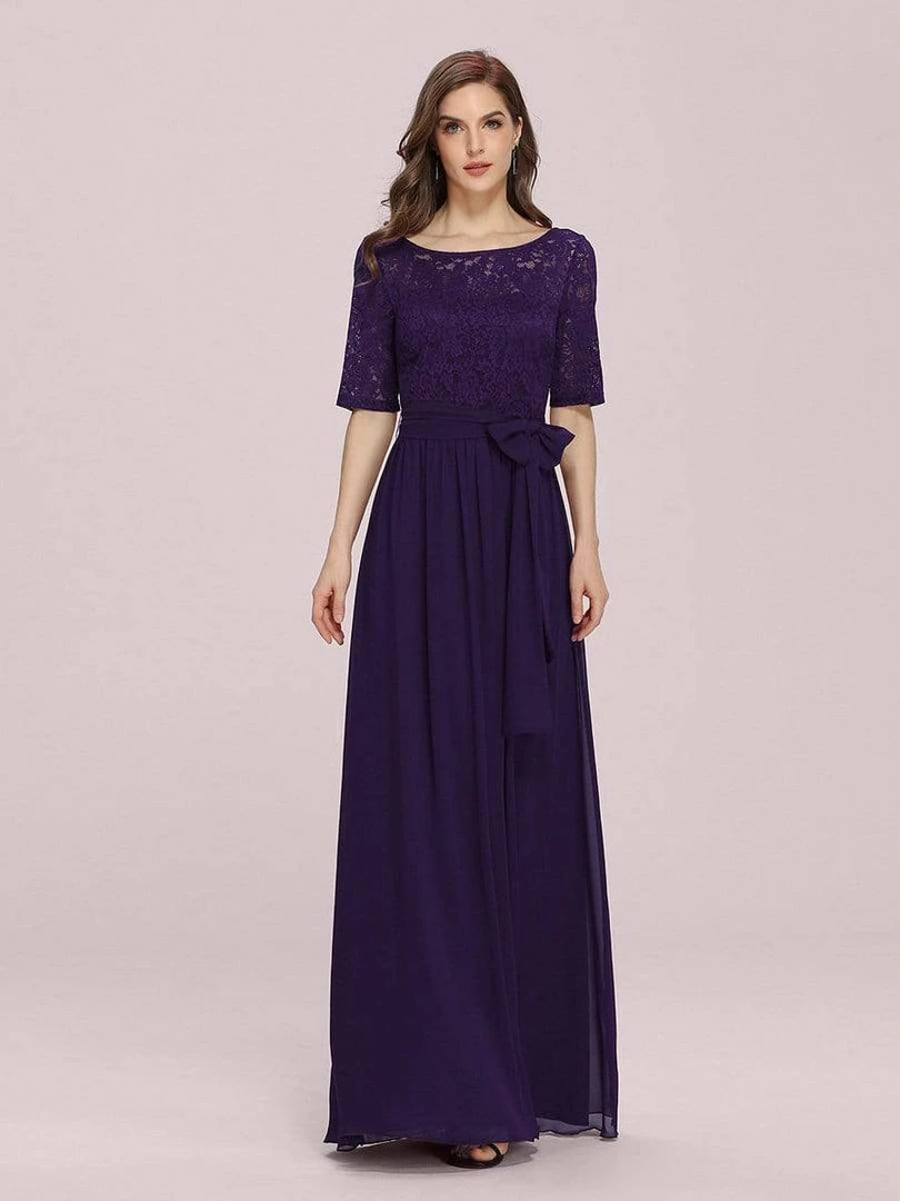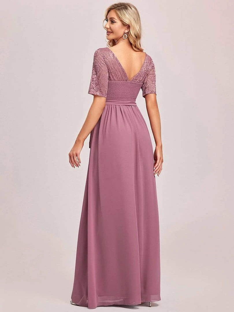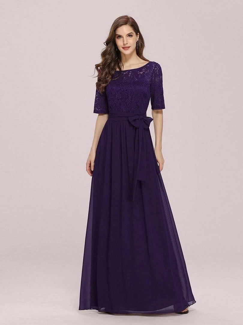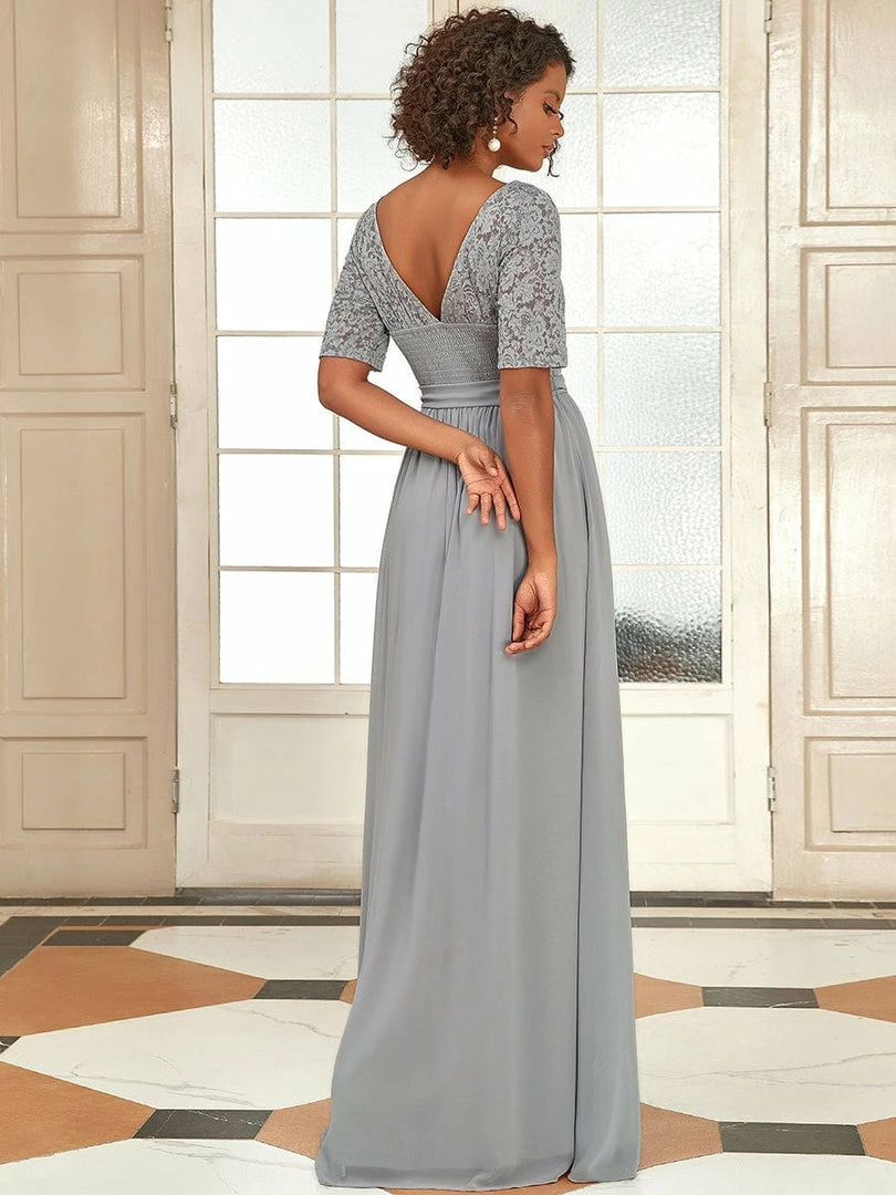 The romantic vibe of this floor-length lace evening dress with sleeves makes you give out a swooning sigh. The evening dress with sleeves exudes Hollywood glamour with its see-through lace design on the top part and on the half sleeves. The classy flowy skirt makes it ideal to be adorned by mature women. The distinct deep V back design takes this evening dress to another level of gorgeousness. Wear this elegant evening gown with sleeves at a wedding or for any formal event.