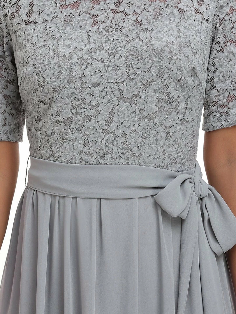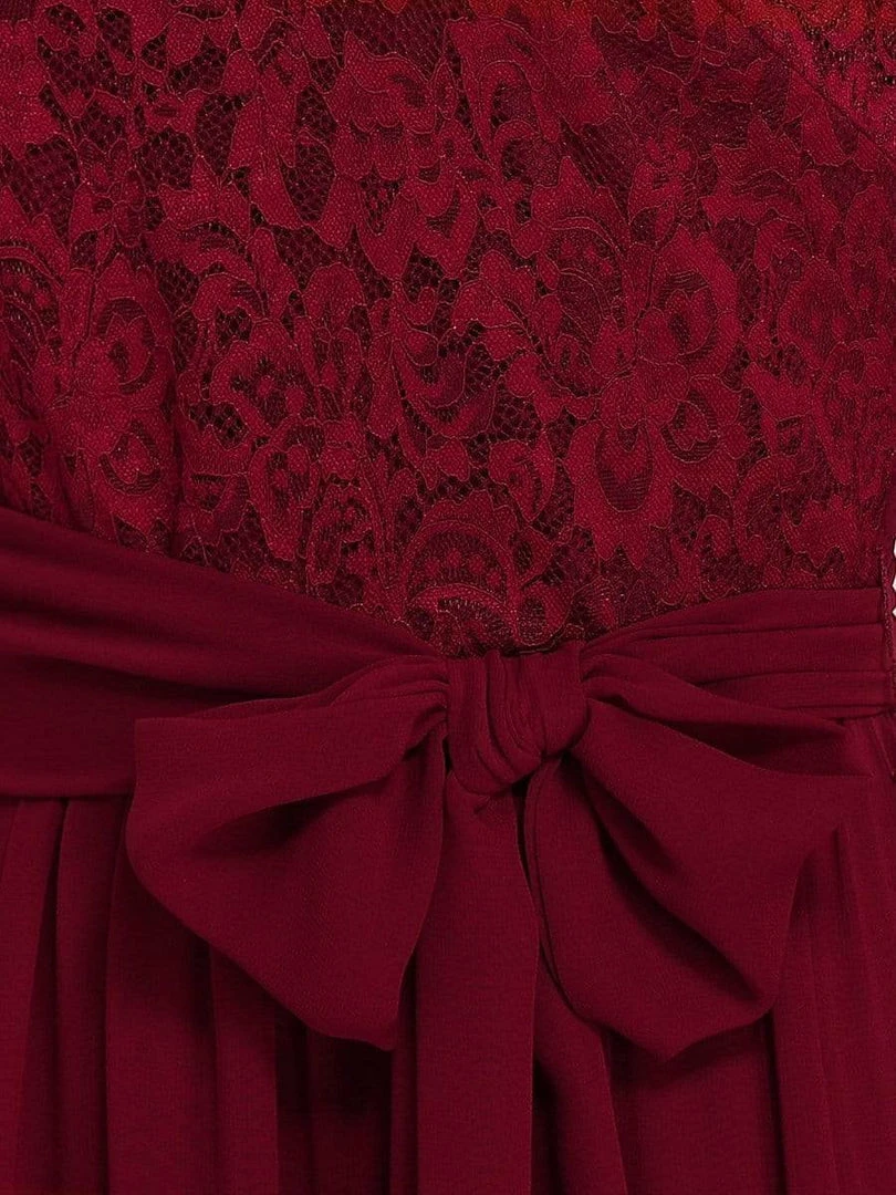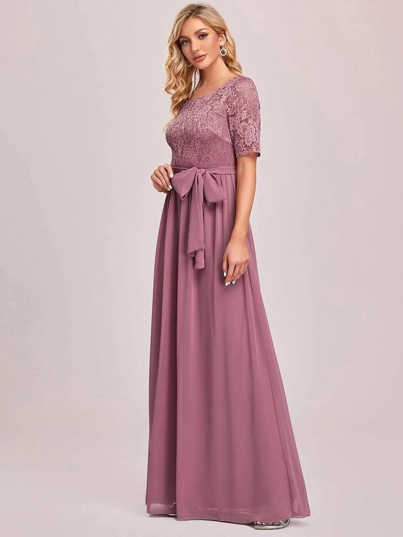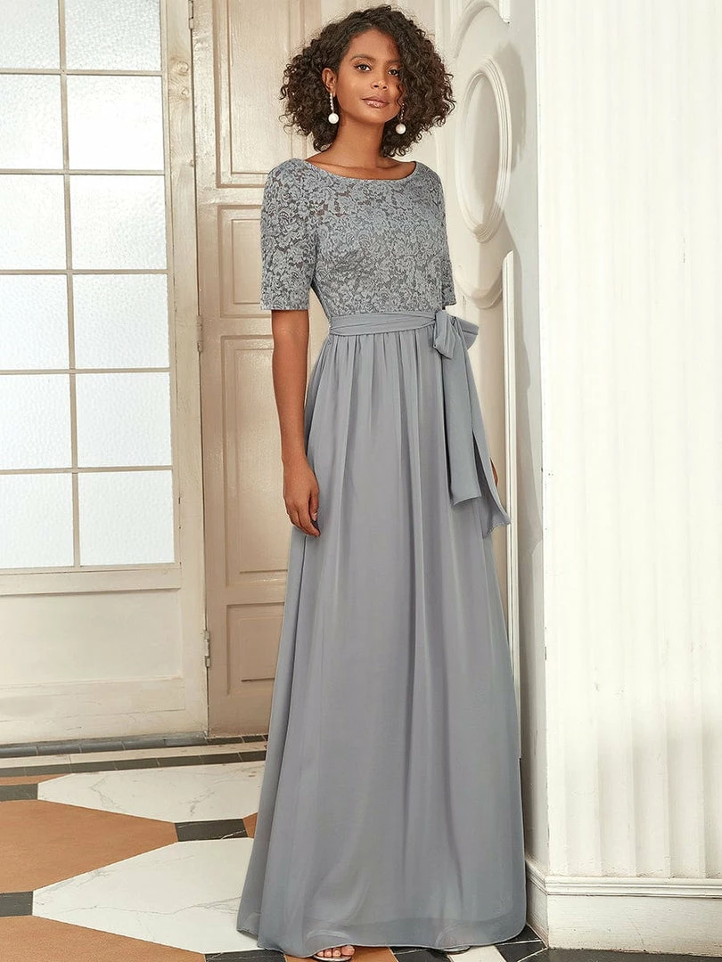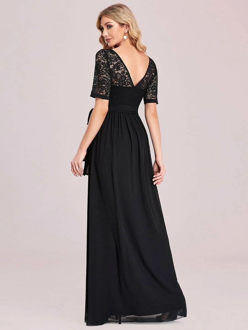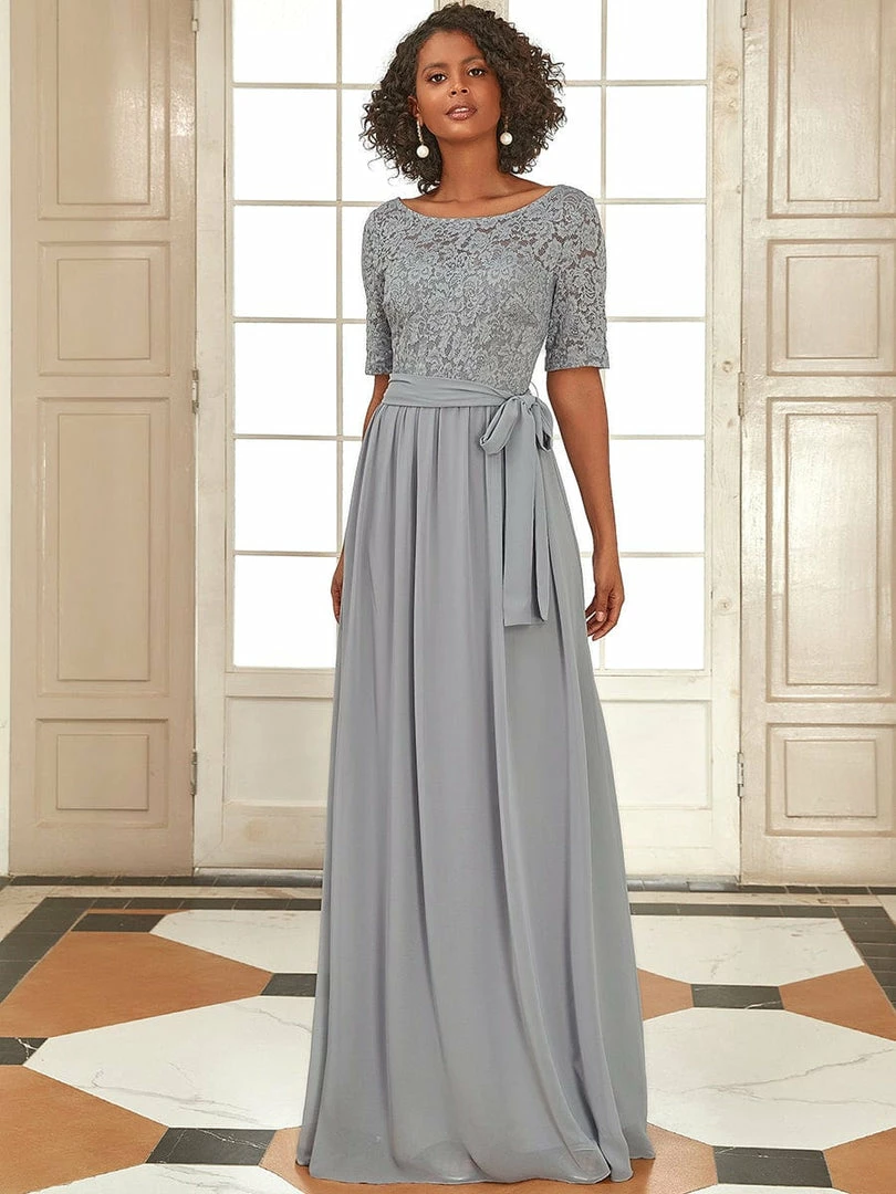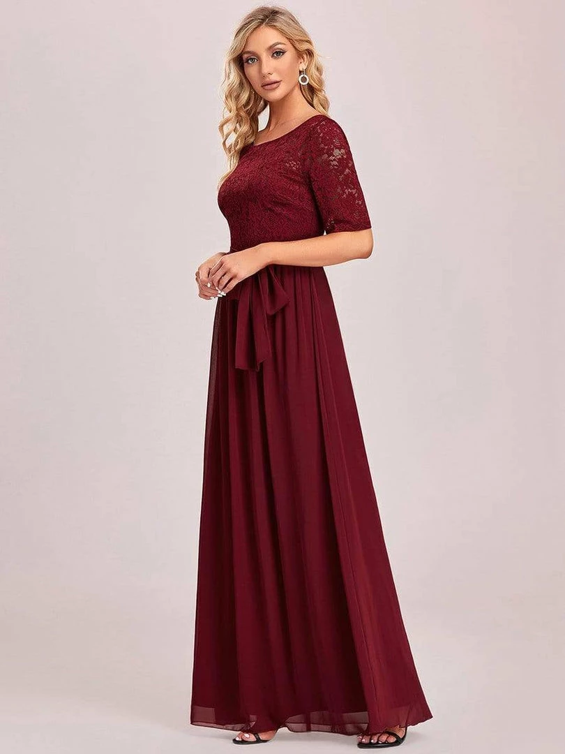 The romantic vibe of this floor-length lace evening dress with sleeves makes you give out a swooning sigh. The evening dress with sleeves exudes Hollywood glamour with its see-through lace design on the top part and on the half sleeves. The classy flowy skirt makes it ideal to be adorned by mature women. The distinct deep V back design takes this evening dress to another level of gorgeousness. Wear this elegant evening gown with sleeves at a wedding or for any formal event.