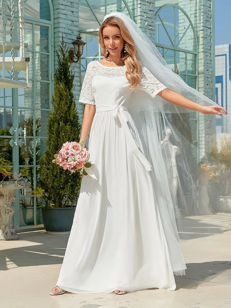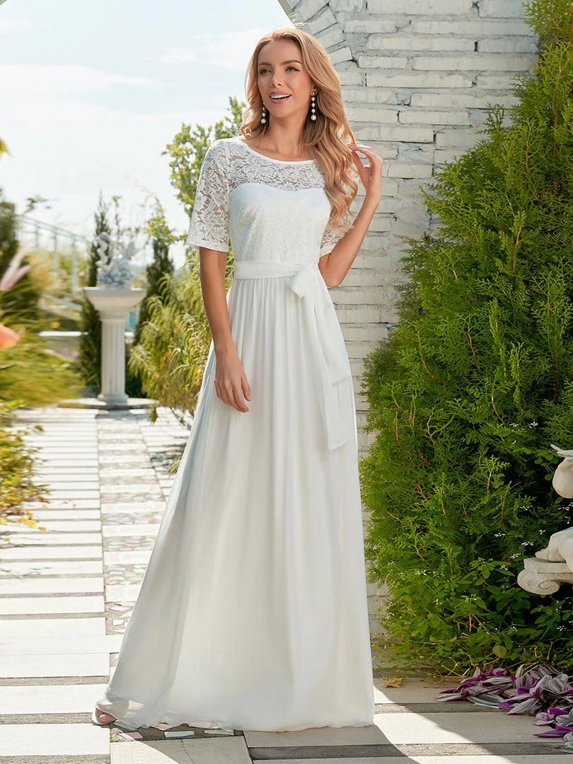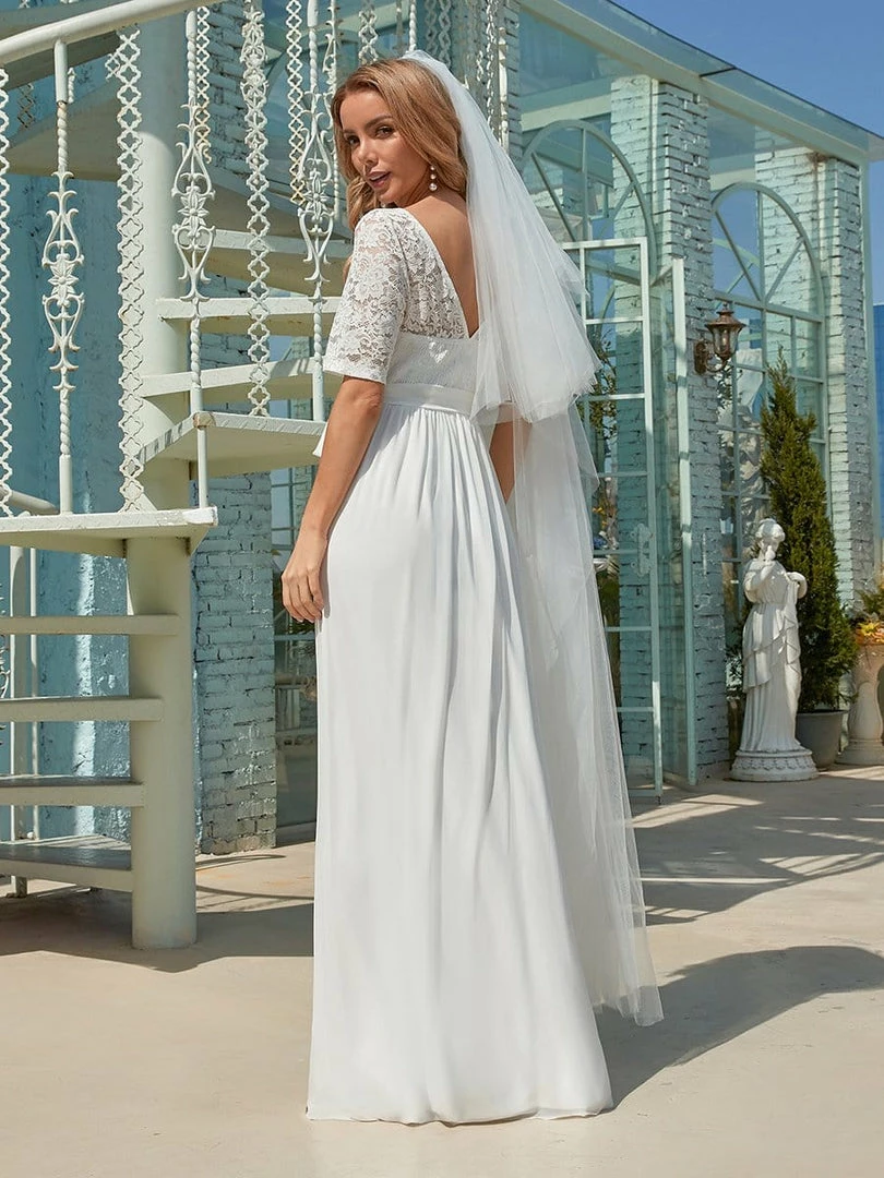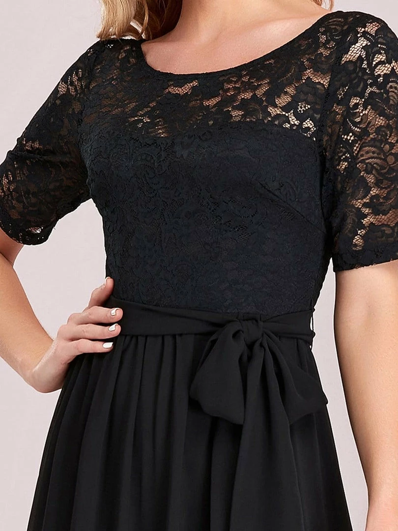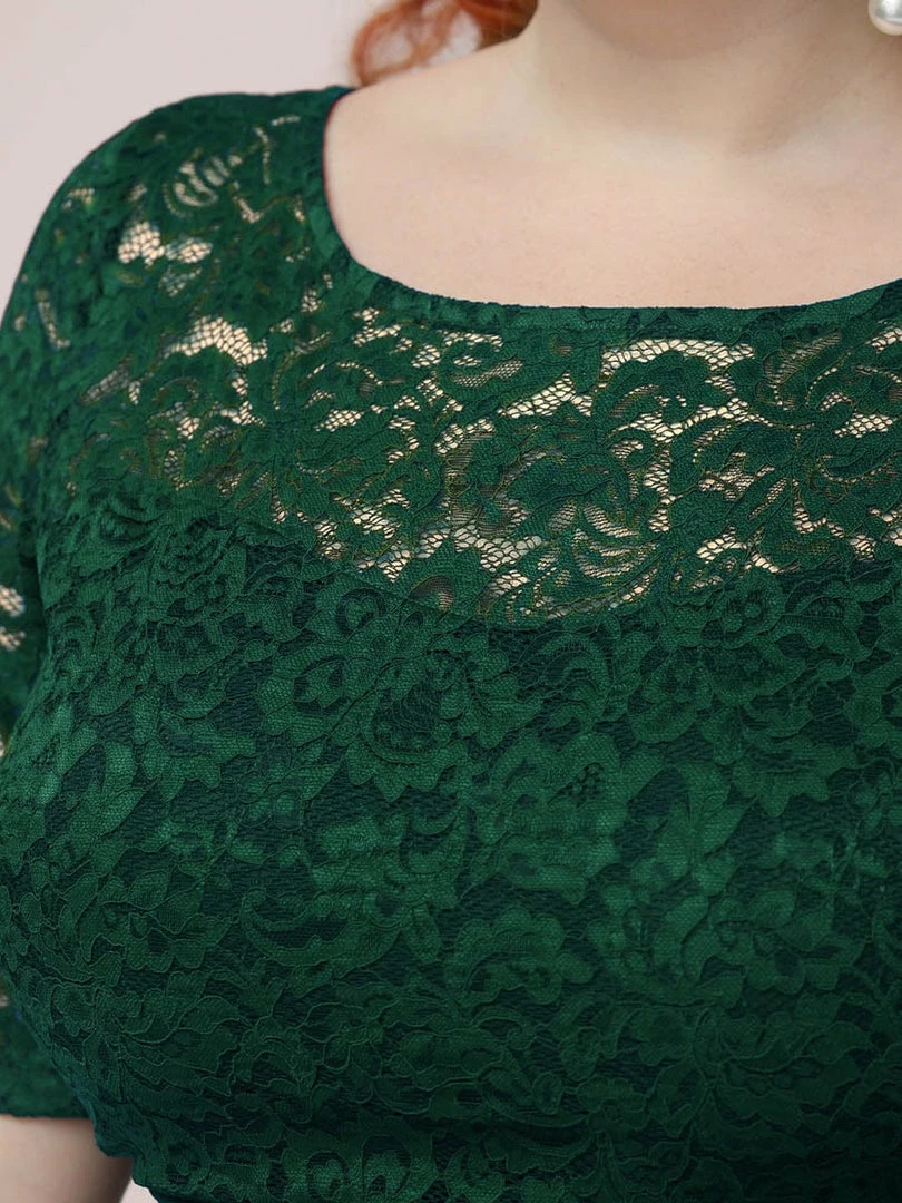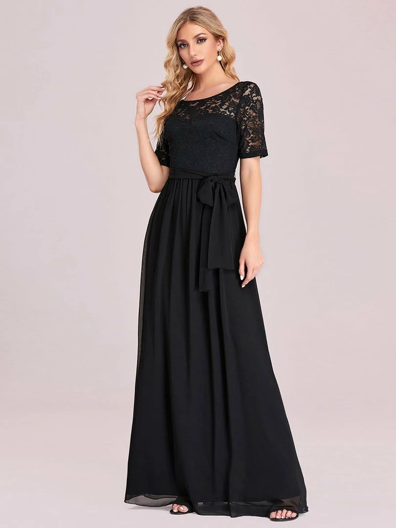 The romantic vibe of this floor-length lace evening dress with sleeves makes you give out a swooning sigh. The evening dress with sleeves exudes Hollywood glamour with its see-through lace design on the top part and on the half sleeves. The classy flowy skirt makes it ideal to be adorned by mature women. The distinct deep V back design takes this evening dress to another level of gorgeousness. Wear this elegant evening gown with sleeves at a wedding or for any formal event.