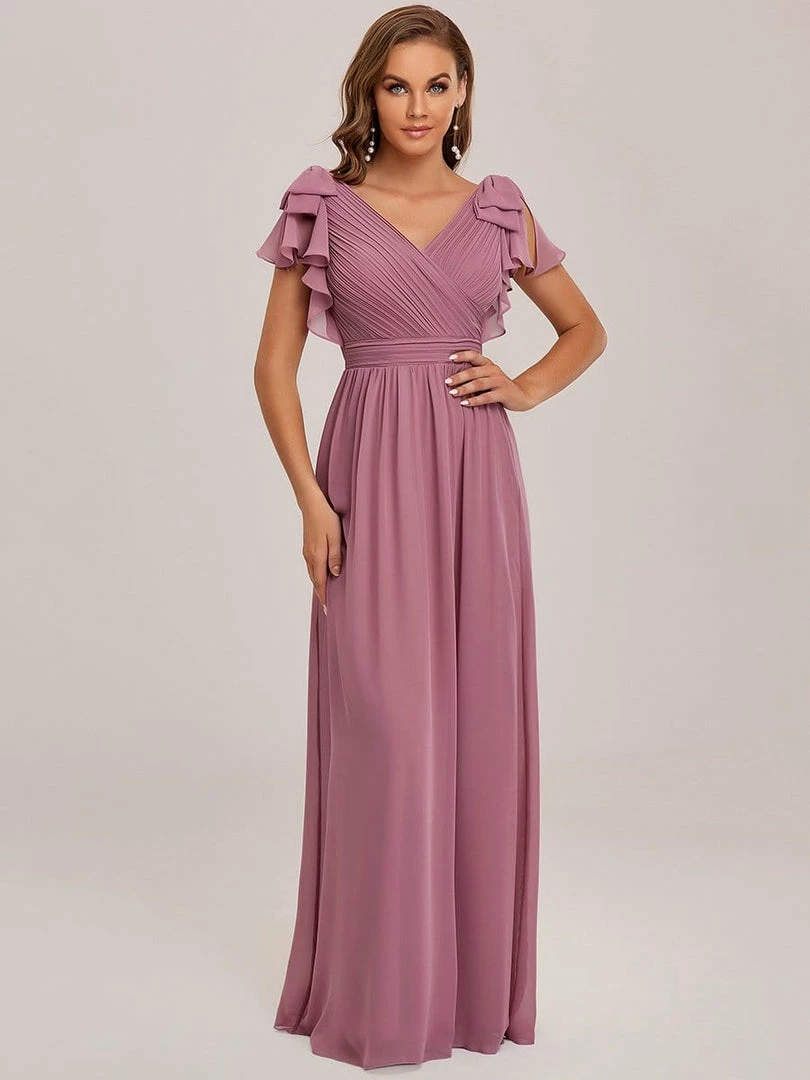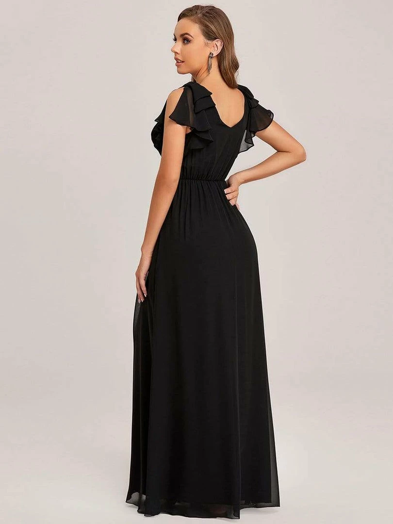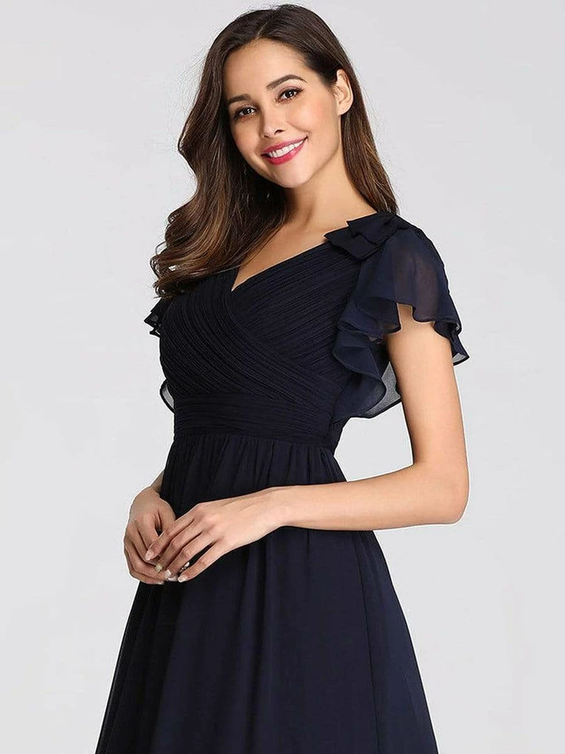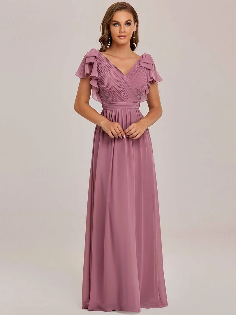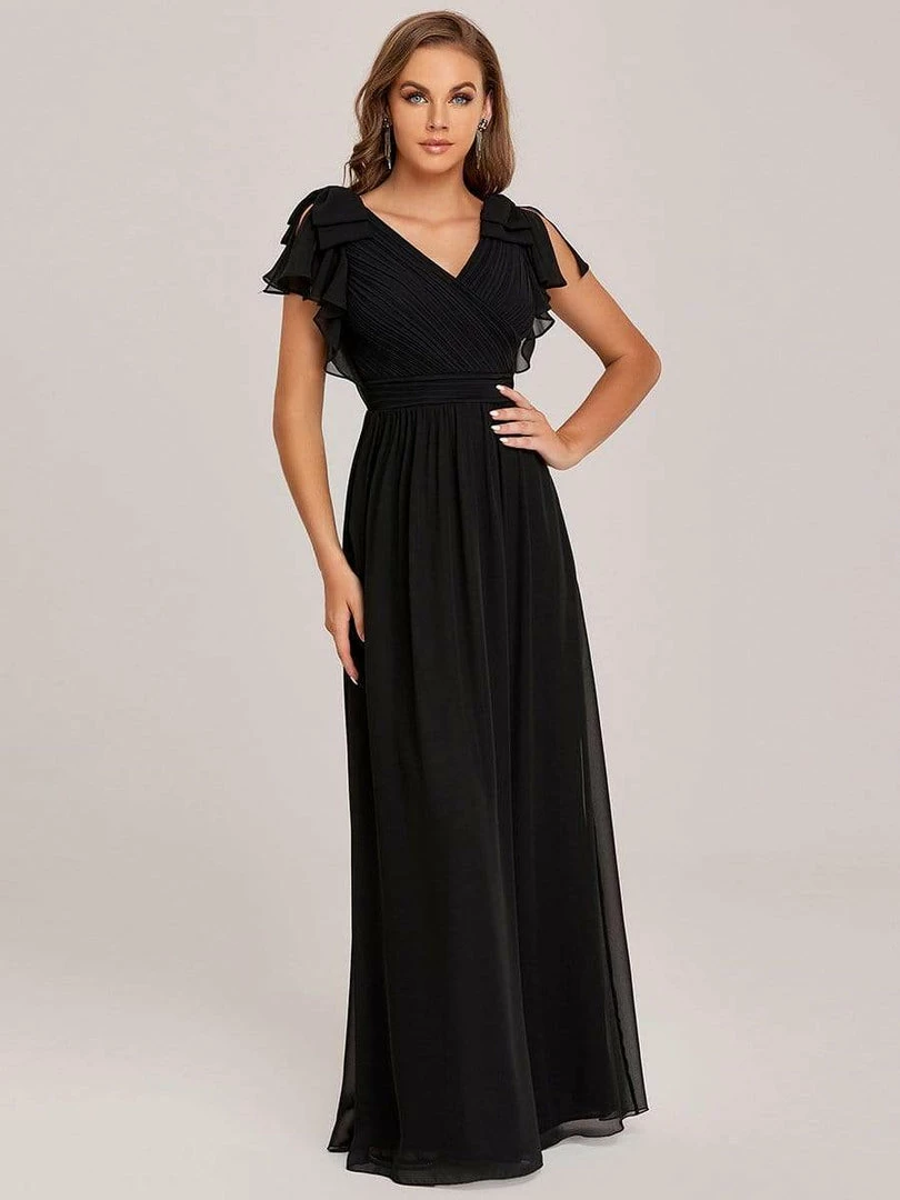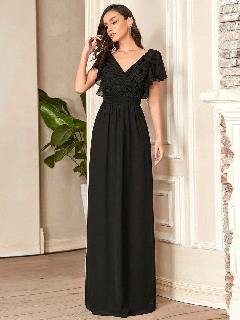 Elegant floor length chiffon evening dress with ruffle sleeves and a deep V neckline. Delicate ruching in the bust and waist creates a figure-flattering silhouette. We think this gorgeous chiffon ruffle evening dress with long sleeves is perfect for evening party,cocktail,prom,homecoming,graduation,weddings,and any other formal affair!